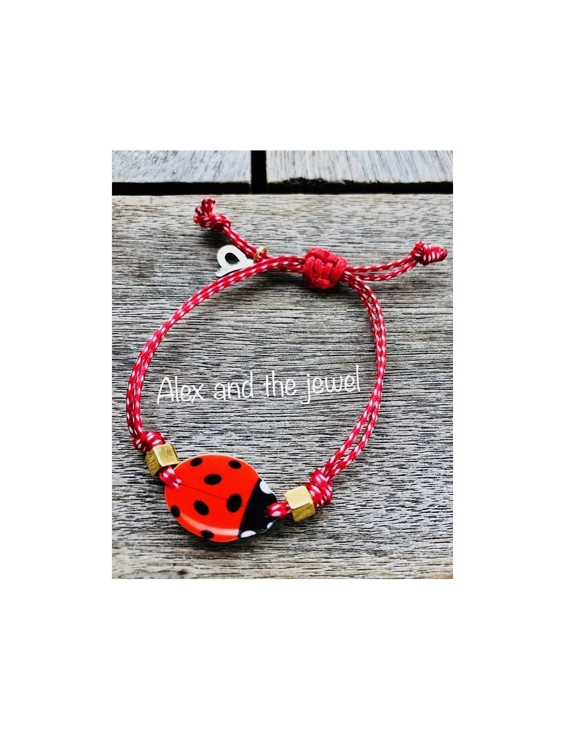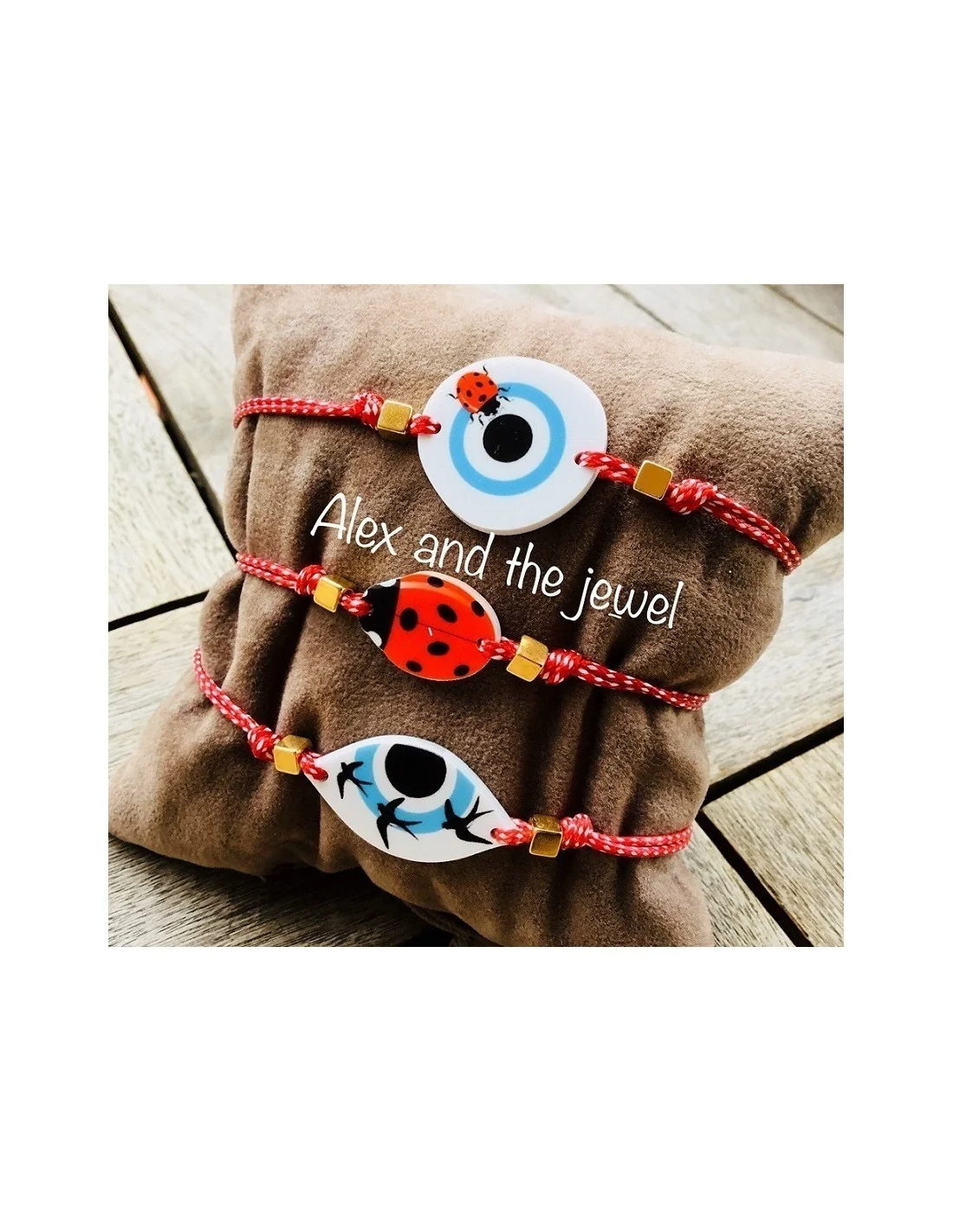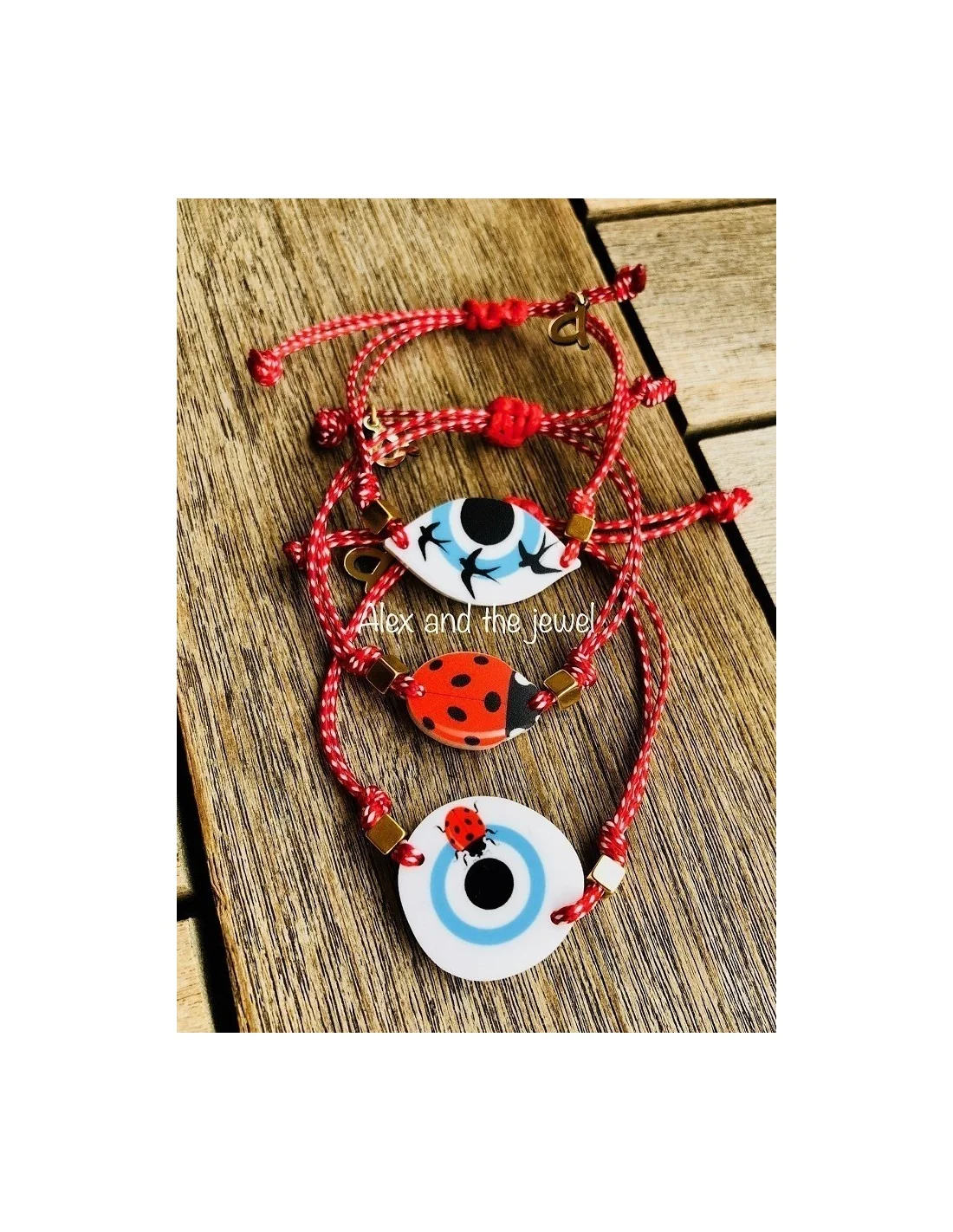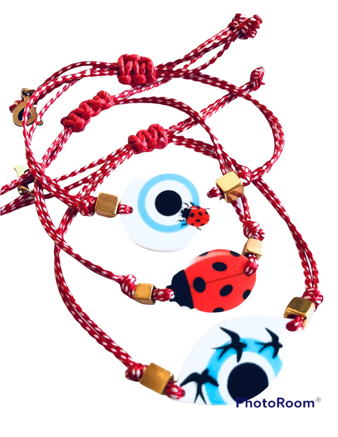 Βραχιόλι "Μάρτης" με ακρυλικό στοιχείο σε 3 σχέδια δεμένο σε δίχρωμο κορδόνι με επίχρυσους διακοσμητικούς κύβους και αυξομείωση μακραμέ.