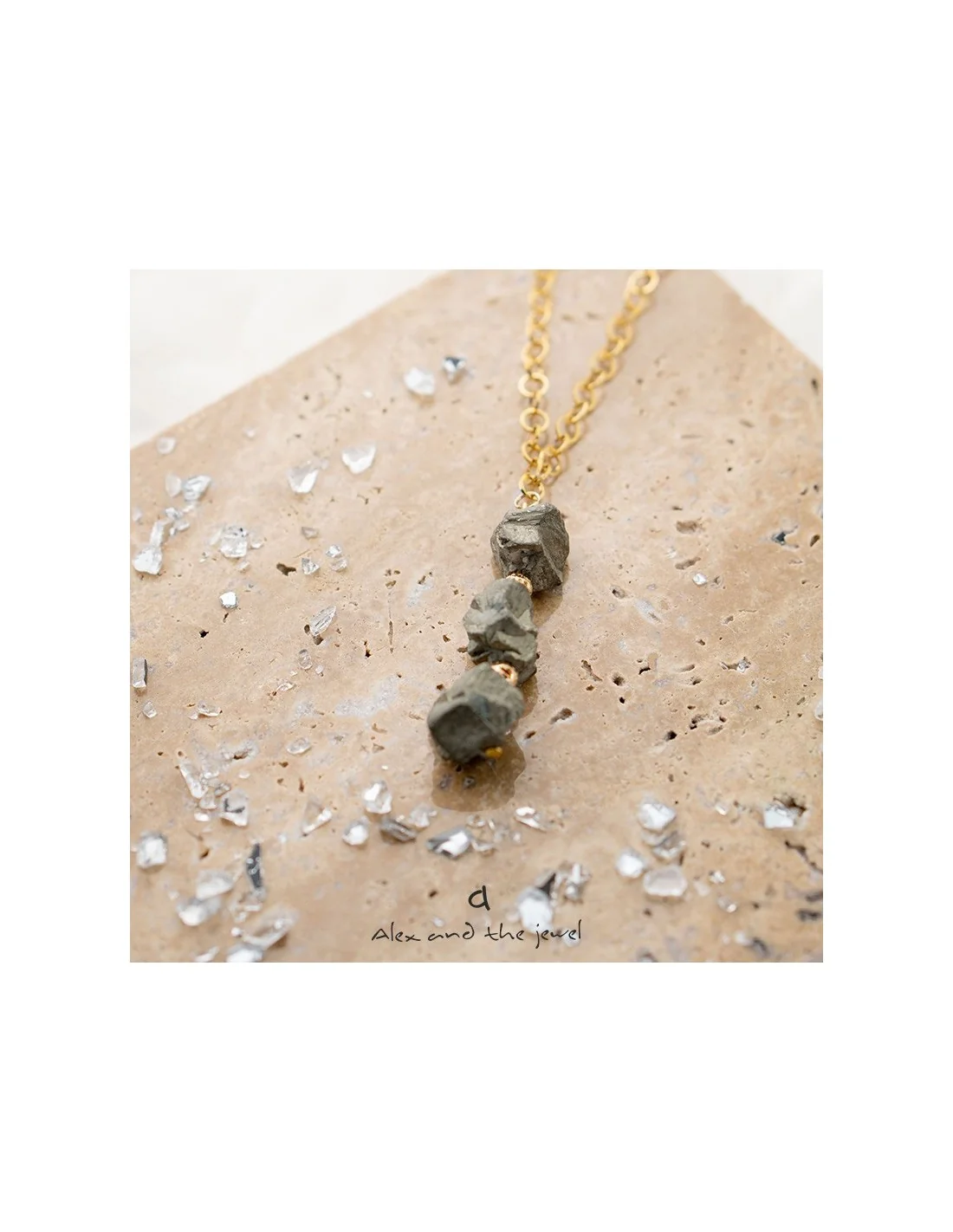 Το κολιέ διαθέτει πέτρες Σιδηροπυρίτη, οι οποίες προσθέτουν βάθος και χαρακτήρα στην εμφάνισή σας, ενώ η αλυσίδα από ατσάλι εξασφαλίζει αντοχή και κομψότητα.