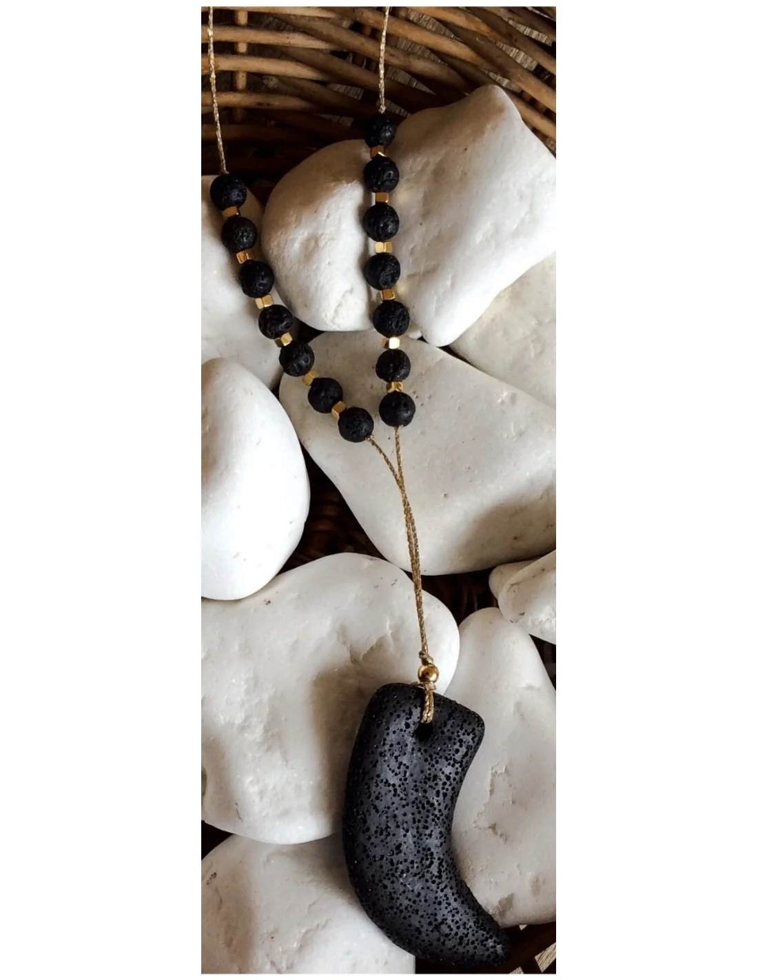 Χειροποίητο γυναικείο κολιέ με κρεμαστό στοιχείο σε σχέδιο δόντι από ορυκτή λάβα σε λευκό ή μαύρο, δεμένο σε χρυσό ή χρυσό μαύρο κορδόνι, διακοσμημένο με πέτρες λάβας σε μαύρο χρώμα και επίχρυσα κυβάκια.
