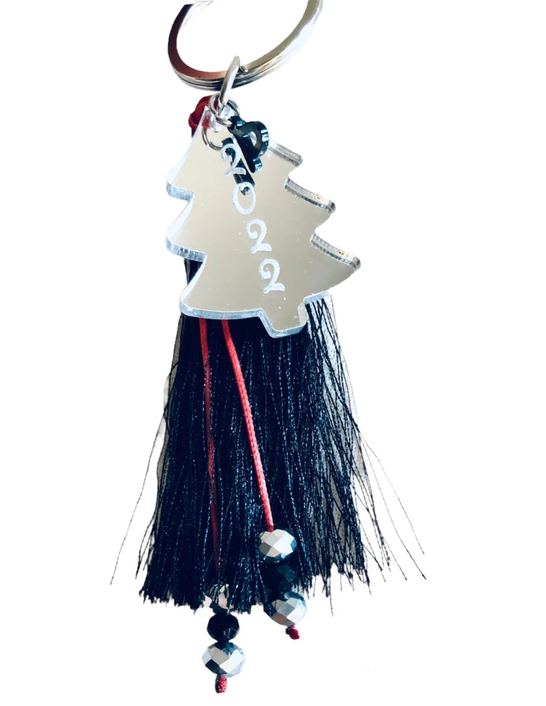 Χειροποίητο μπρελόκ γούρι με ασημί ατσάλινο κρίκο, κρεμαστό στοιχείο δεντράκι από plexiglass καθρέφτη με χαραγμένο το 2022, μαύρη μεταξωτή φούντα και διακοσμητικά κόκκινα κορδονάκια με κρύσταλλα Τσεχίας.