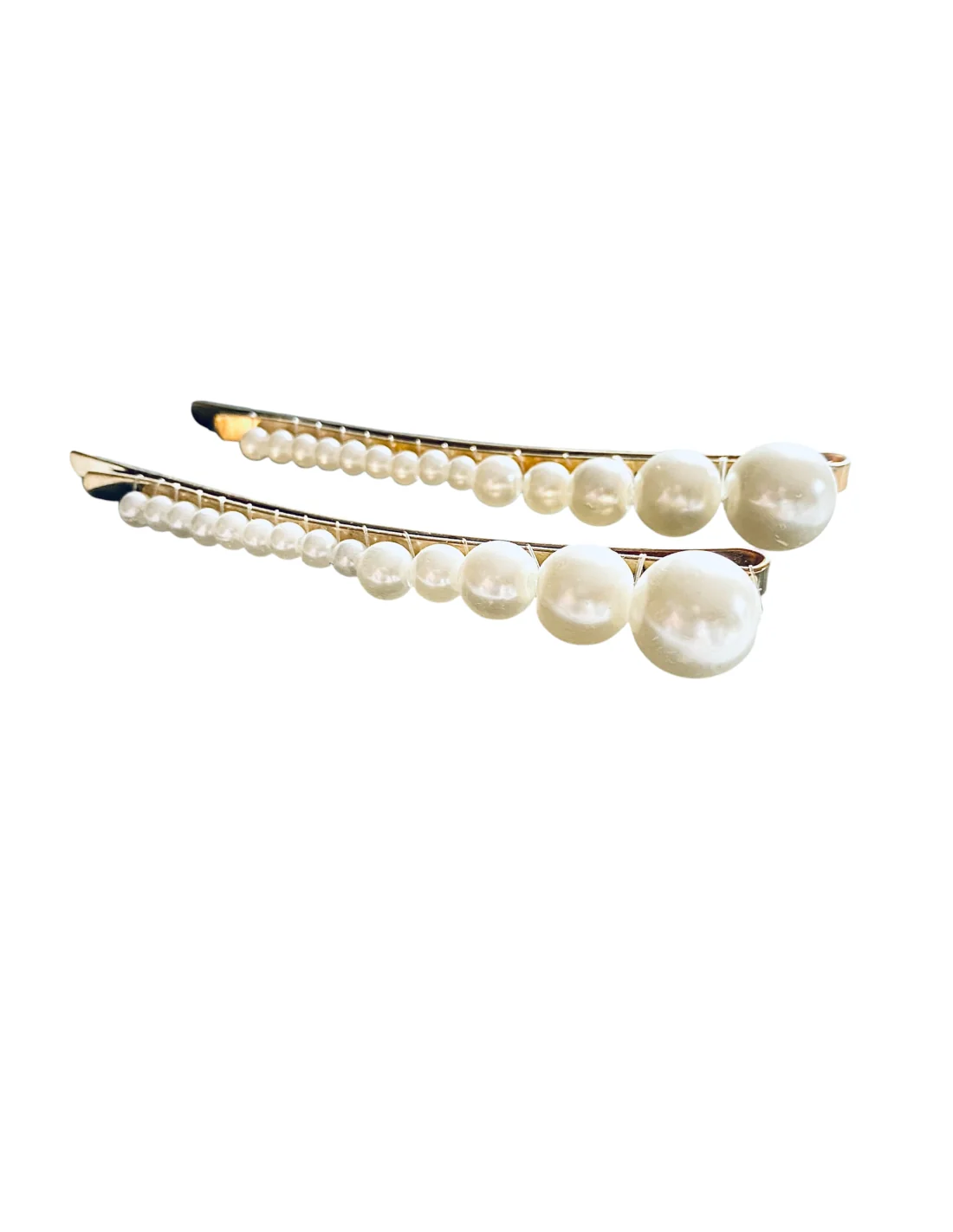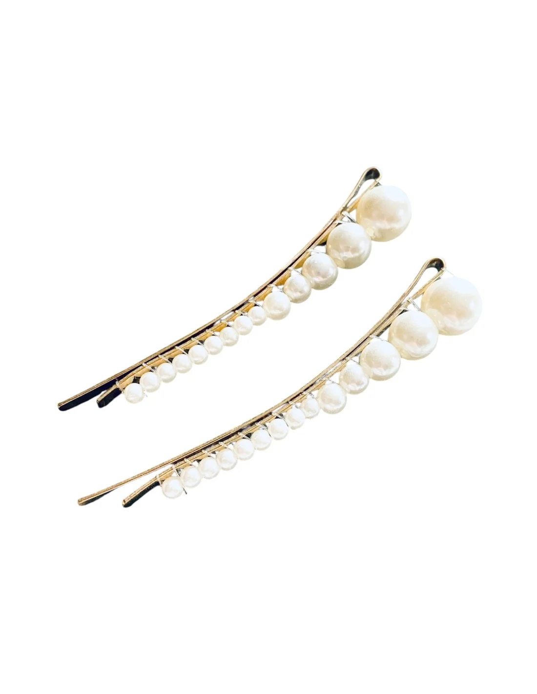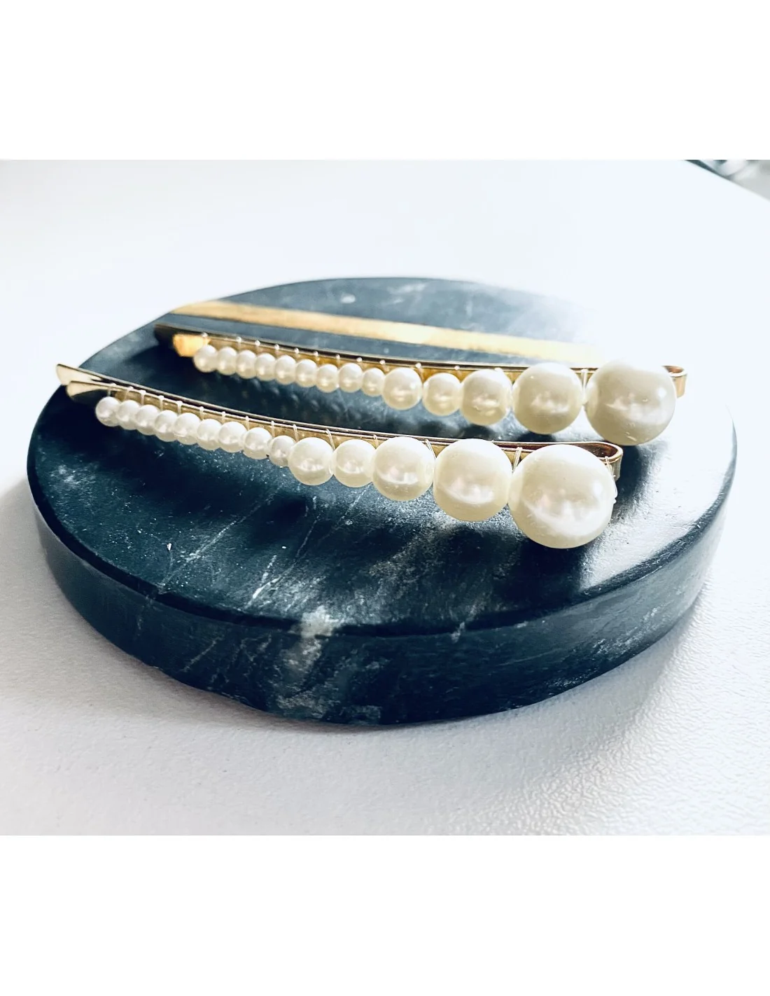 Σετ με δύο fashion hair clip για τα μαλλιά, διακοσμημένα με πέρλες διαφορετικού μεγέθους σε λευκό χρώμα.