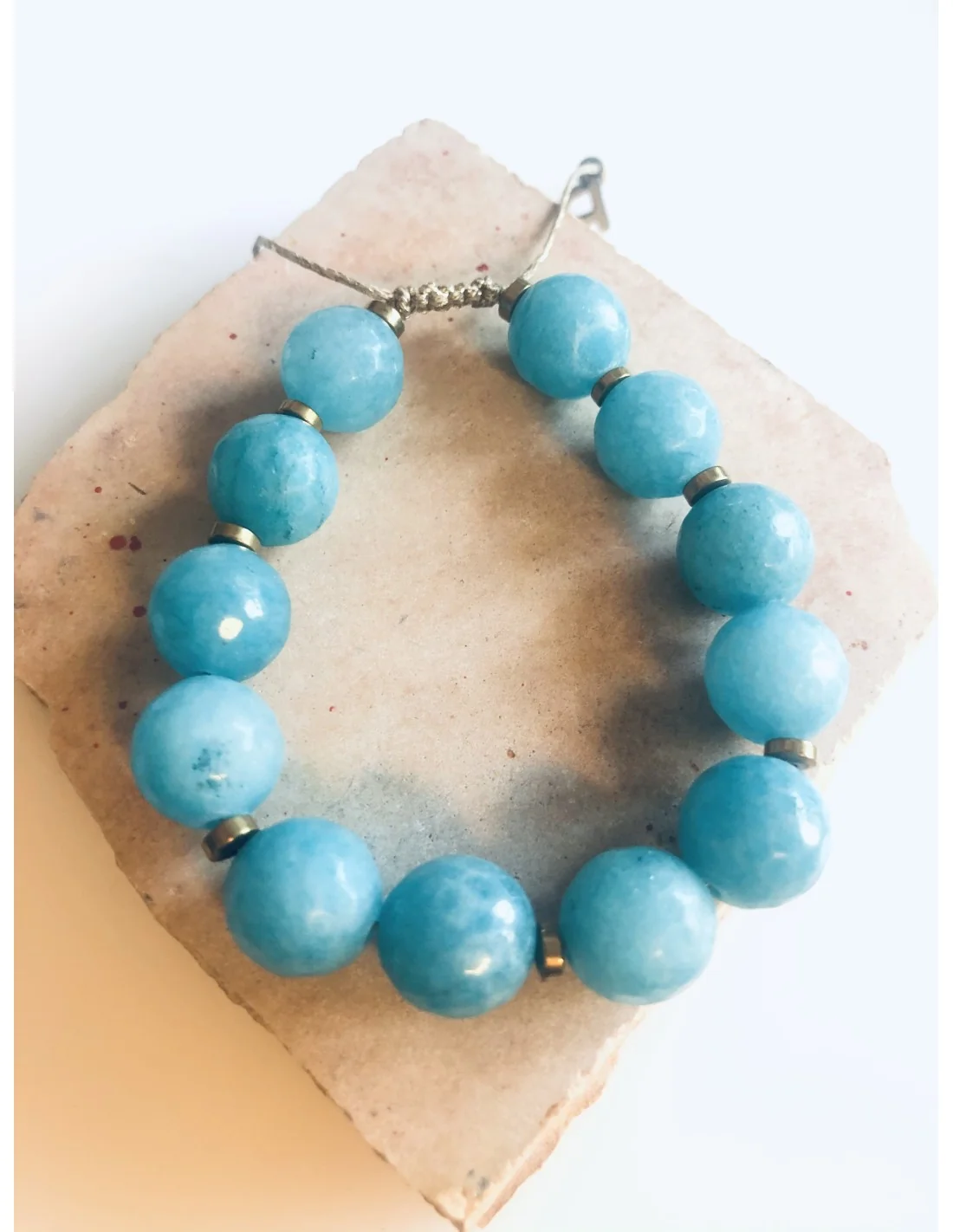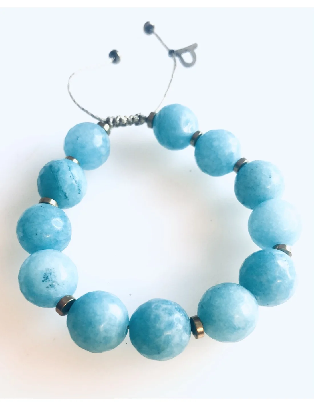 Το χειροποίητο βραχιόλι "Aria" ξεχωρίζει για τη φωτεινή γαλάζια απόχρωση των ημιπολύτιμων πετρών Αχάτη που συμβολίζουν την ηρεμία και την ισορροπία, σε συνδυασμό με την κομψότητα του Αιματίτη.