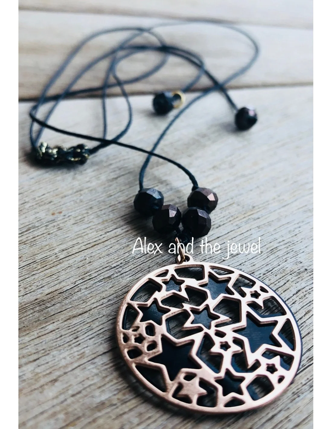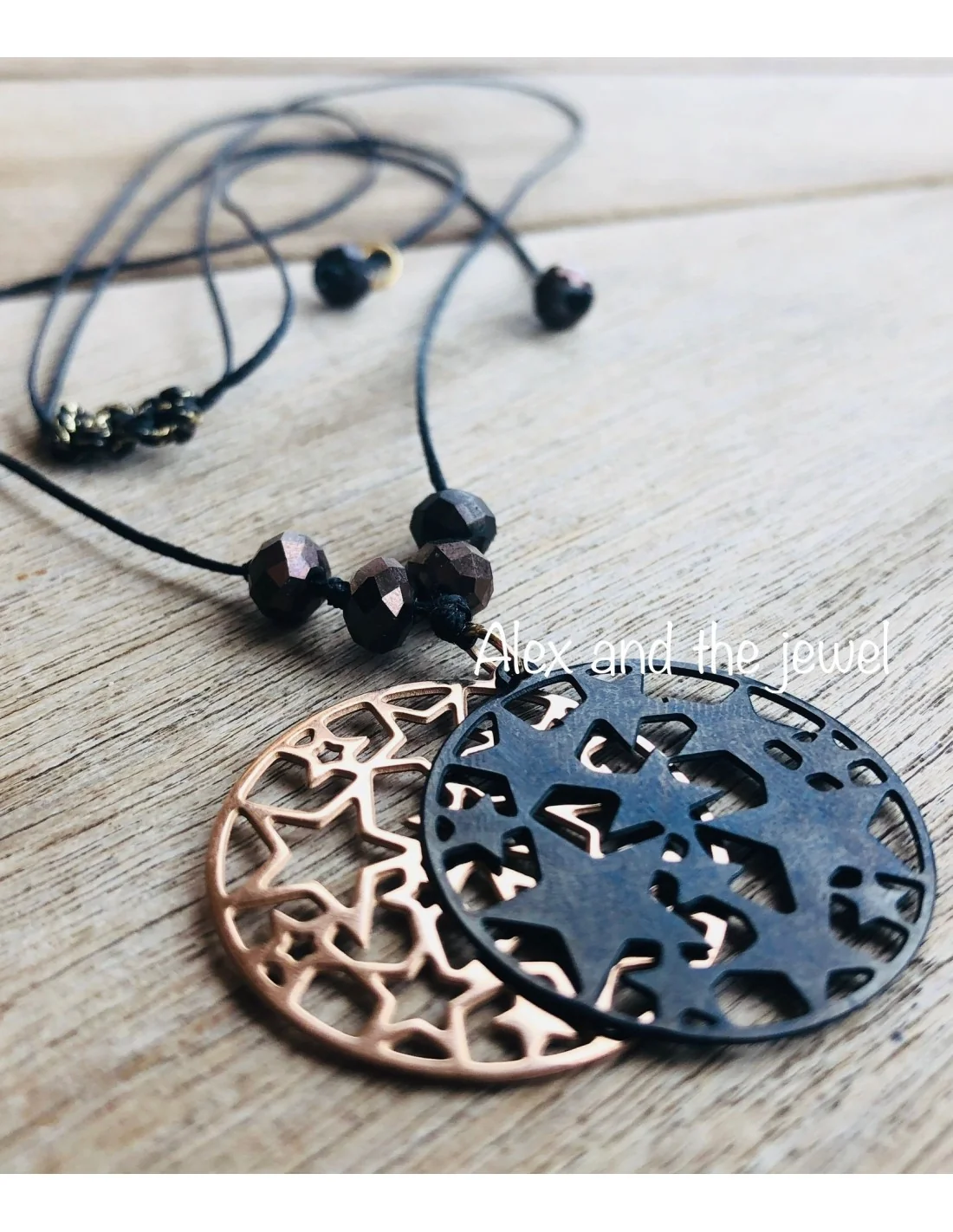 Αυτό το χειροποίητο γυναικείο κολιέ διαθέτει ένα εντυπωσιακό στρογγυλό, κρεμαστό στοιχείο από ατσάλι σε ροζ χρυσό και μαύρο, που προσδίδει μία μοντέρνα και κομψή αίσθηση.