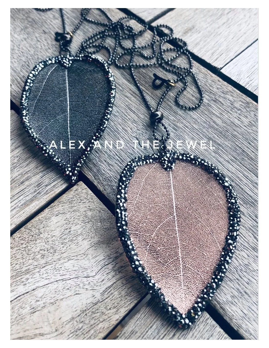 Χειροποίητο γυναικείο κόσμημα κολιέ με επεξεργασμένο φυσικό φύλλο σε ροζ χρυσό ή γκρι με πέτρες μαρκασίτη Leaves
