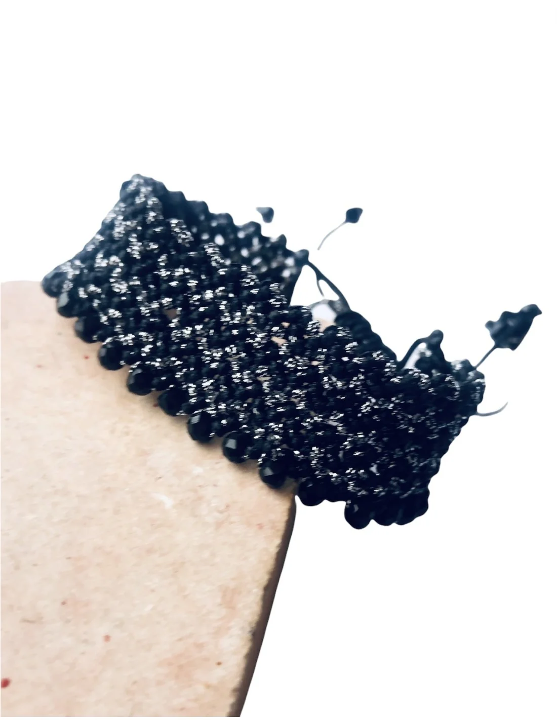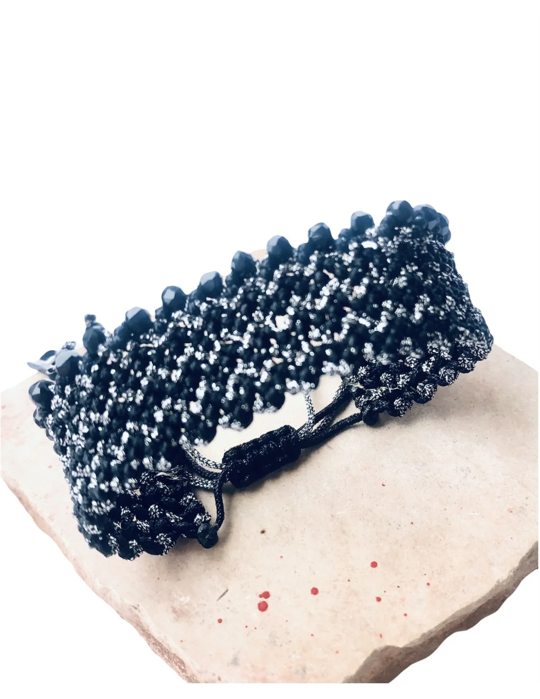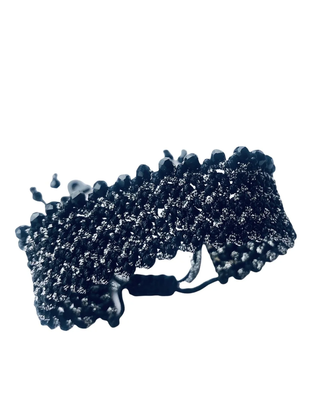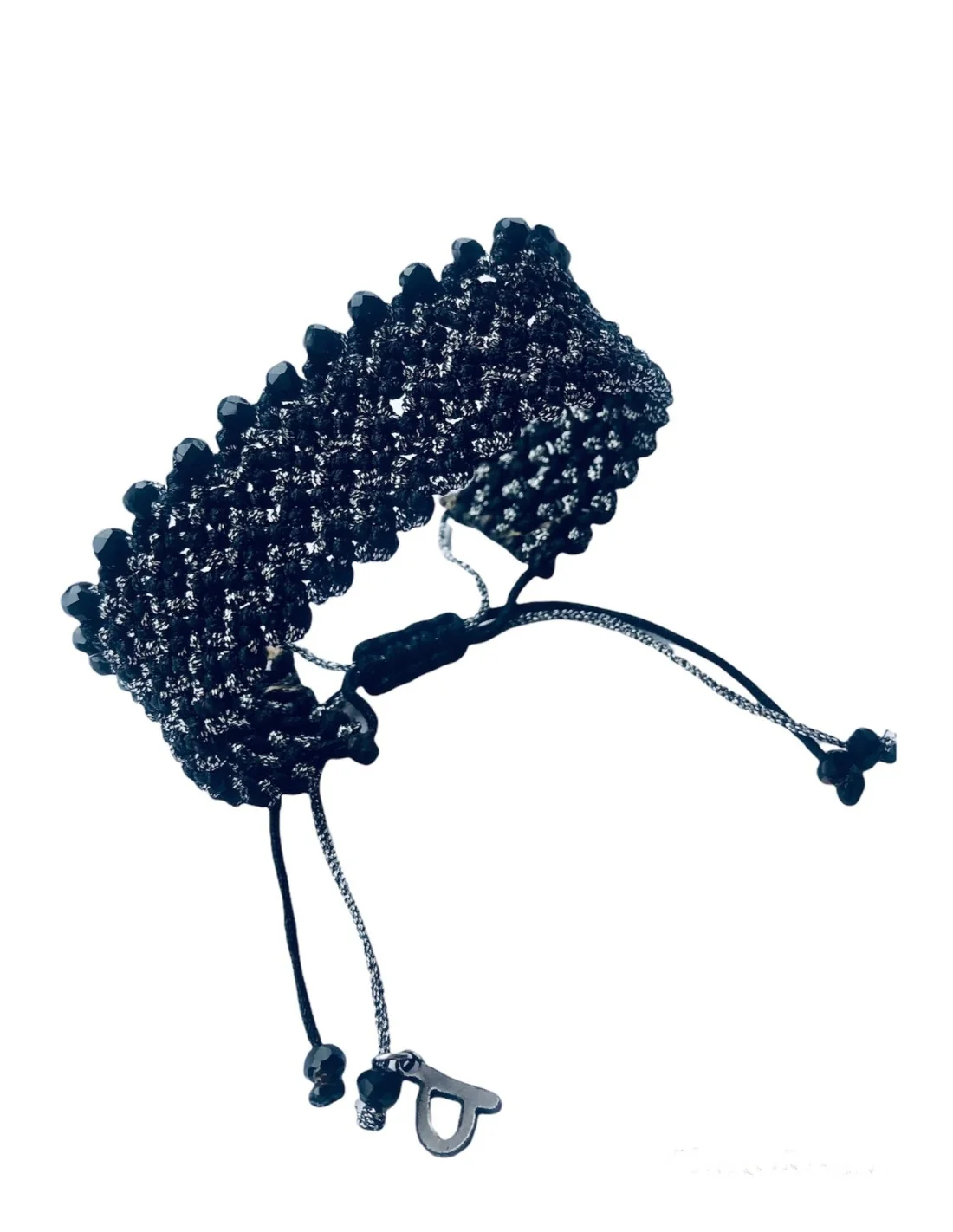 Χειροποίητο γυναικείο βραχιόλι μακραμέ πλεγμένο στο χέρι με ασήμι και μαύρη κεροκλωστή και μαύρα κρυσταλλάκια Τσεχίας περιμετρικά στην μία πλευρά και στα τελειώματα.