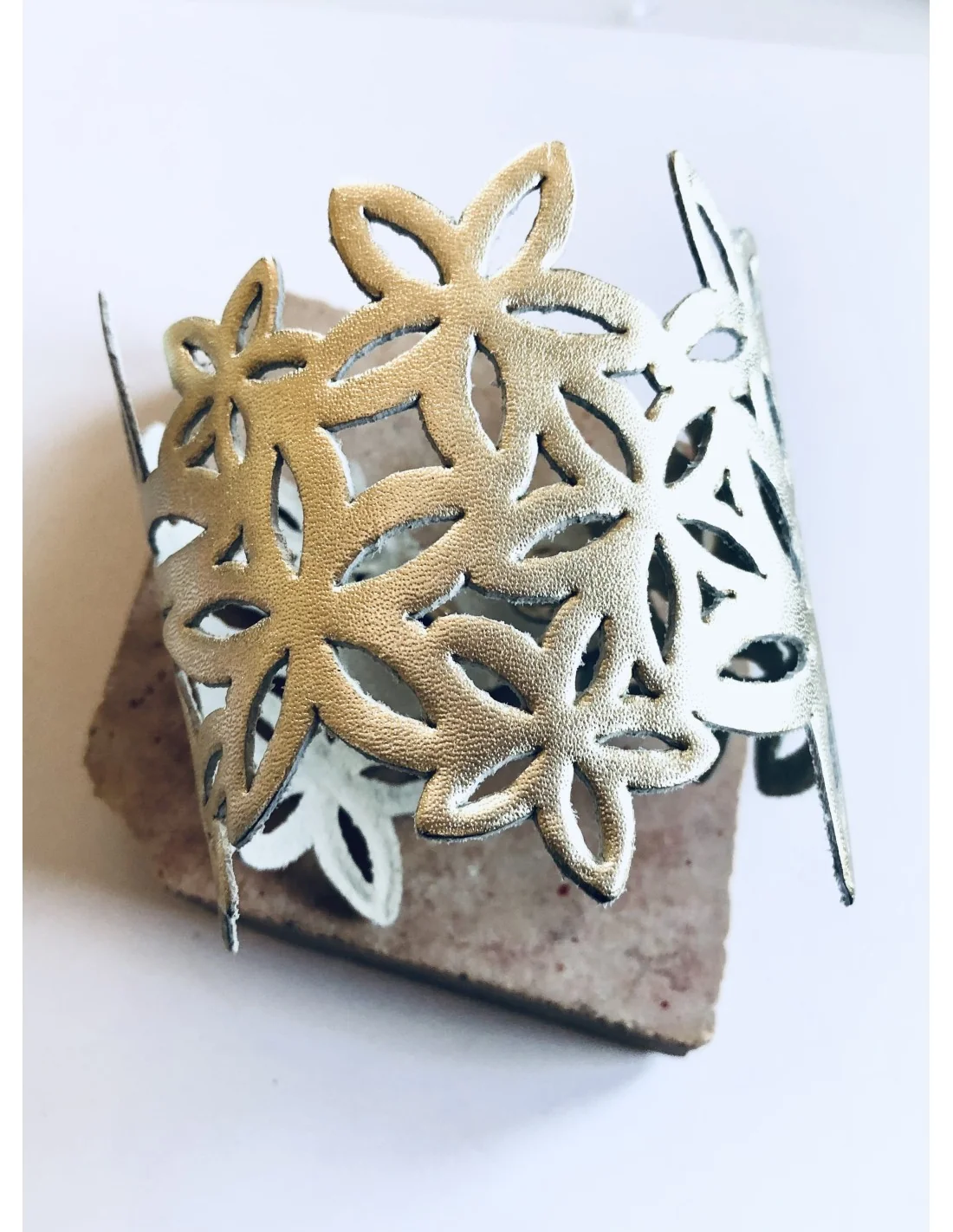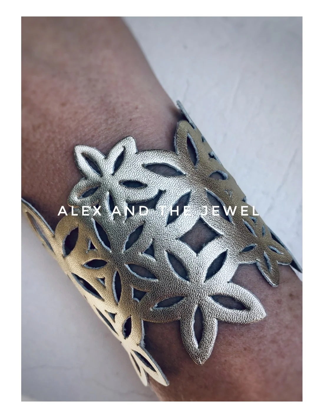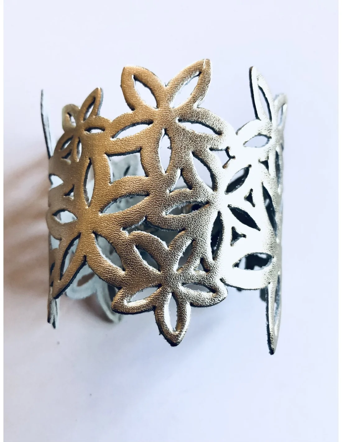 Χειροποίητο δερμάτινο διάτρητο βραχιόλι διαθέσιμο σε μαύρο ή χρυσό χρώμα, με μοντέρνο κούμπωμα τρουκς για άνετη εφαρμογή και ιδιαίτερο στυλ. Η διάτρητη σχεδίαση του προσδίδει έναν αέρα κομψότητας, ενώ το δέρμα ενισχύει την ανθεκτικότητα και την άνεση, καθιστώντας το ιδανικό για καθημερινή χρήση και ιδιαίτερες περιστάσεις.