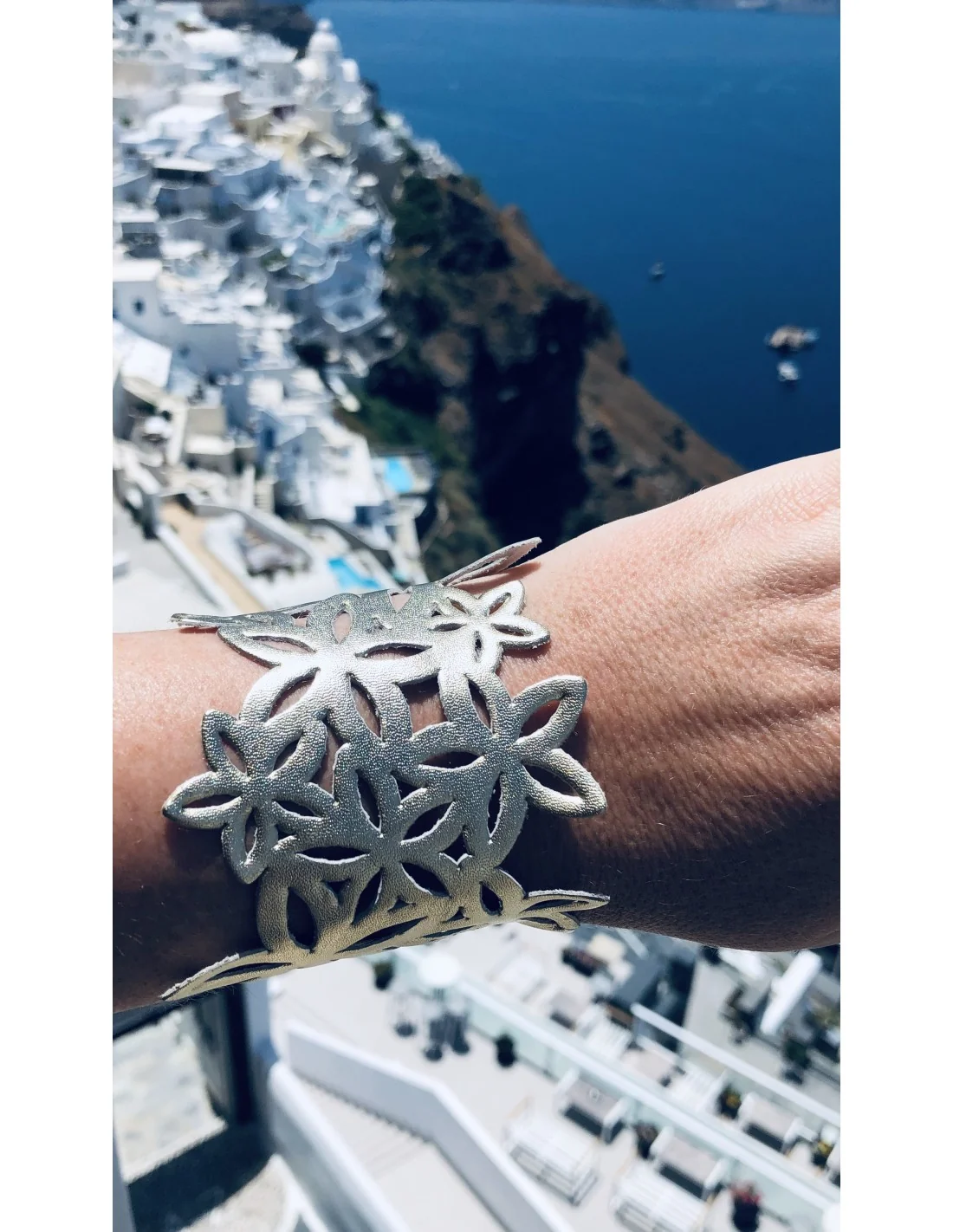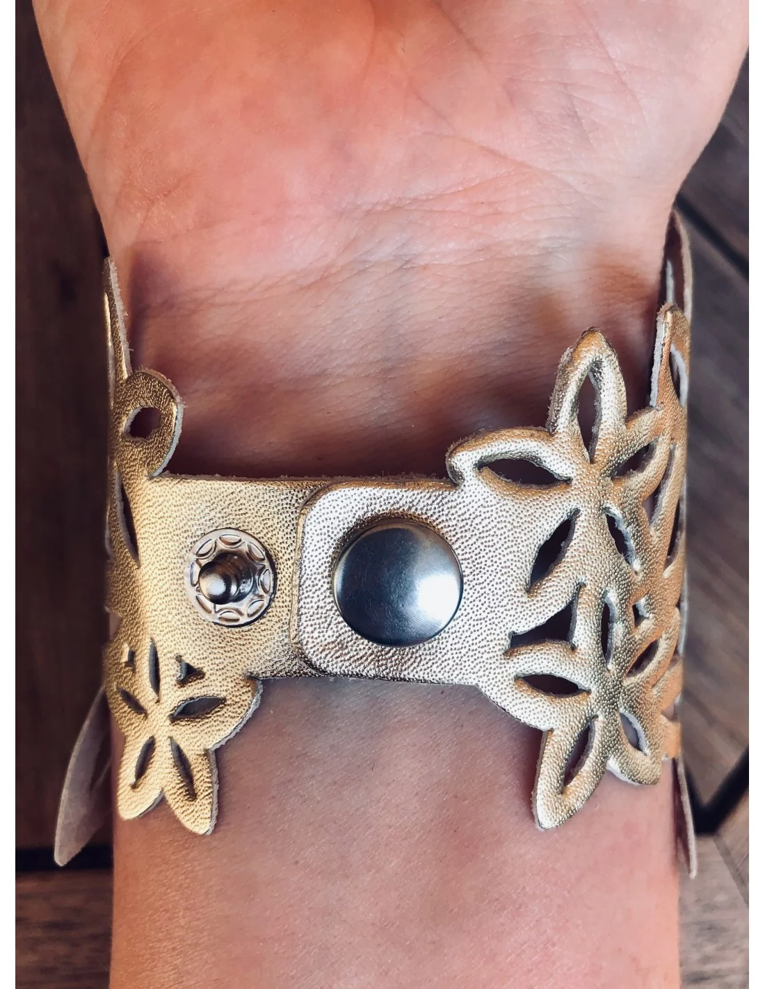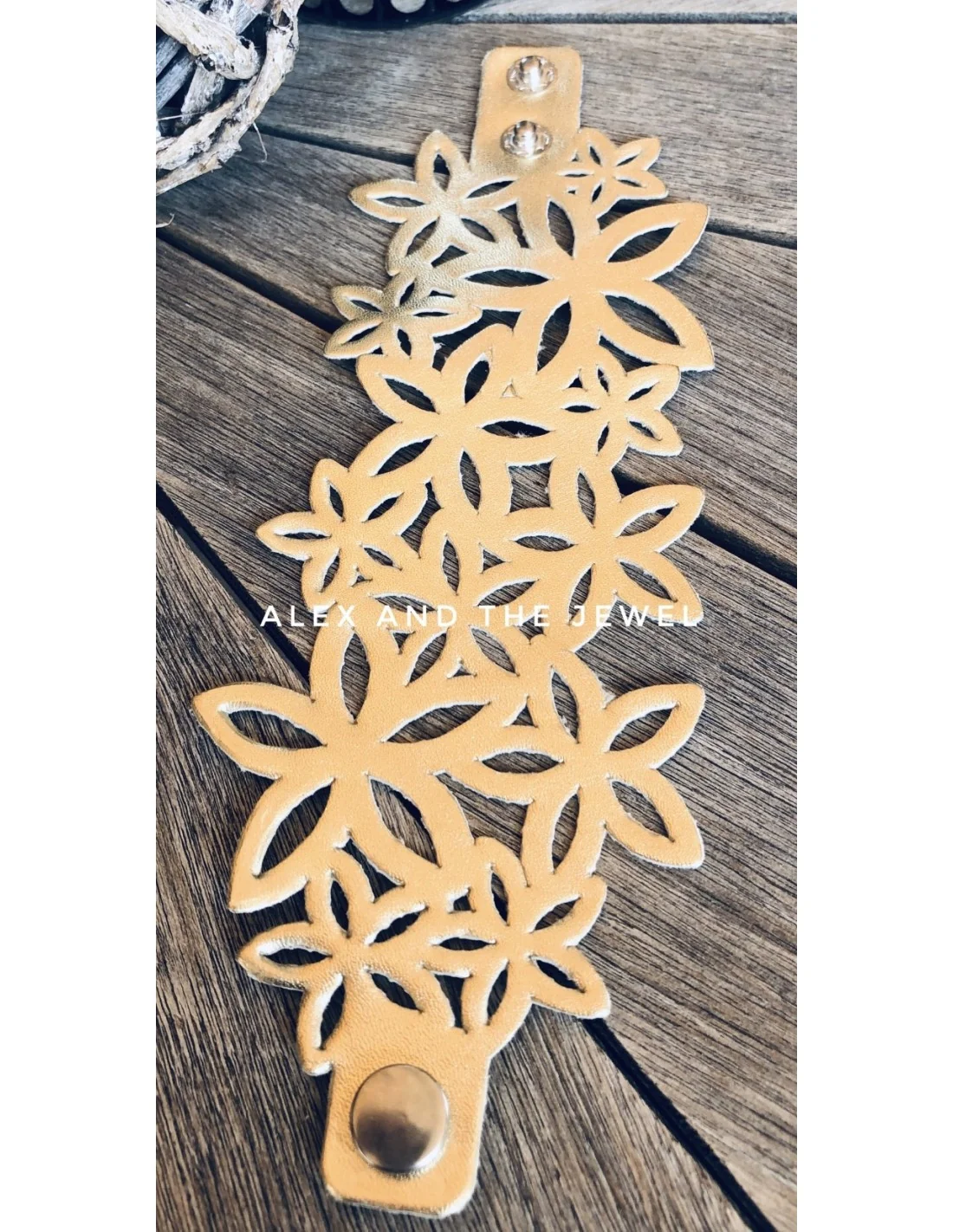Χειροποίητο δερμάτινο διάτρητο βραχιόλι διαθέσιμο σε μαύρο ή χρυσό χρώμα, με μοντέρνο κούμπωμα τρουκς για άνετη εφαρμογή και ιδιαίτερο στυλ. Η διάτρητη σχεδίαση του προσδίδει έναν αέρα κομψότητας, ενώ το δέρμα ενισχύει την ανθεκτικότητα και την άνεση, καθιστώντας το ιδανικό για καθημερινή χρήση και ιδιαίτερες περιστάσεις.