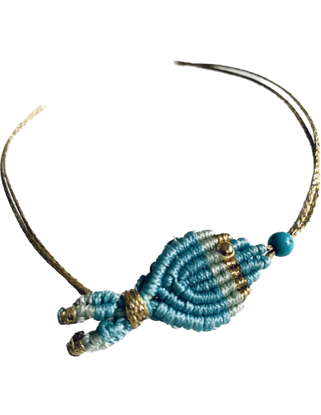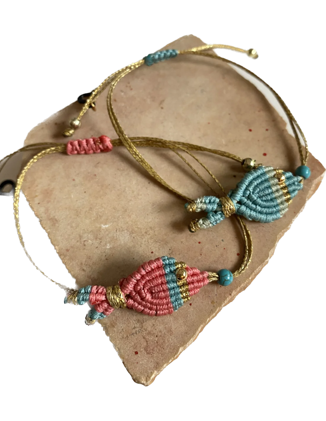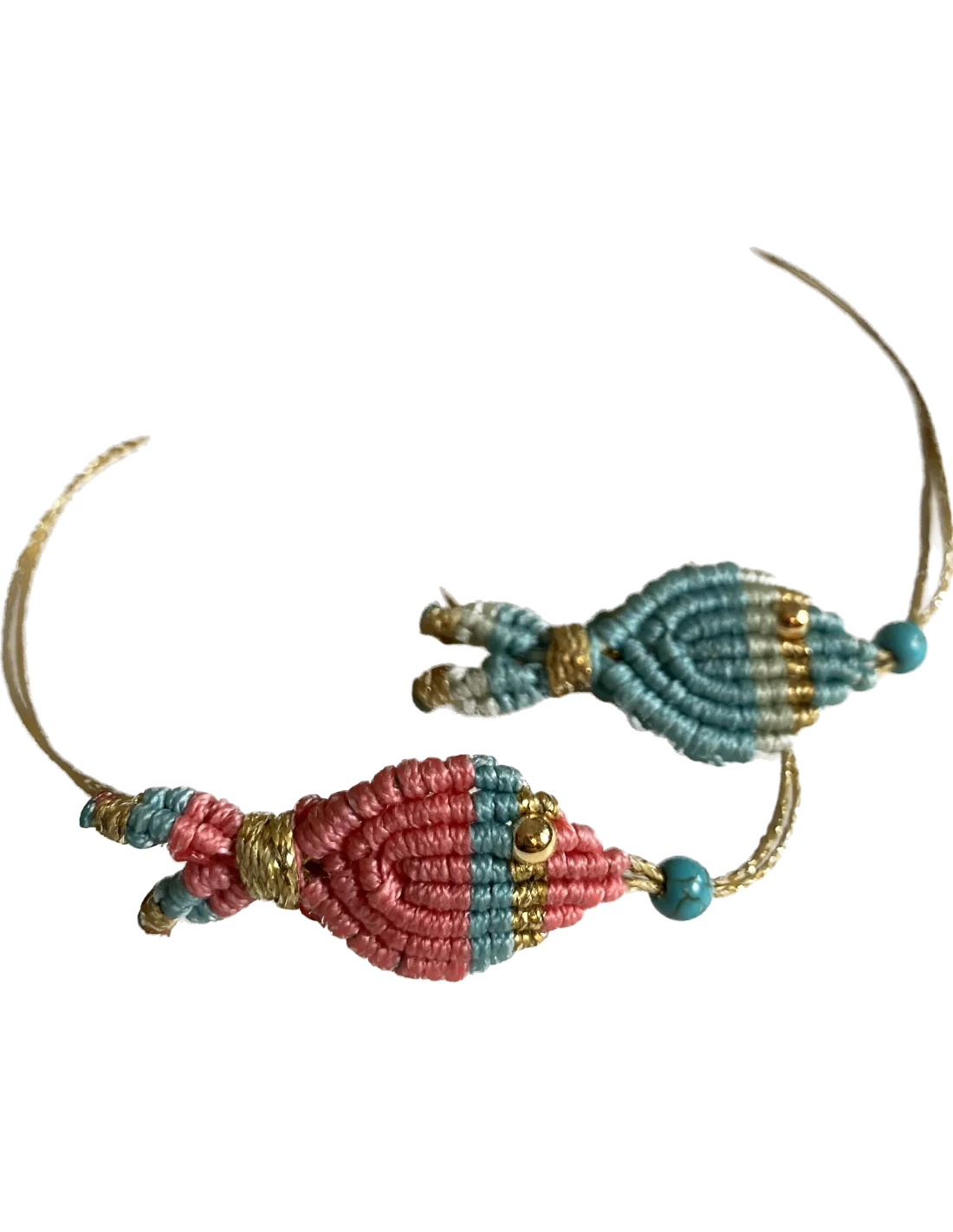 Αυτό το χειροποίητο βραχιόλι είναι πλεγμένο στο χέρι με την τεχνική μακραμέ, προσφέροντας ένα μοναδικό σχέδιο ψαράκι σε κοραλί, γαλάζιες και χρυσές αποχρώσεις.