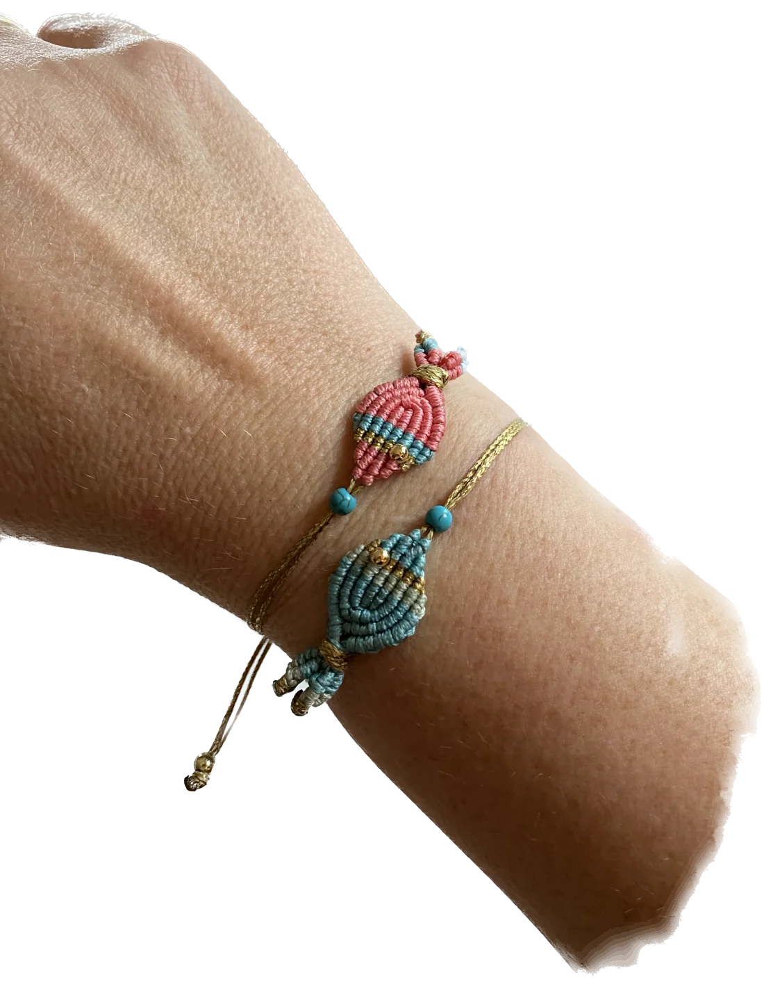Με άλλα μακραμέ βραχιόλια: Δημιουργήστε ένα layered look με βραχιόλια σε γαλάζιες και κοραλί αποχρώσεις για ένα casual και χαρούμενο στυλ.