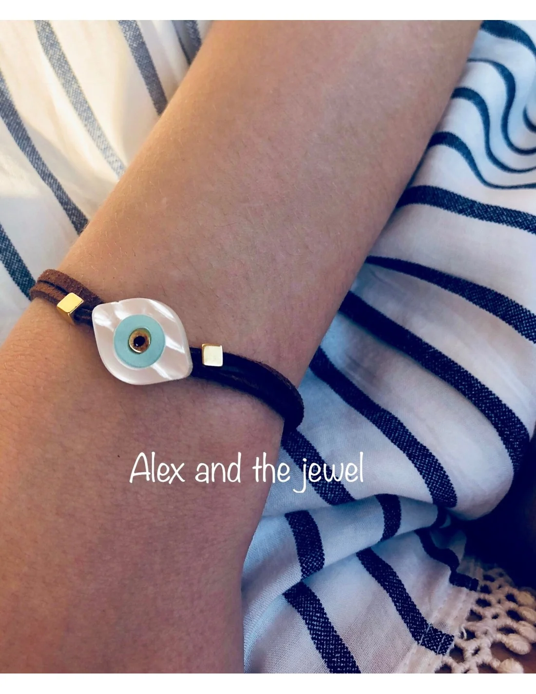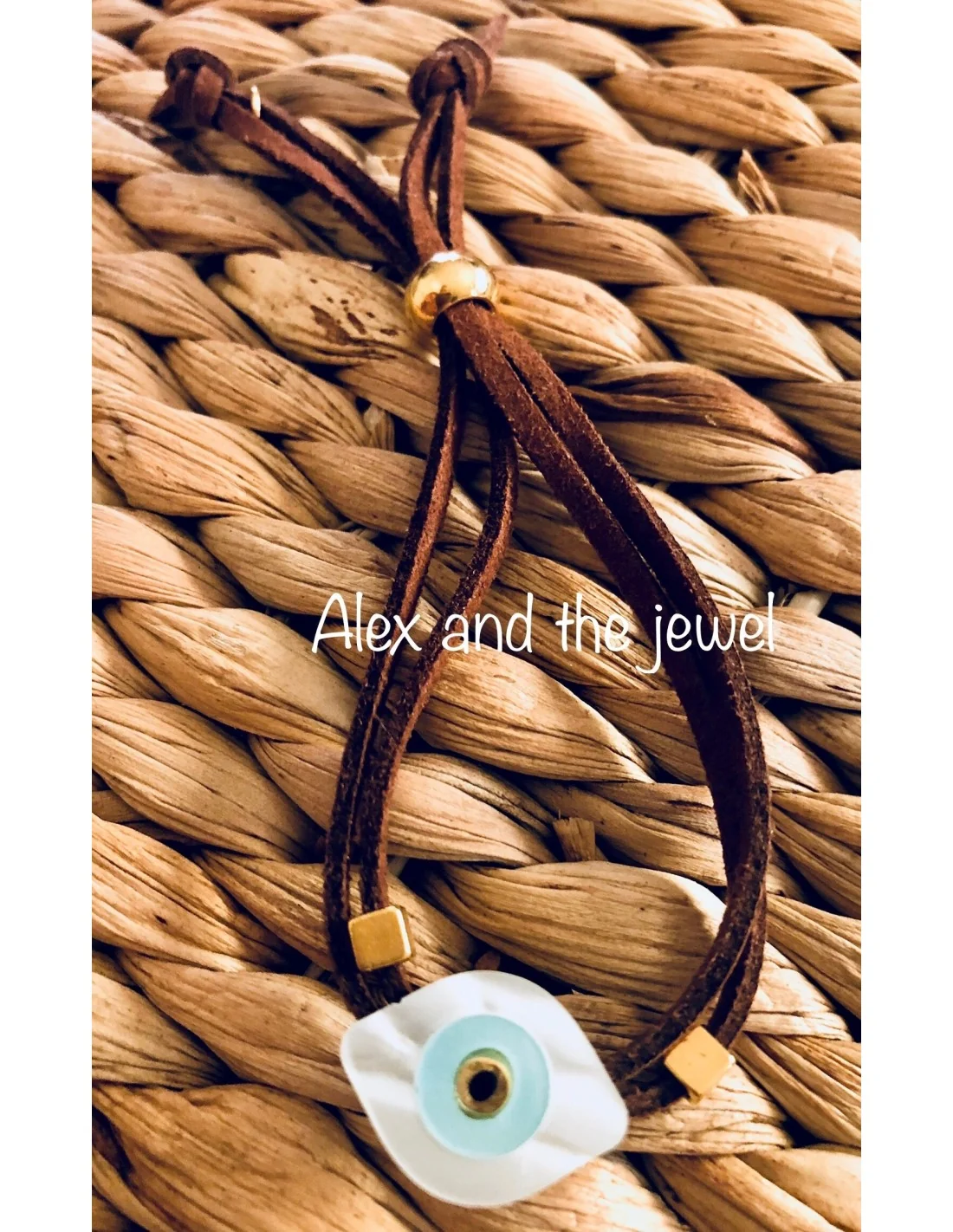 Χειροποίητο βραχιόλι με στοιχείο μάτι σε λευκό και σιελ σε καφέ σουέτ κορδόνι με αυξομείωση και επίχρυσα στοιχεία Alba