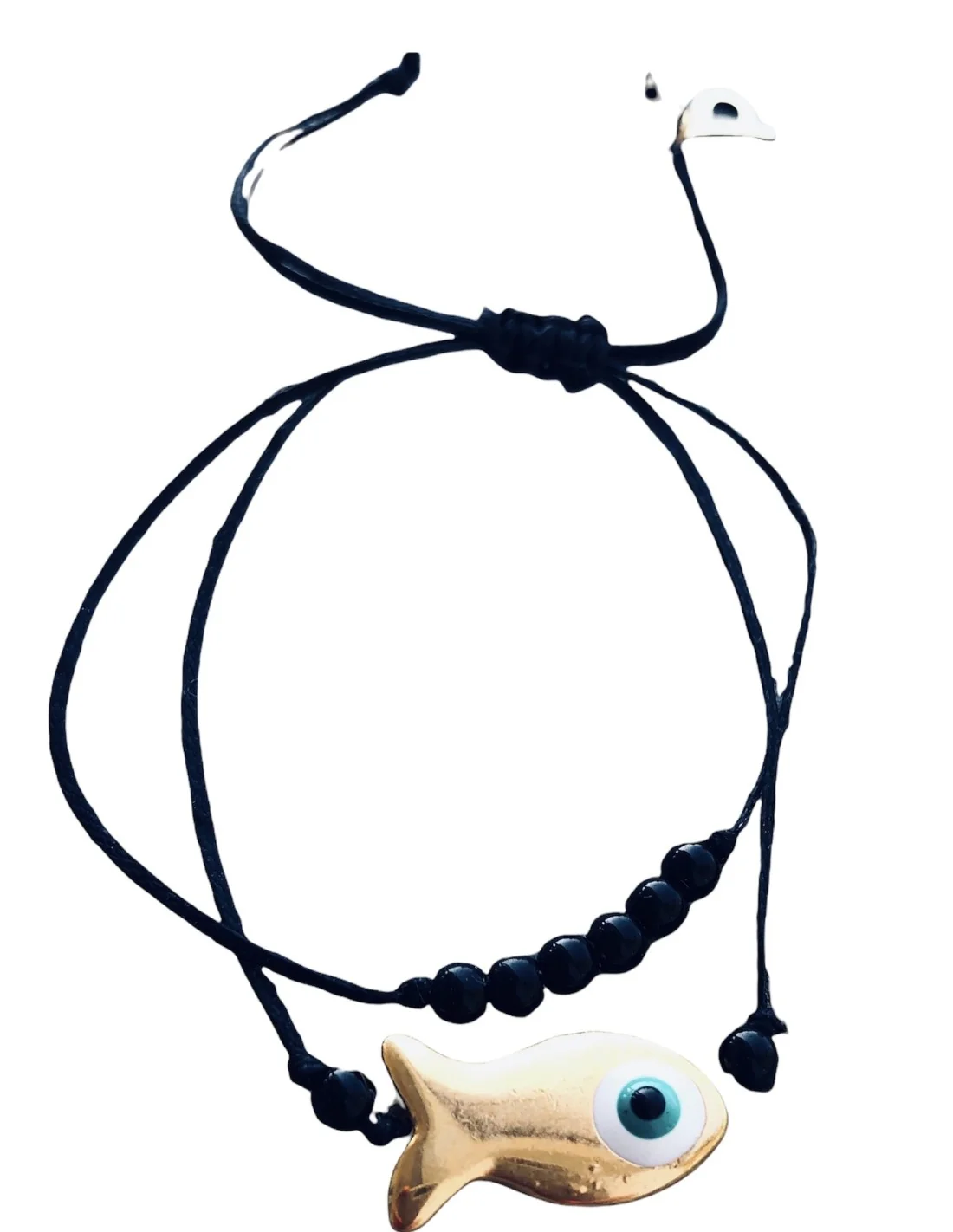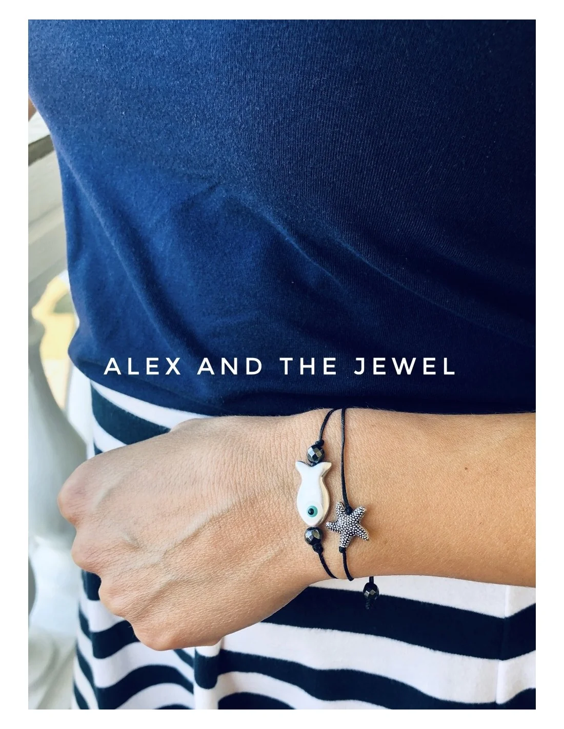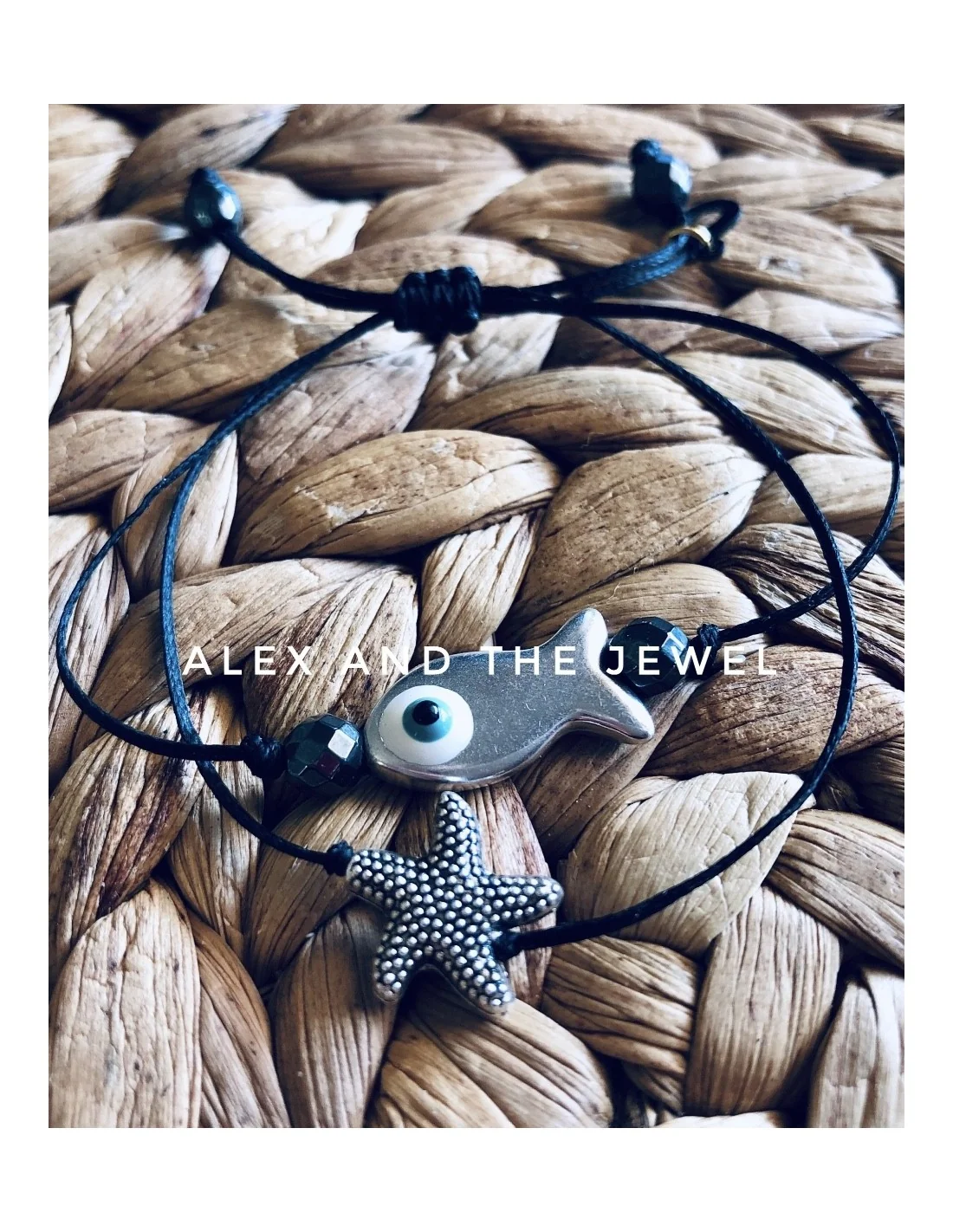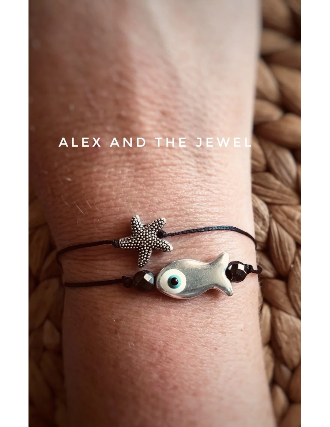 Χειροποίητο βραχιόλι με ασημί ψαράκι και αστερία που προσδίδουν μοναδικό θαλασσινό ύφος. Είναι δεμένο σε μαύρο κερωμένο νήμα, το οποίο ενισχύεται από διακοσμητικές πέτρες αιματίτη που προσφέρουν μοντέρνα λάμψη και στυλ. Με πρακτική αυξομείωση για τέλεια εφαρμογή.