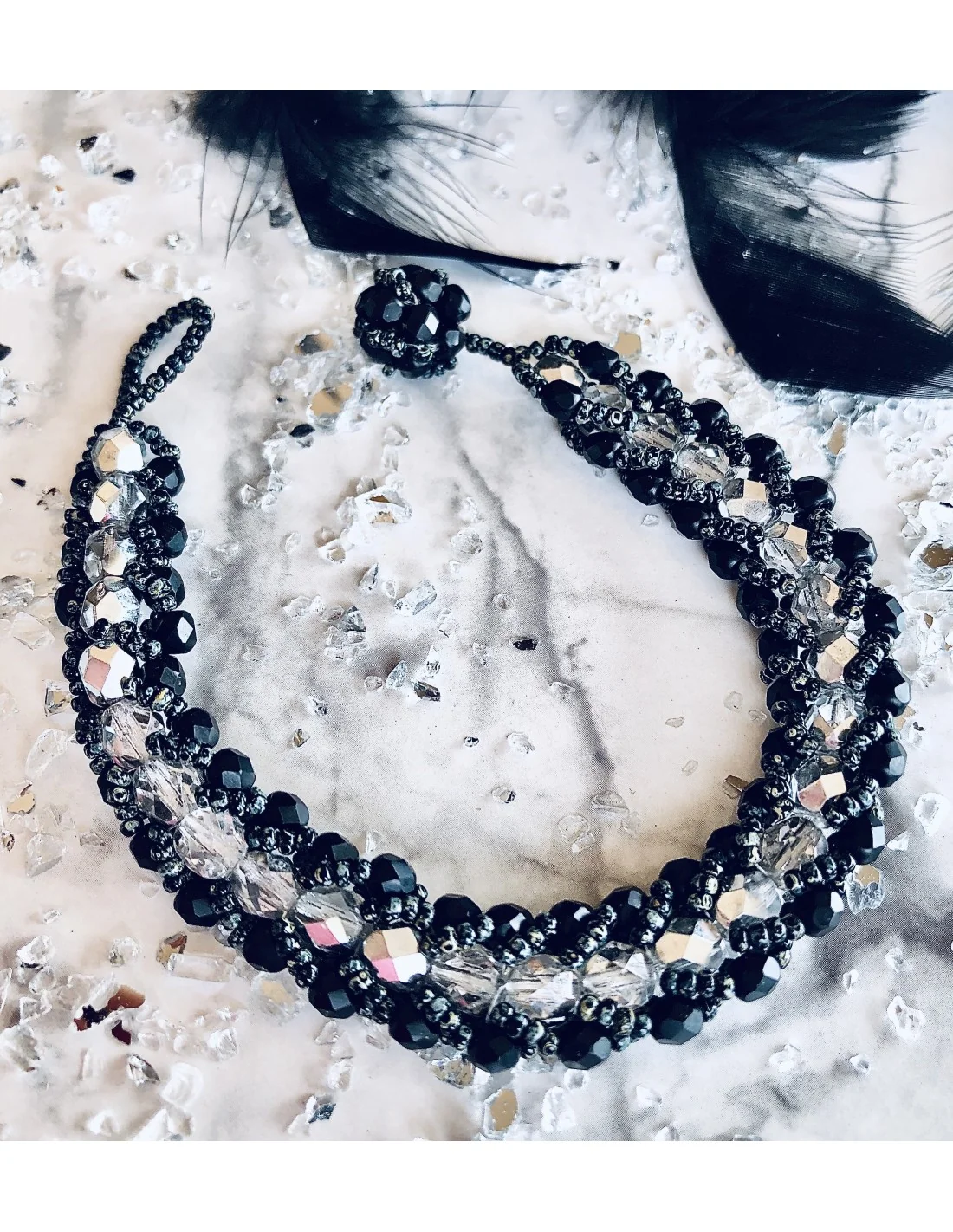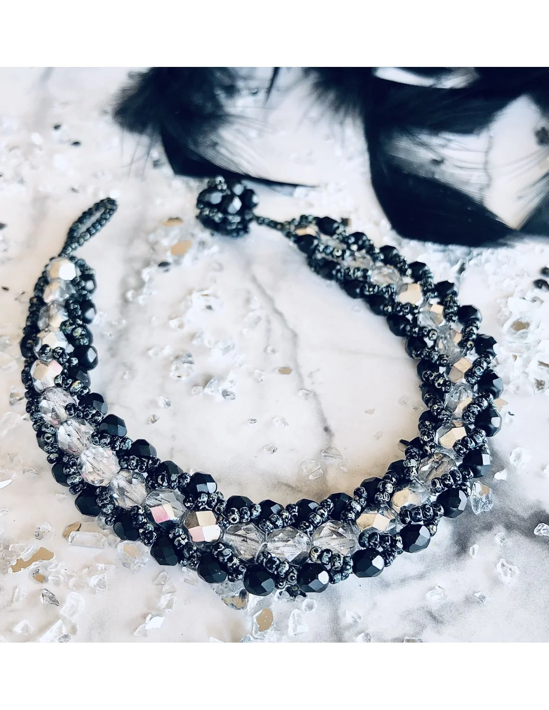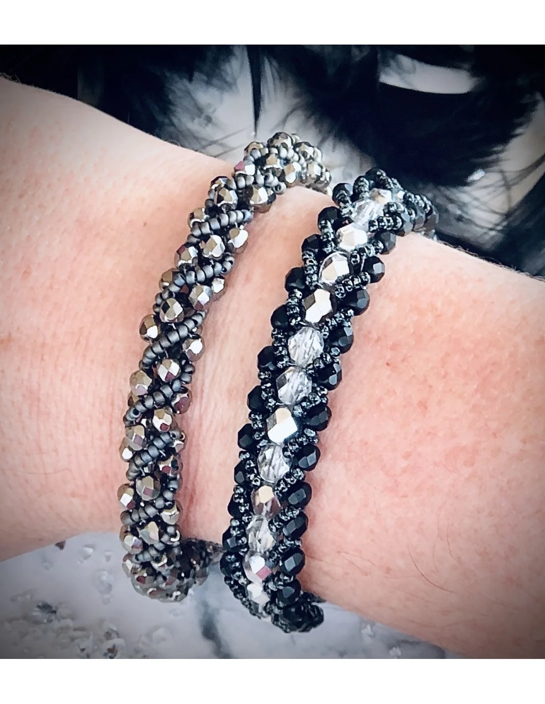 Χειροποίητο γυναικείο βραχιόλι με τεχνική beadweaving, που συνδυάζει διάφανα κρύσταλλα Τσεχίας υψηλής ποιότητας με χάντρες Ιαπωνίας Miyuki σε κομψές γκρι αποχρώσεις.