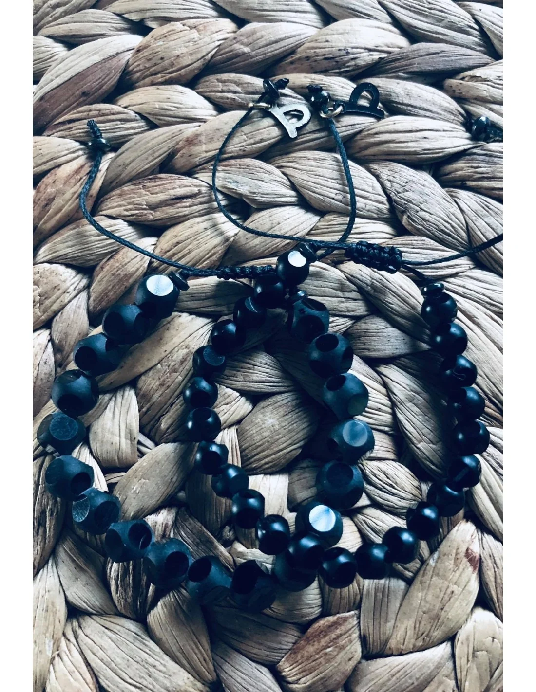 - Υλικά: Πολυεδρικά κρύσταλλα (μαύρο ματ και γυαλιστερό), κερωμένο νήμα, πέτρες αιματίτη.