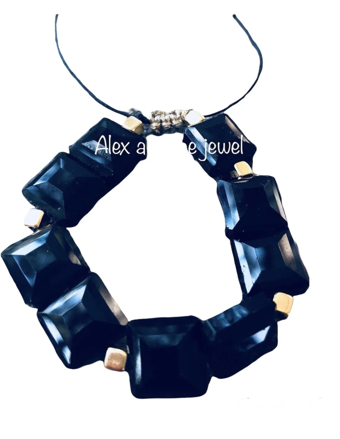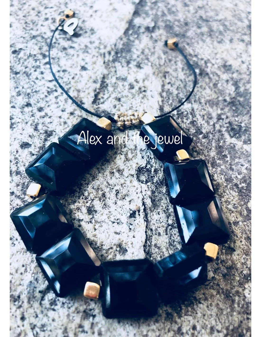 Το χειροποίητο βραχιόλι "Rallou" προσφέρει μια εντυπωσιακή εμφάνιση χάρη στα μεγάλα πλακέ μαύρα κρύσταλλα που συνδυάζονται με επίχρυσα κυβάκια.