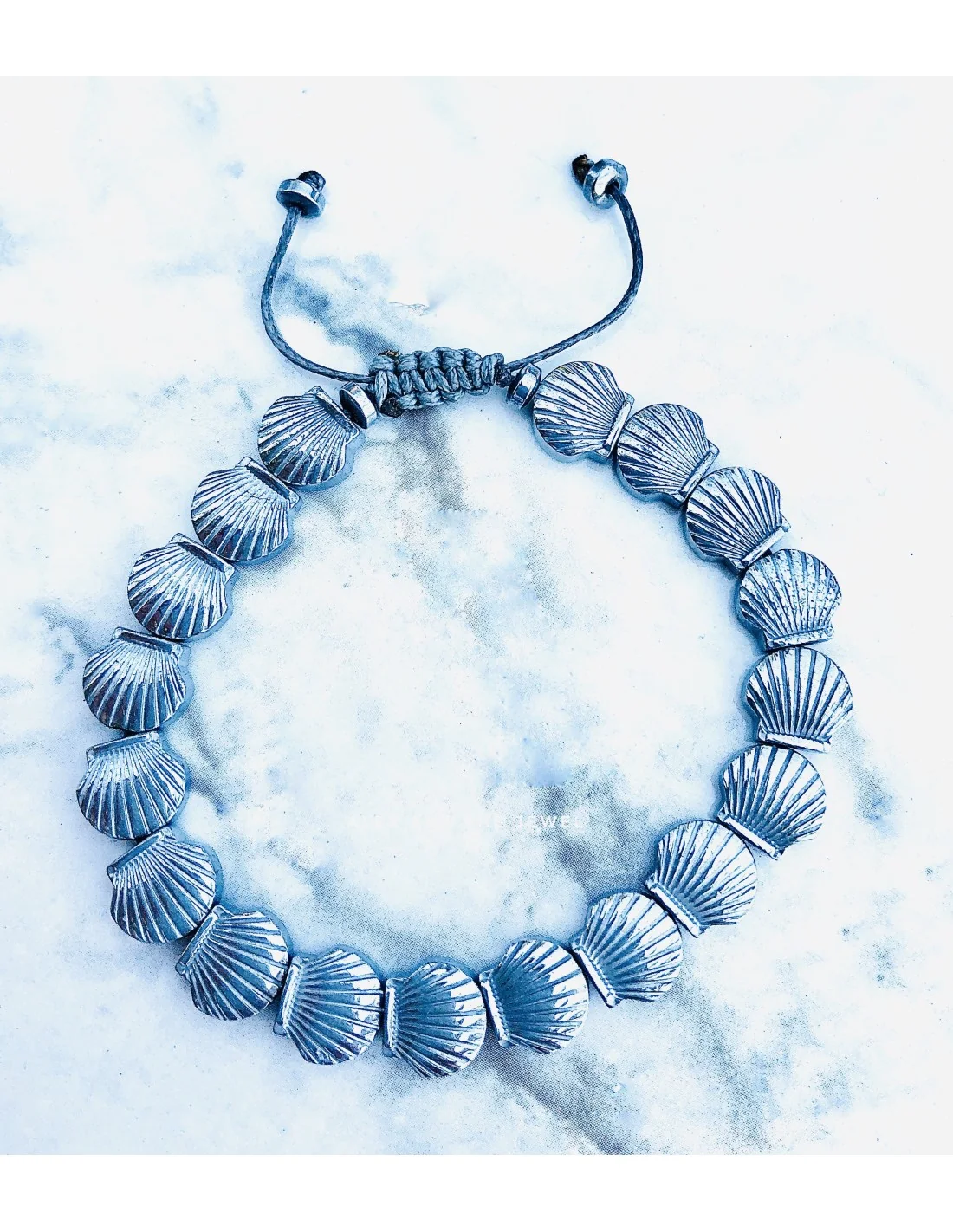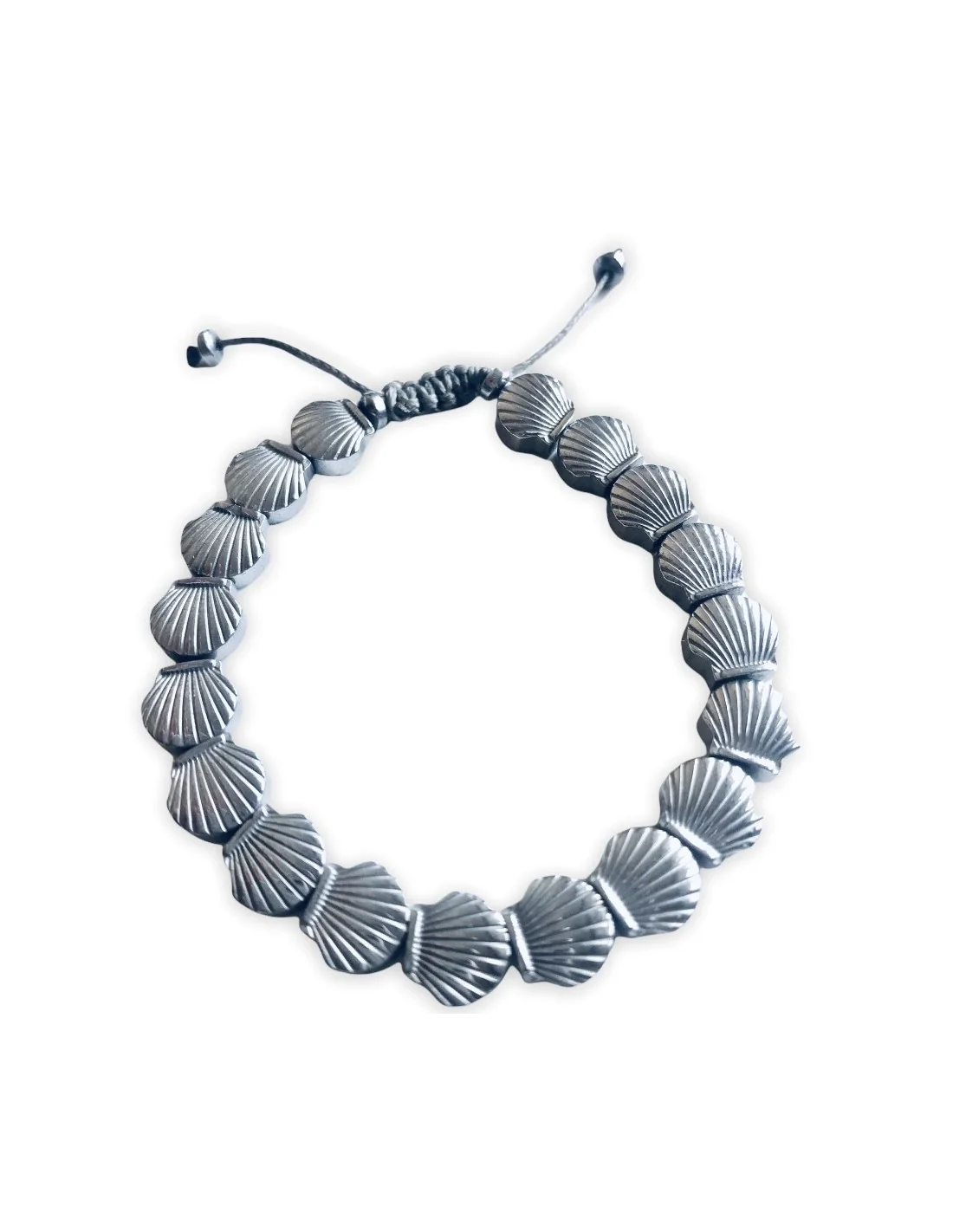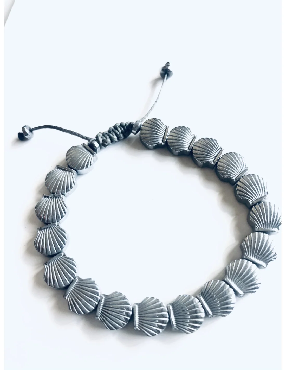 Χειροποίητο βραχιόλι με πέτρες αιματίτη σε σχέδιο κοχύλι σε ασημί ματ χρώμα, δεμένο σε γκρι κερωμένο κορδόνι με αυξομείωση Scallop