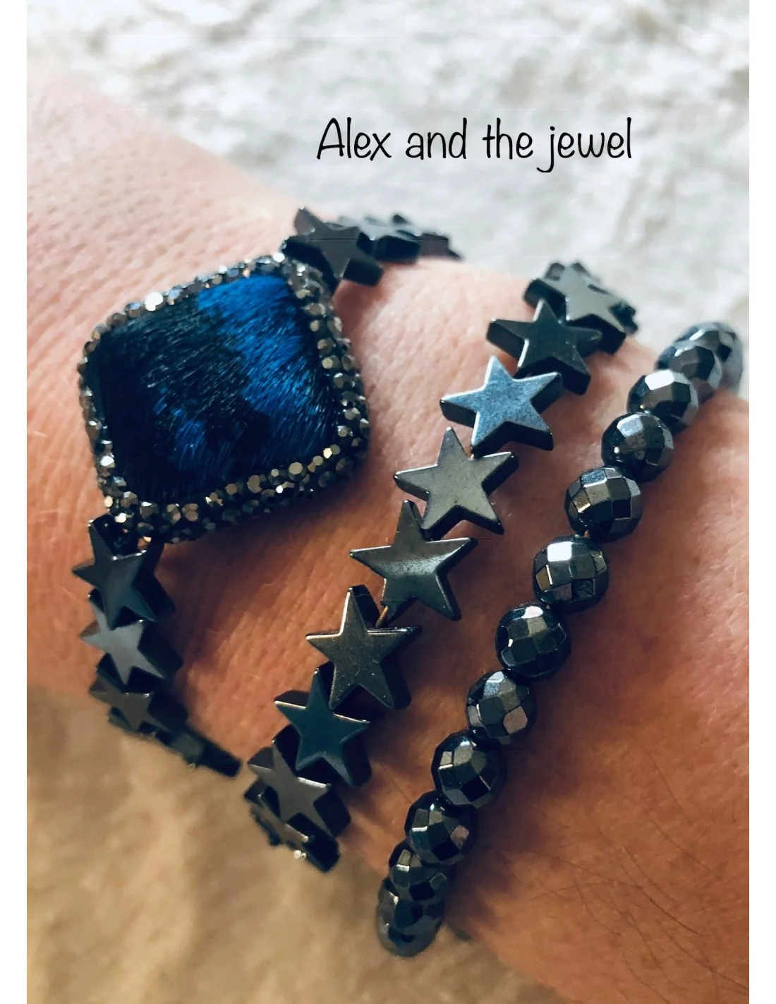 Διακοσμημένο με πέτρες αιματίτη σε σχήμα αστέρι, αυτό το βραχιόλι συνδυάζει φυσικά και λαμπερά στοιχεία.