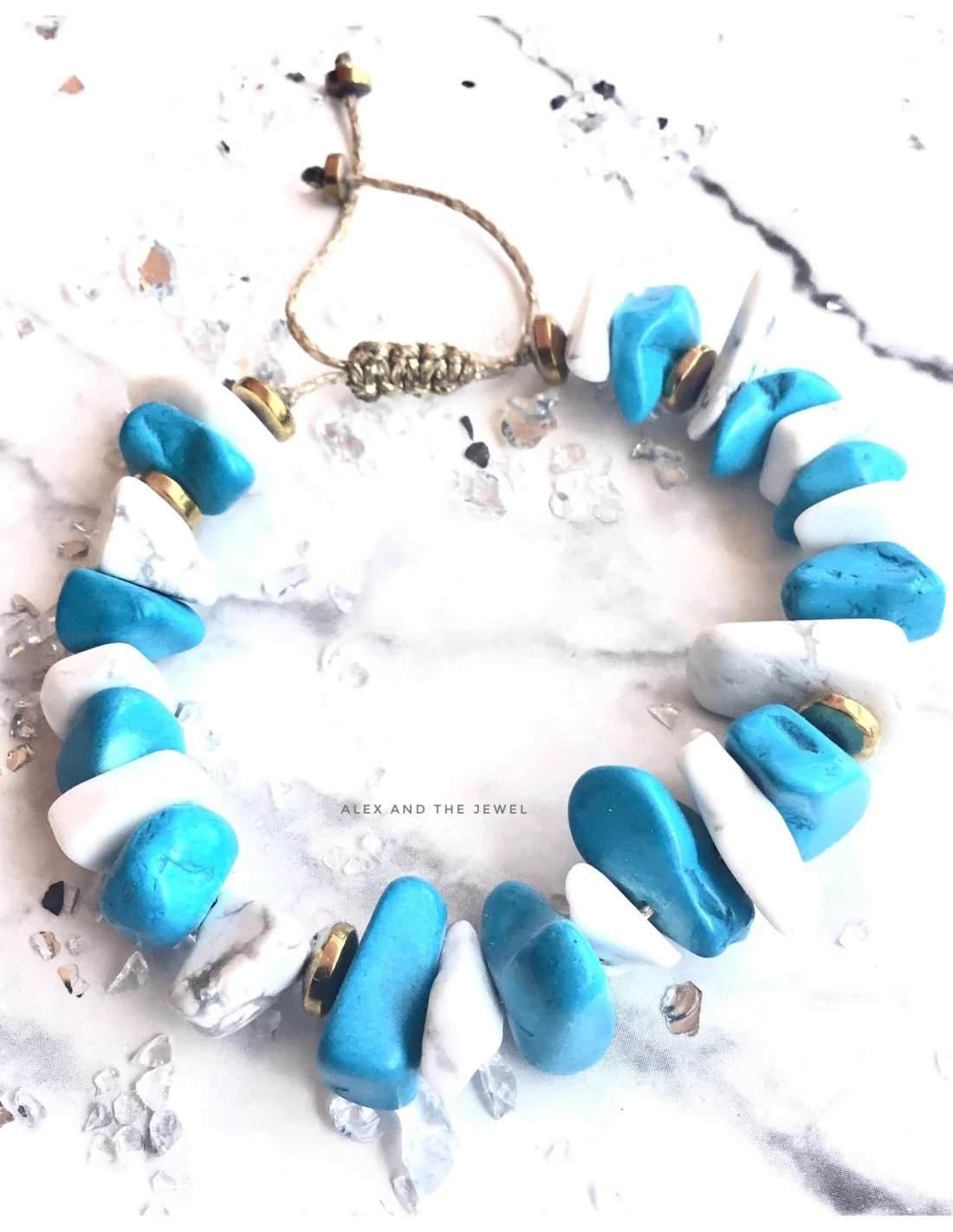 Χειροποίητο γυναικείο βραχιόλι με λευκές και γαλάζιες πέτρες και ημιπολύτιμους λίθους αιματίτη ενδιάμεσα, δεμένο σε χρυσό κερωμένο νήμα με αυξομείωση Astypalaia