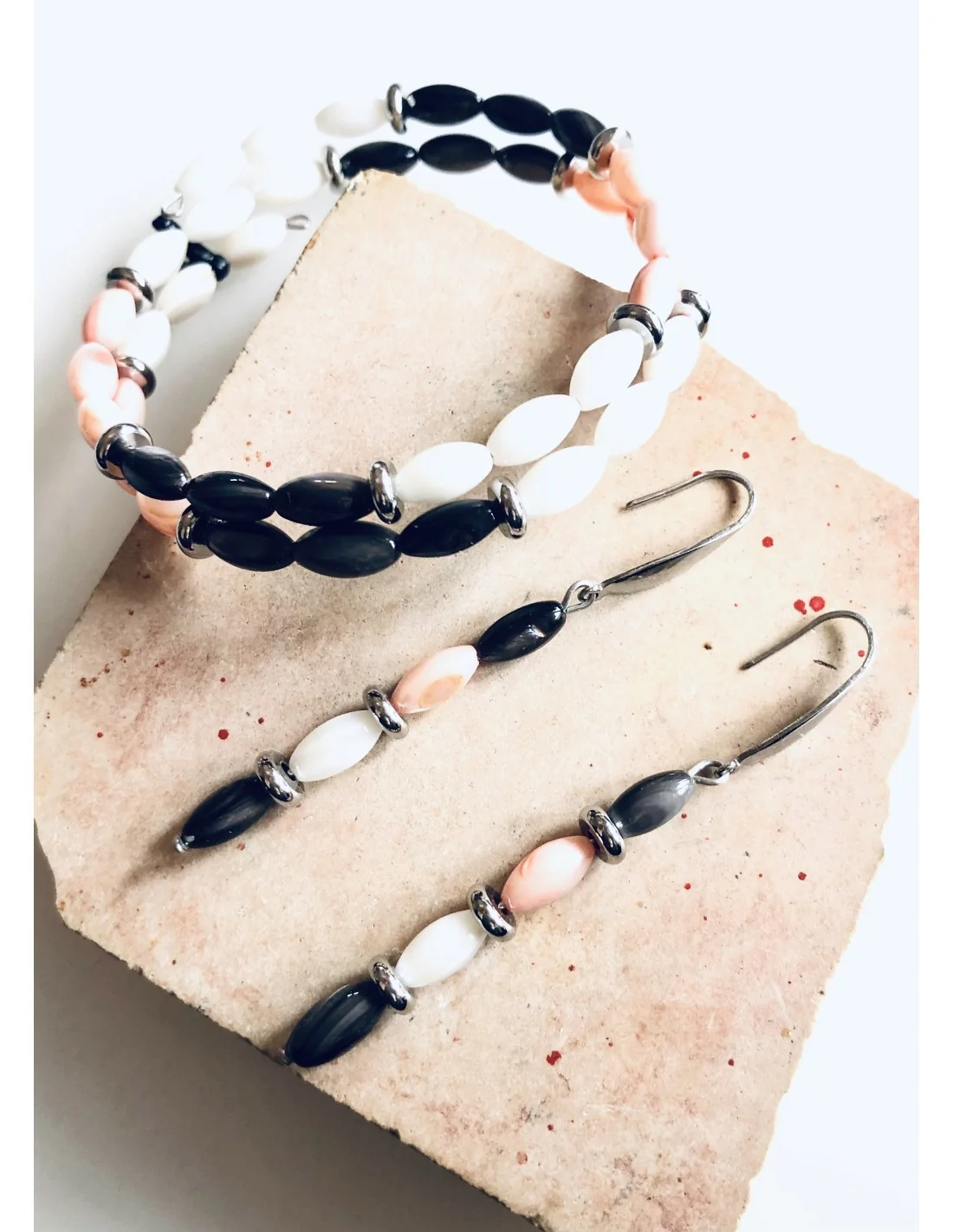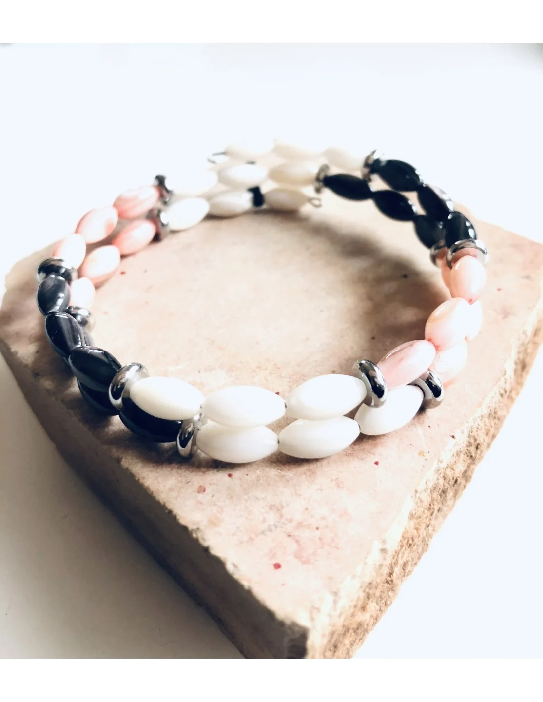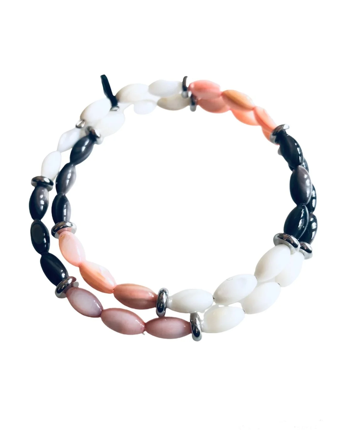 Αυτό το χειροποίητο διπλό γυναικείο βραχιόλι είναι φτιαγμένο από κομψά κυλινδρικά στοιχεία φίλντισί σε τρεις μοναδικές αποχρώσεις: γκρι σκούρο, λευκό και κοραλί.