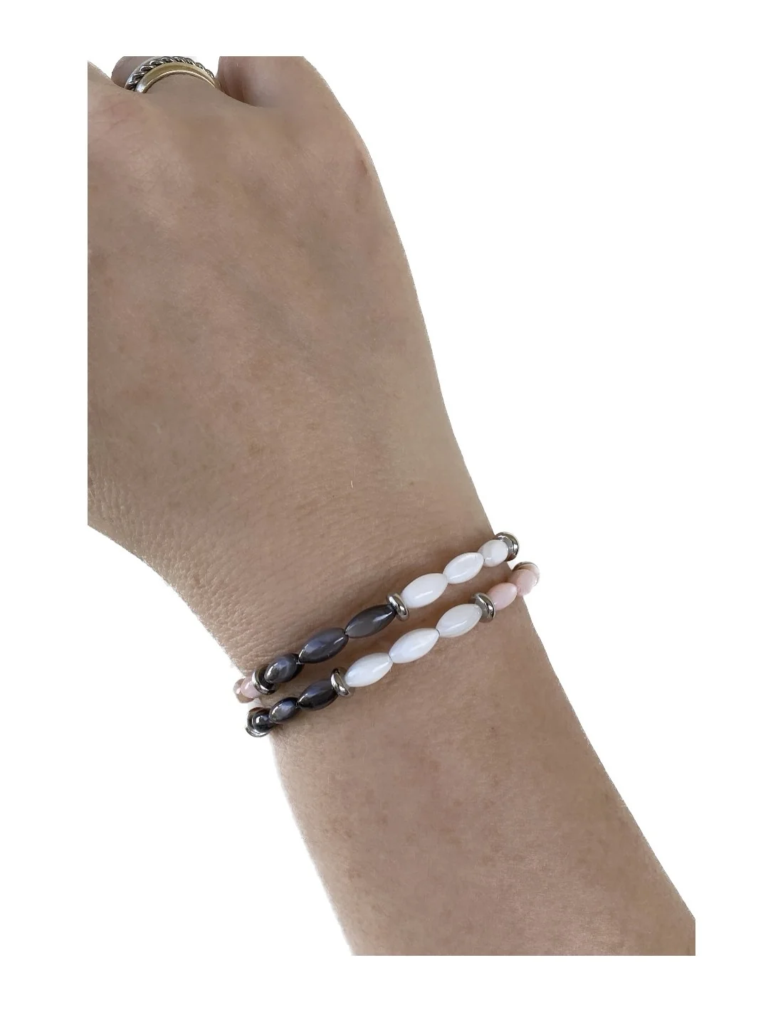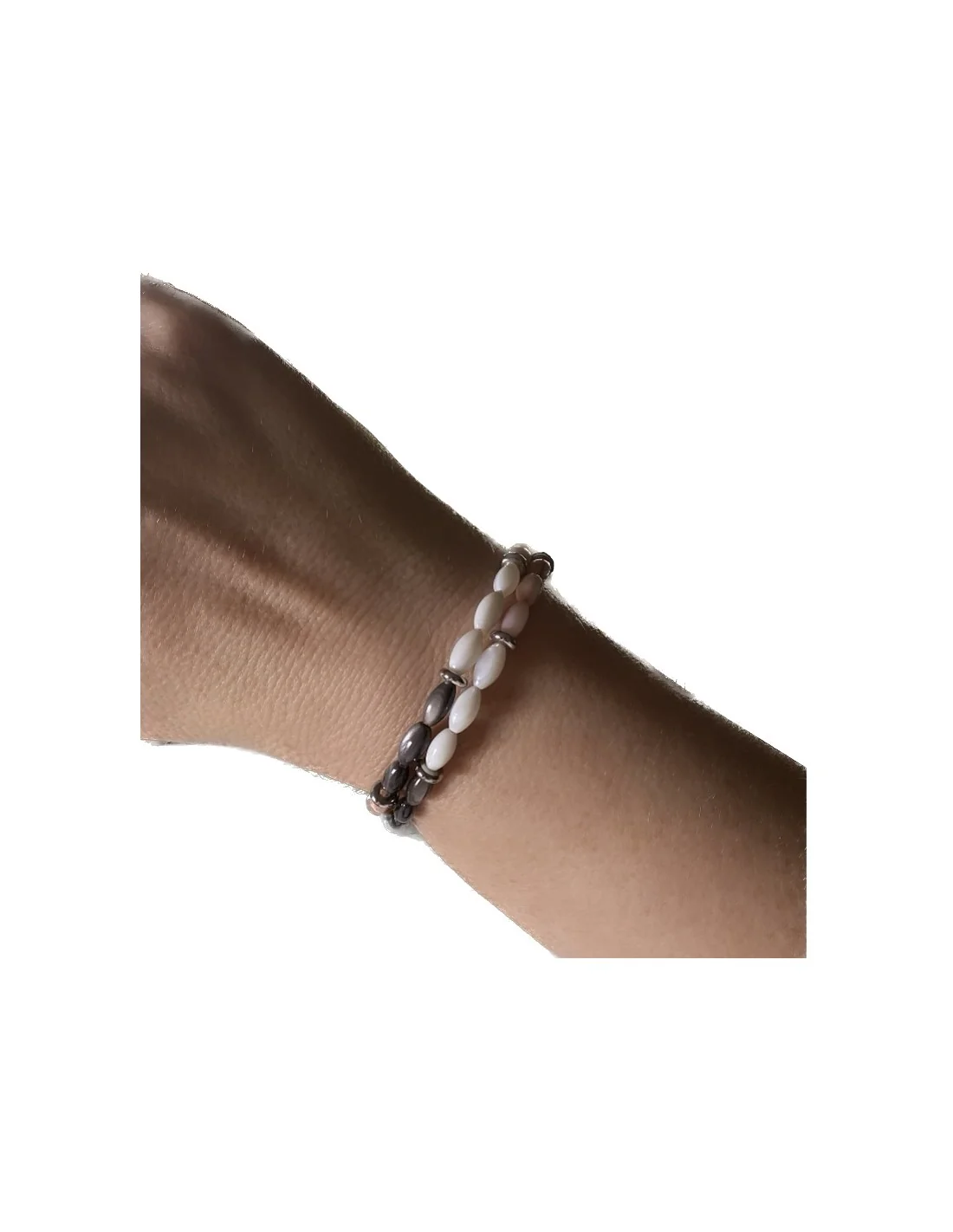 Χειροποίητο διπλό γυναικείο βραχιόλι με κυλινδρικά στοιχεία από φίλντισί και ημιπολύτιμες πέτρες αιματίτη