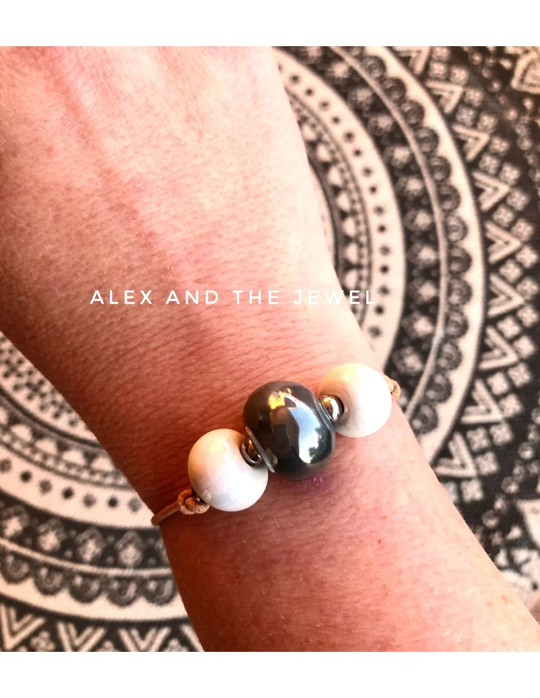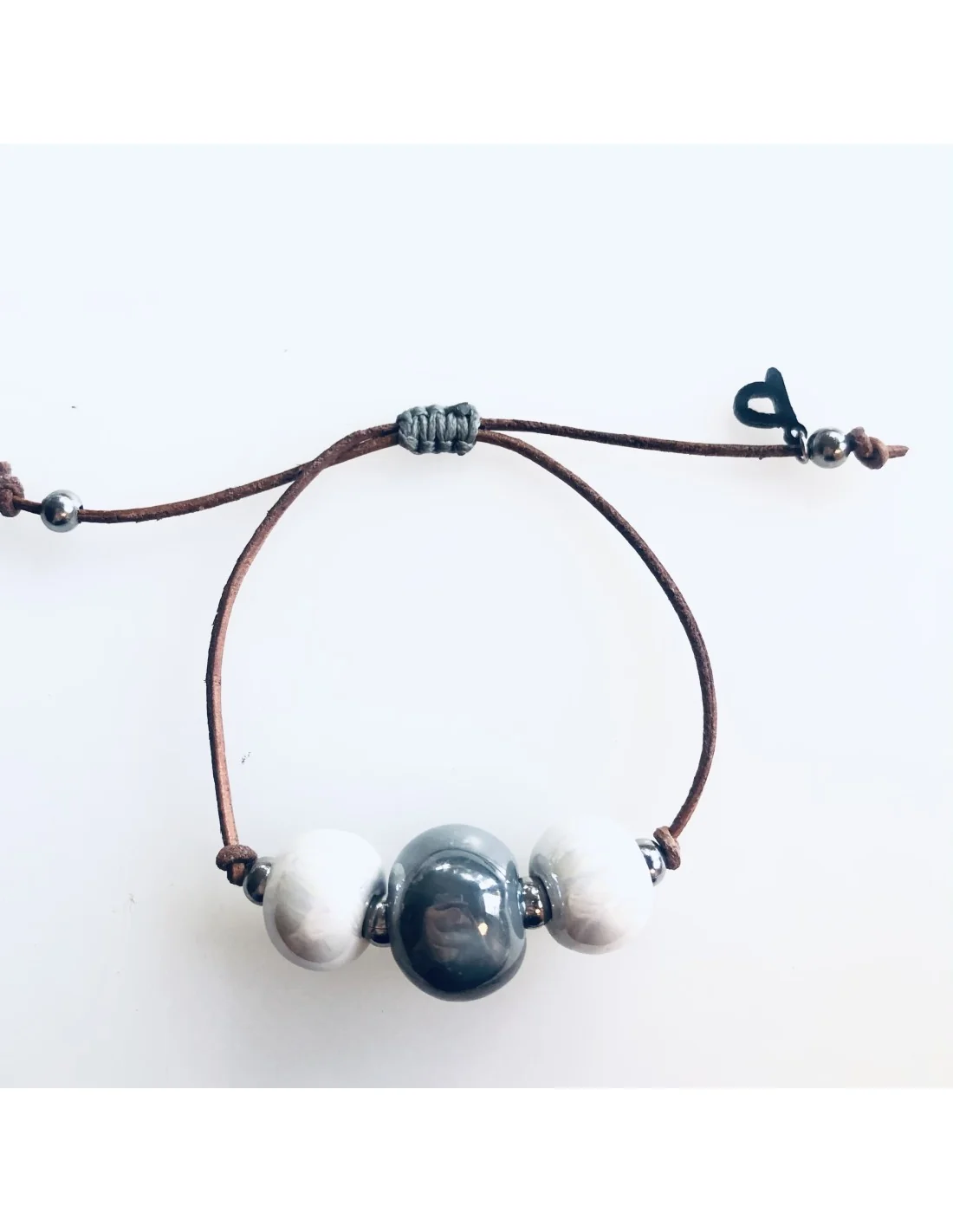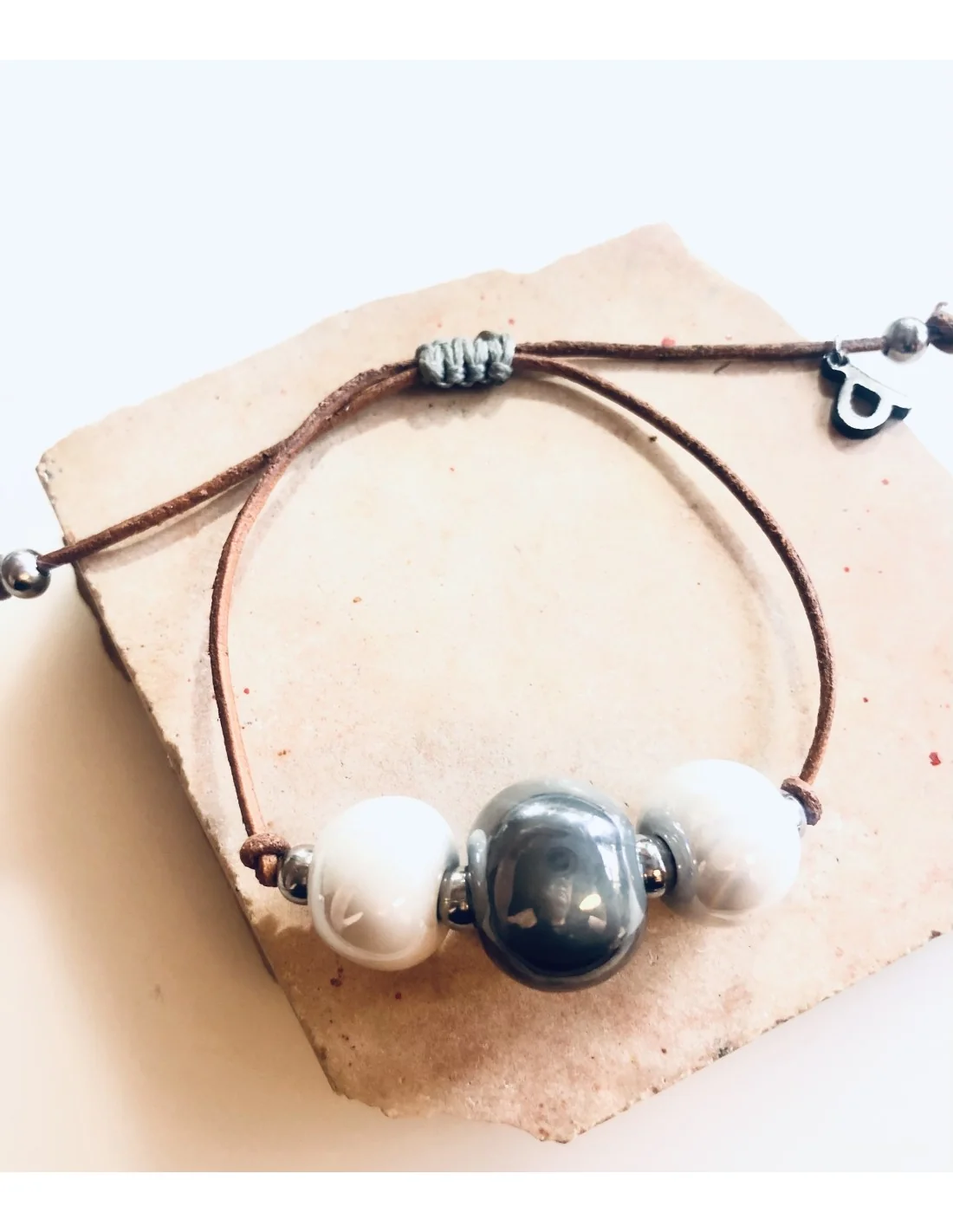 Ανακαλύψτε το χειροποίητο γυναικείο βραχιόλι Amorgos, που συνδυάζει κομψότητα και μοναδικότητα. Με μεγάλες σφαιρικές κεραμικές πέτρες σε λευκό και ανθρακί, αυτό το βραχιόλι προσφέρει μια φρέσκια και σύγχρονη αίσθηση.