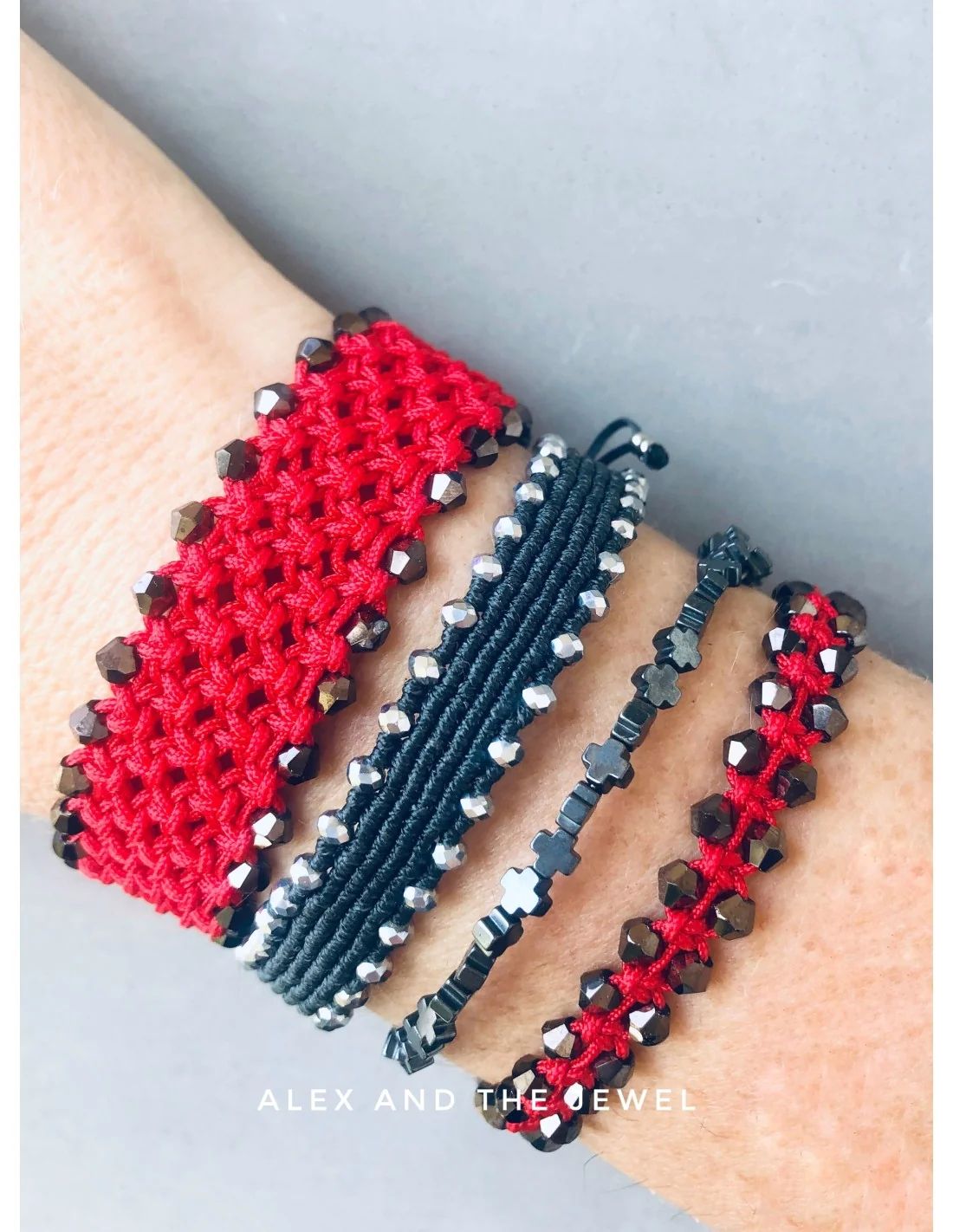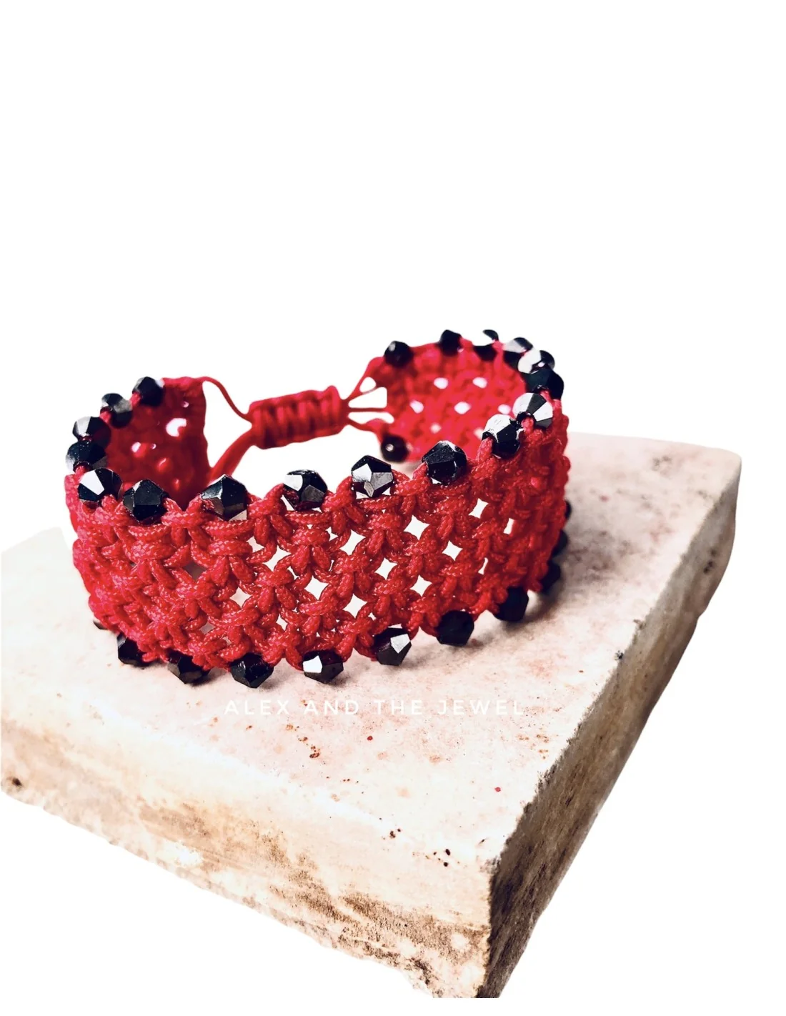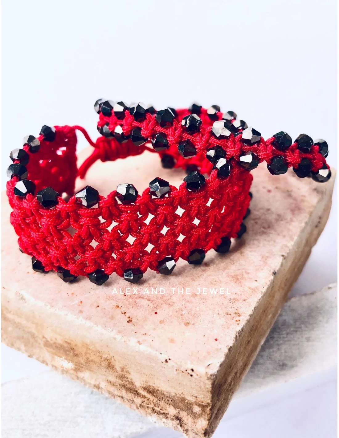 Χειροποίητο γυναικείο βραχιόλι πλεγμένο στο χέρι με πλέξη μακραμέ σε έντονο κόκκινο χρώμα με γκρι καφέ κρύσταλλα περιμετρικά και από τις δύο πλευρές Fire