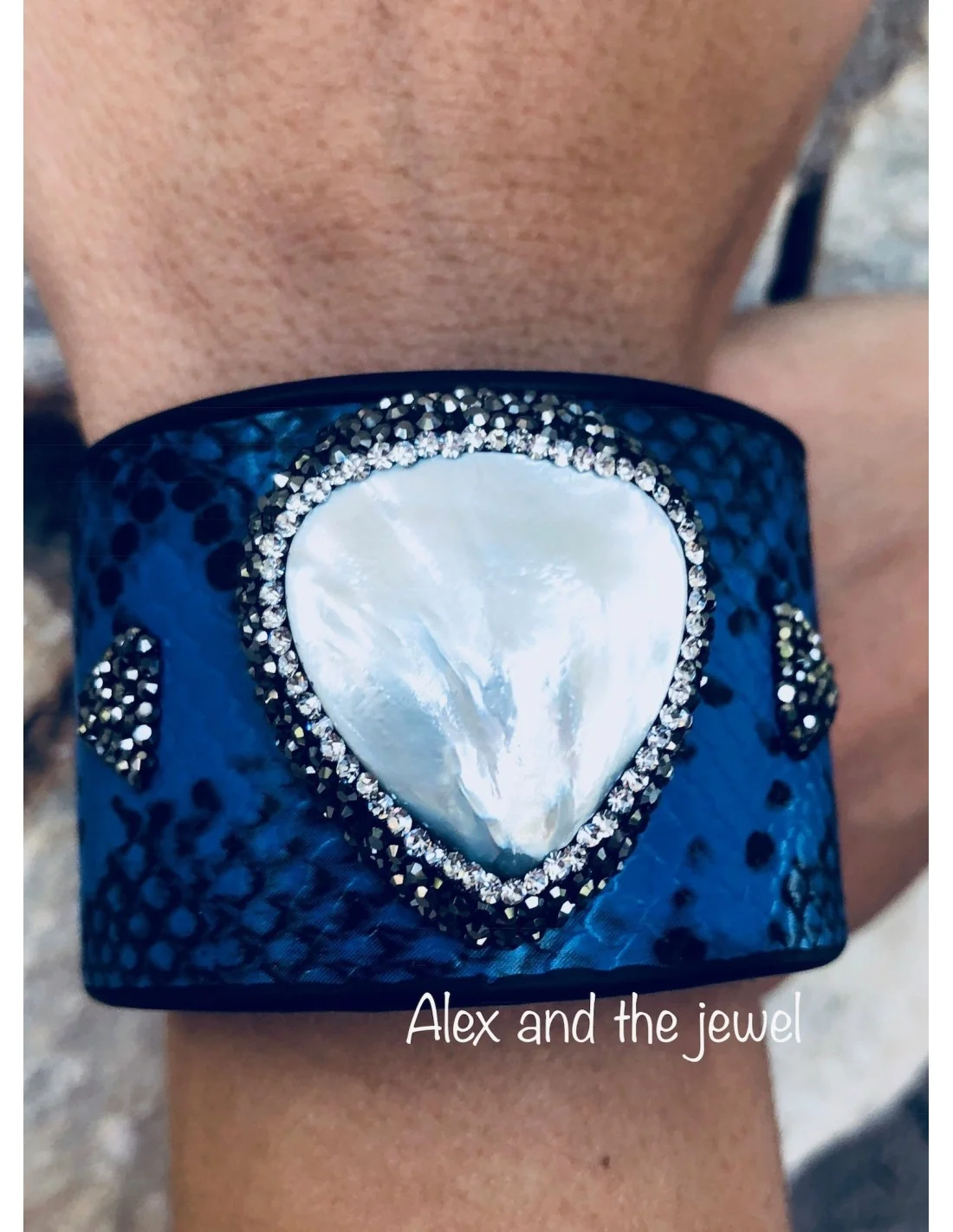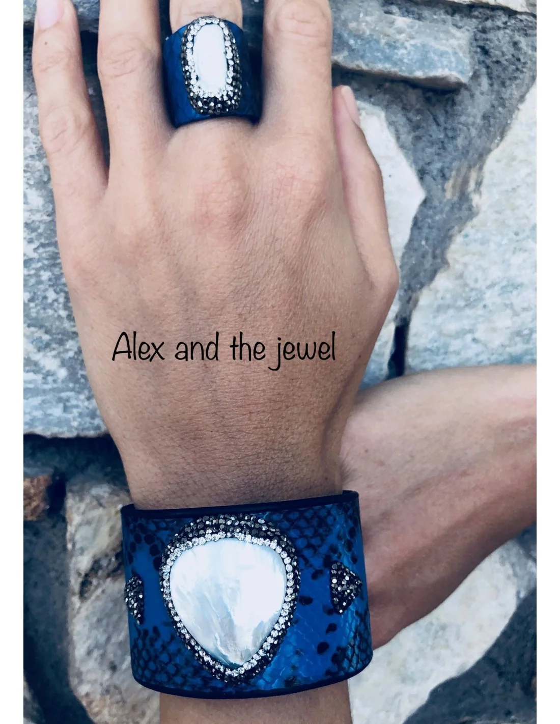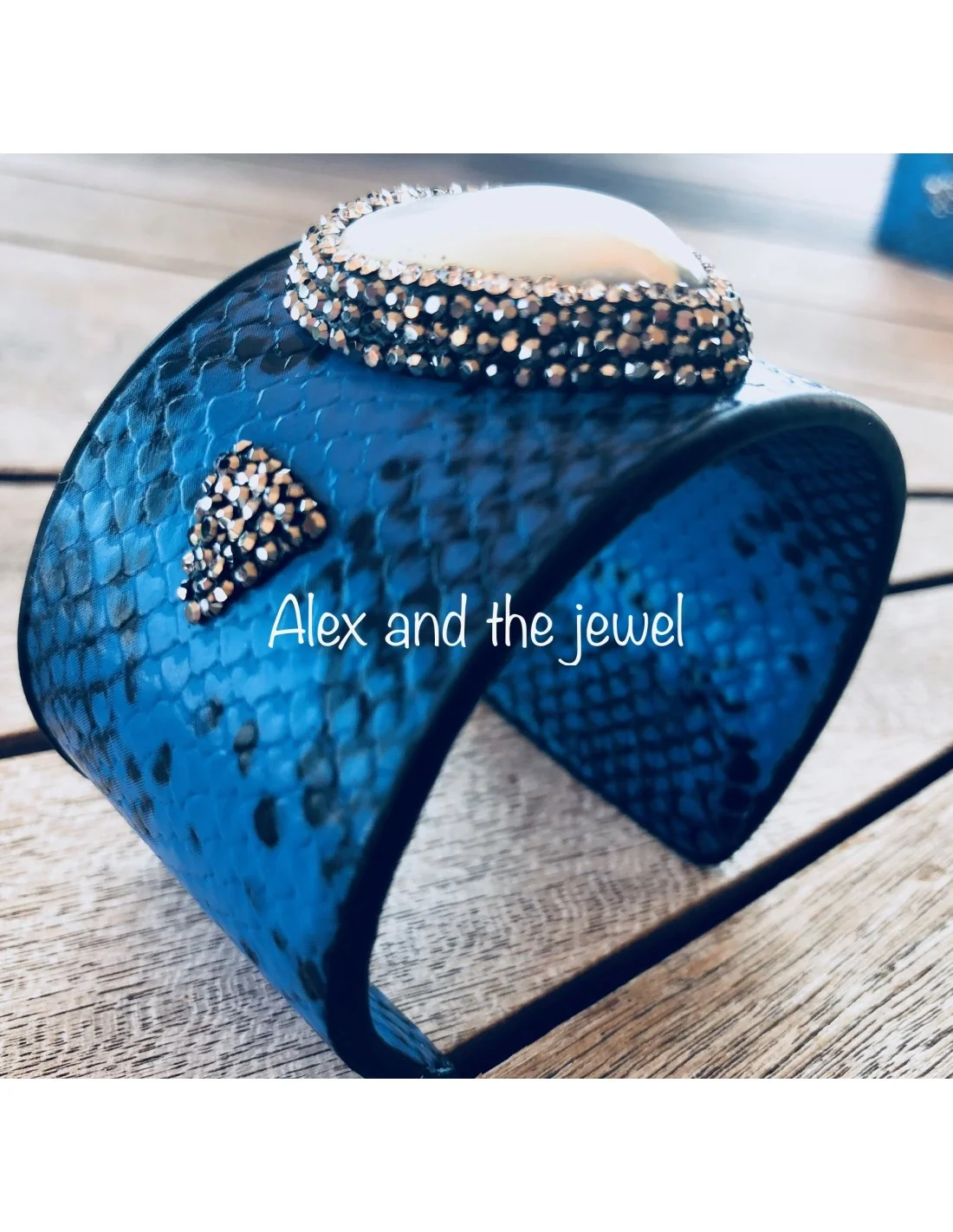 Αναδείξτε το στυλ σας με το εντυπωσιακό φαρδύ βραχιόλι "Blue Snake", φτιαγμένο από υψηλής ποιότητας δέρμα φιδιού σε μπλε απόχρωση.