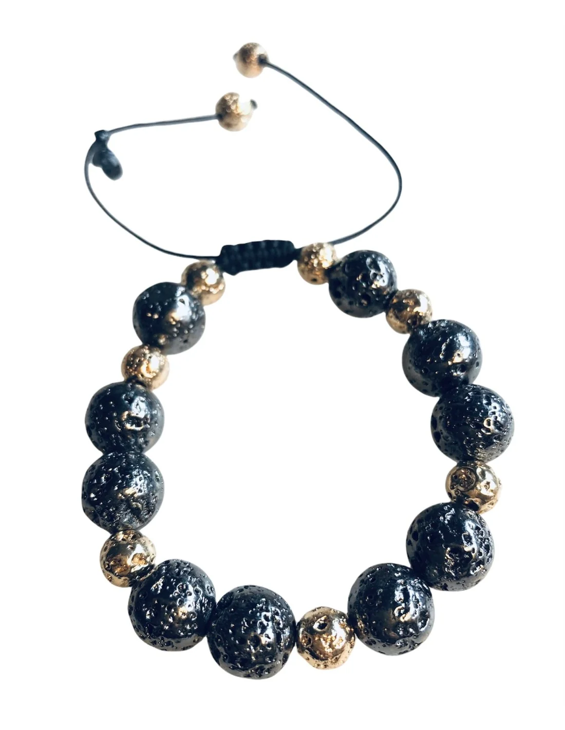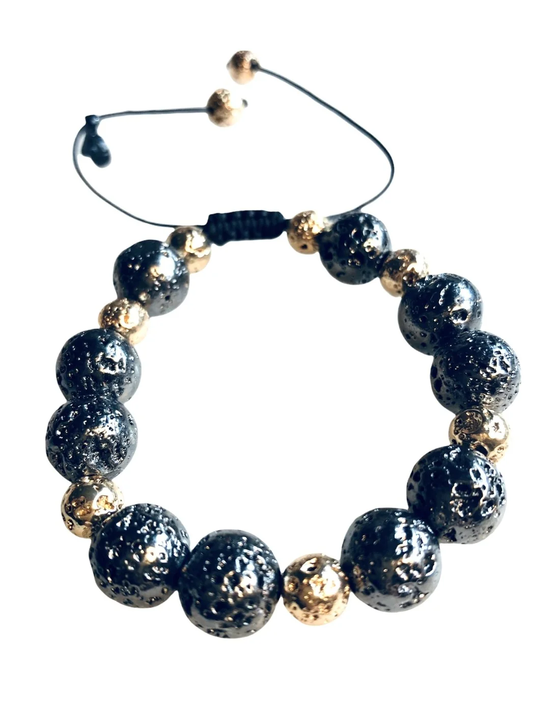 Χειροποίητο γυναικείο βραχιόλι με πέτρες ορυκτής λάβας σε εντυπωσιακή ανθρακί και χρυσή μεταλλική απόχρωση.