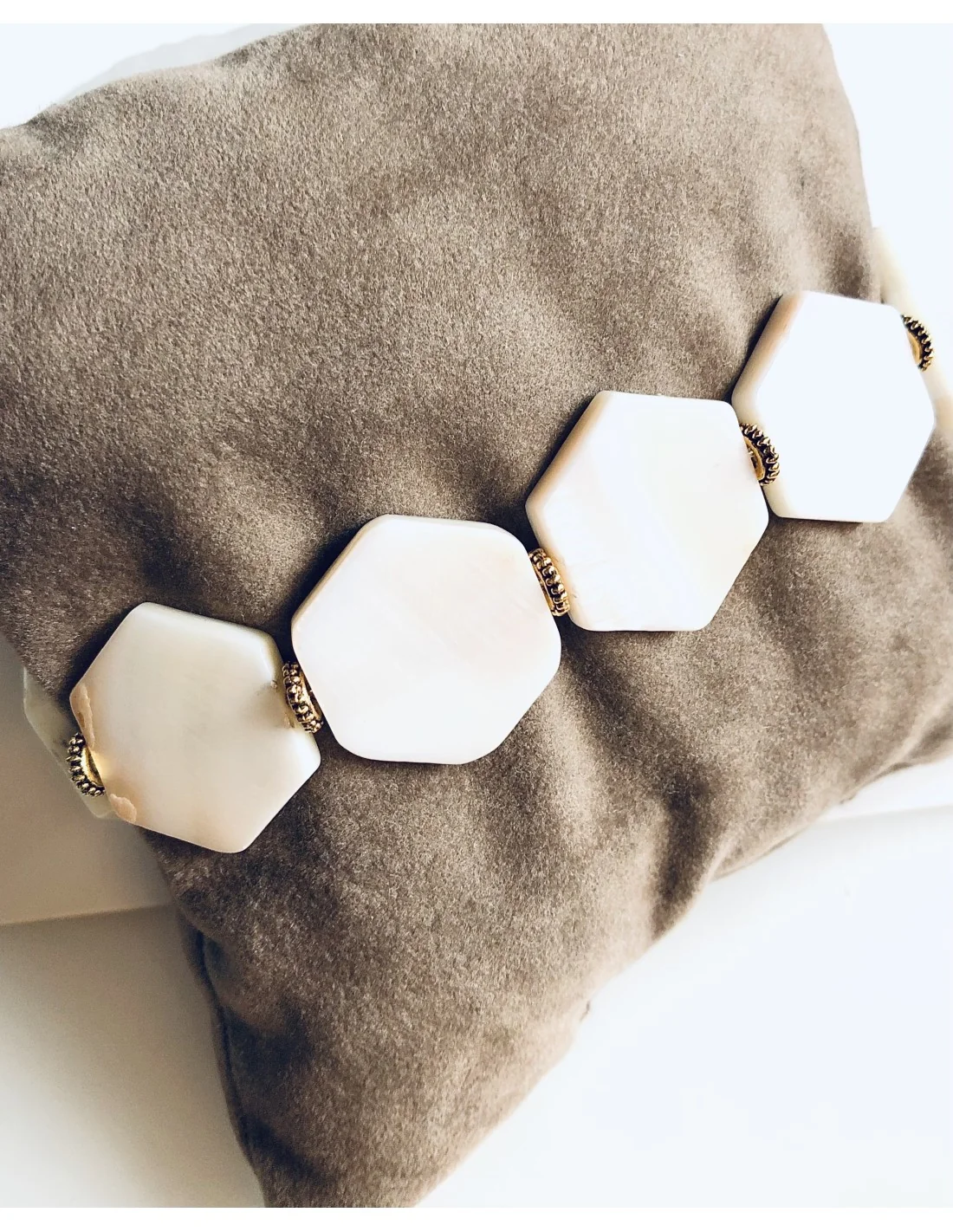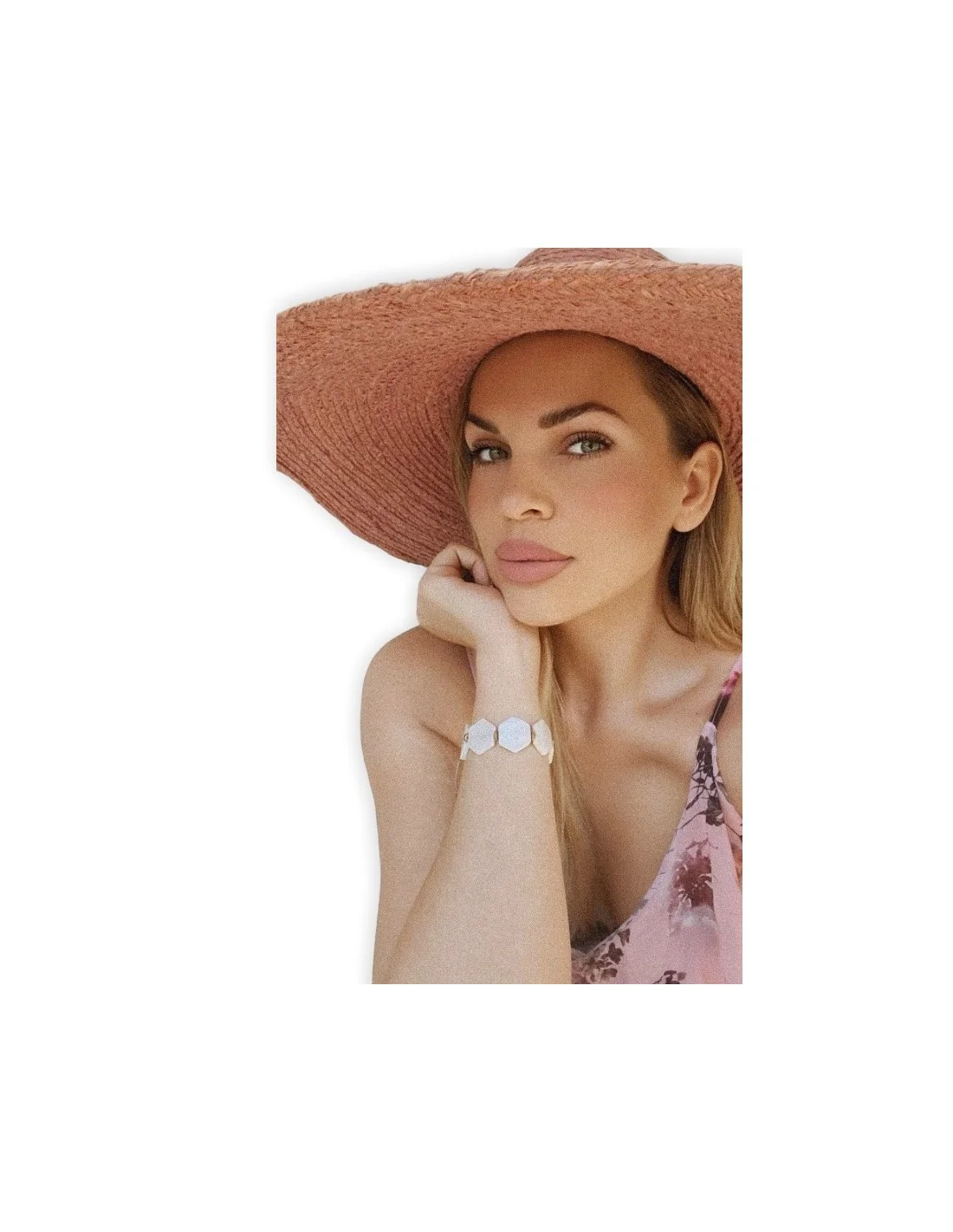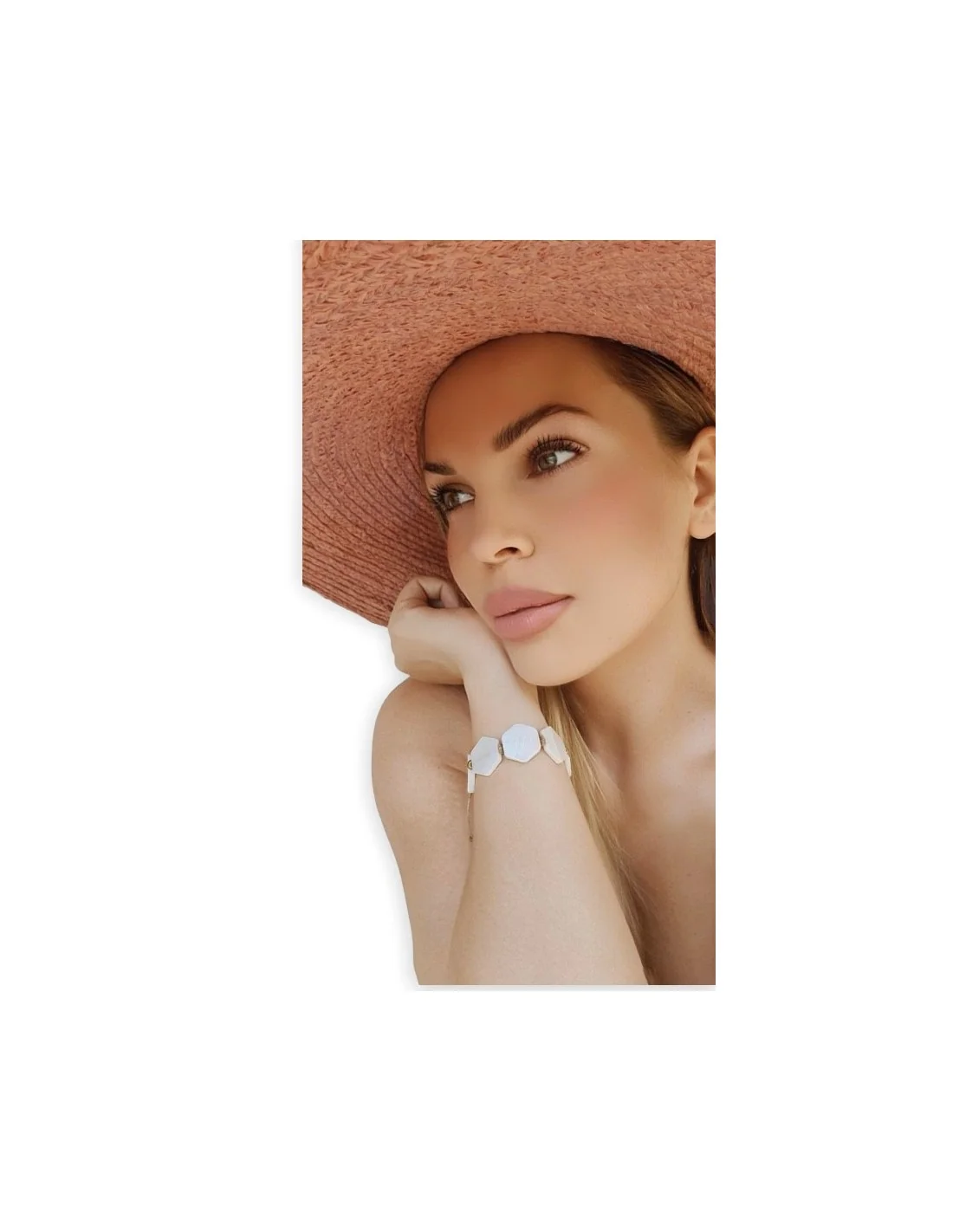 Αυτό το χειροποίητο γυναικείο βραχιόλι αποτελείται από κομψές εξάγωνες πλάκες φίλντισι που δημιουργούν ένα μοναδικό γεωμετρικό σχέδιο, προσφέροντας φυσική λάμψη και φινέτσα.