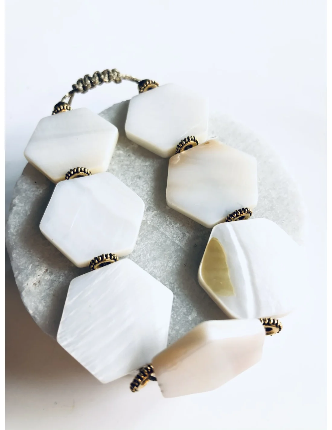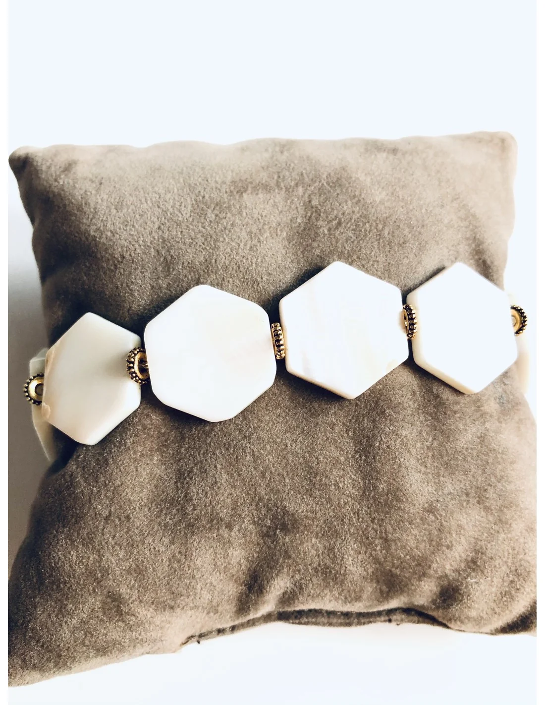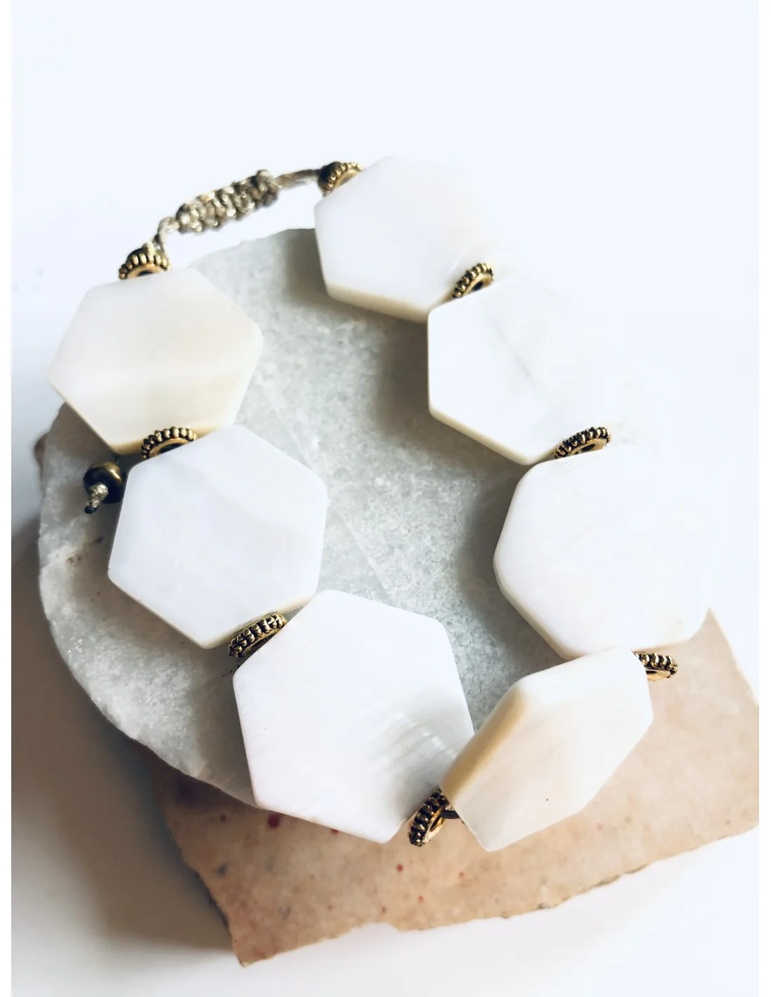 Αυτό το χειροποίητο γυναικείο βραχιόλι αποτελείται από κομψές εξάγωνες πλάκες φίλντισι που δημιουργούν ένα μοναδικό γεωμετρικό σχέδιο, προσφέροντας φυσική λάμψη και φινέτσα.