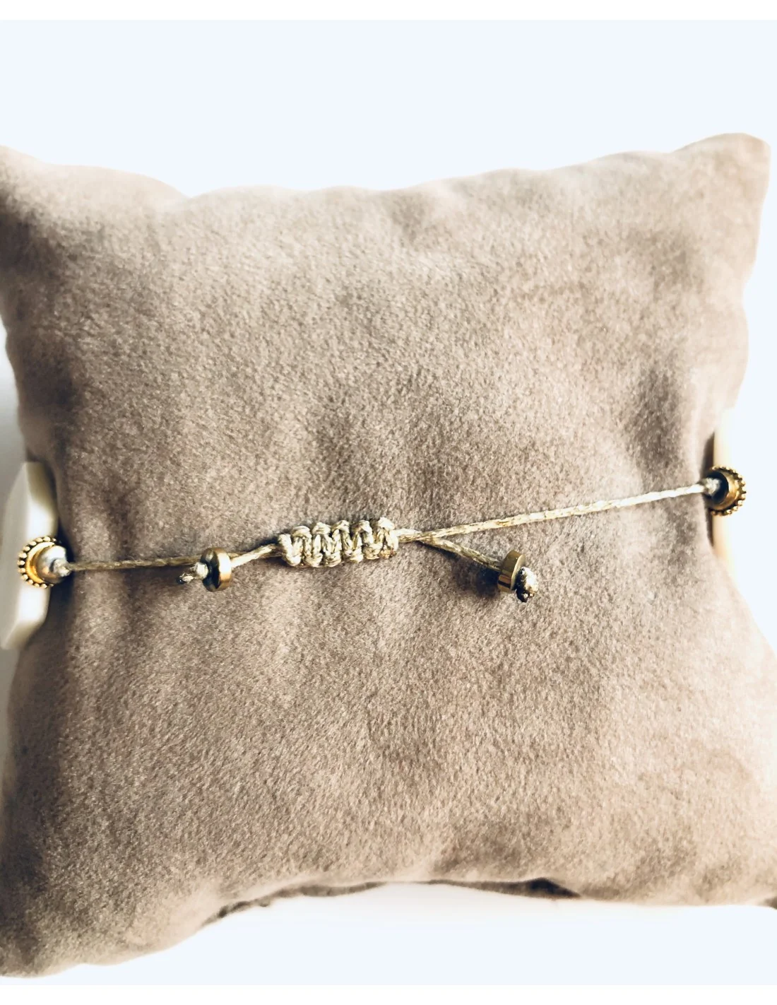 Οι ροδέλες από επιχρυσωμένο ορείχαλκο που τοποθετούνται ανάμεσα στις πλάκες προσθέτουν μια πολυτελή πινελιά, ενώ το χρυσό κερωμένο νήμα ολοκληρώνει το design με αυξομείωση για τέλεια εφαρμογή στον καρπό σας.