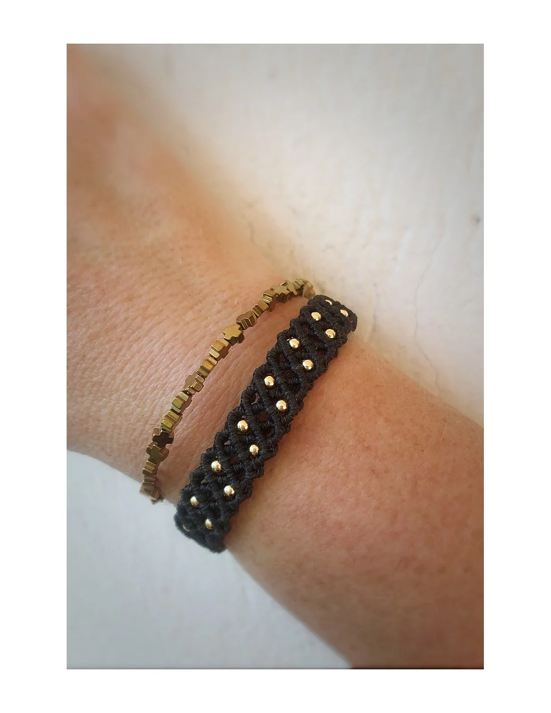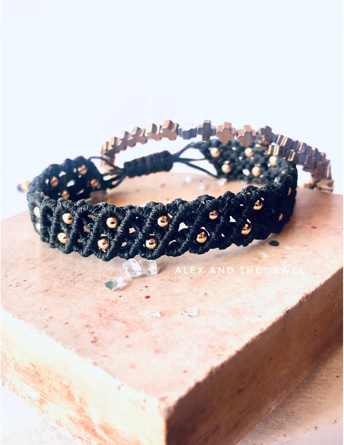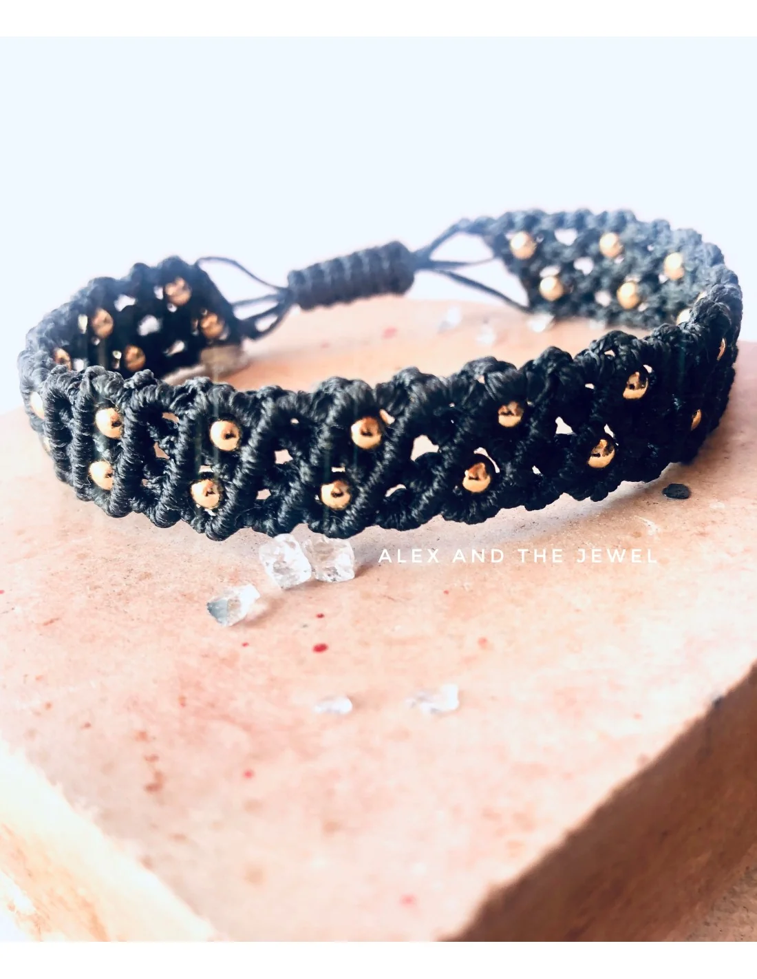 Χειροποίητο γυναικείο βραχιόλι με ιδιαίτερη πλέξη μακραμέ σε μαύρη γκρι απόχρωση και επίχρυσες χαντρούλες εσωτερικά Rome