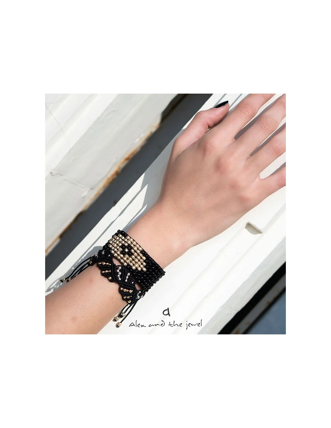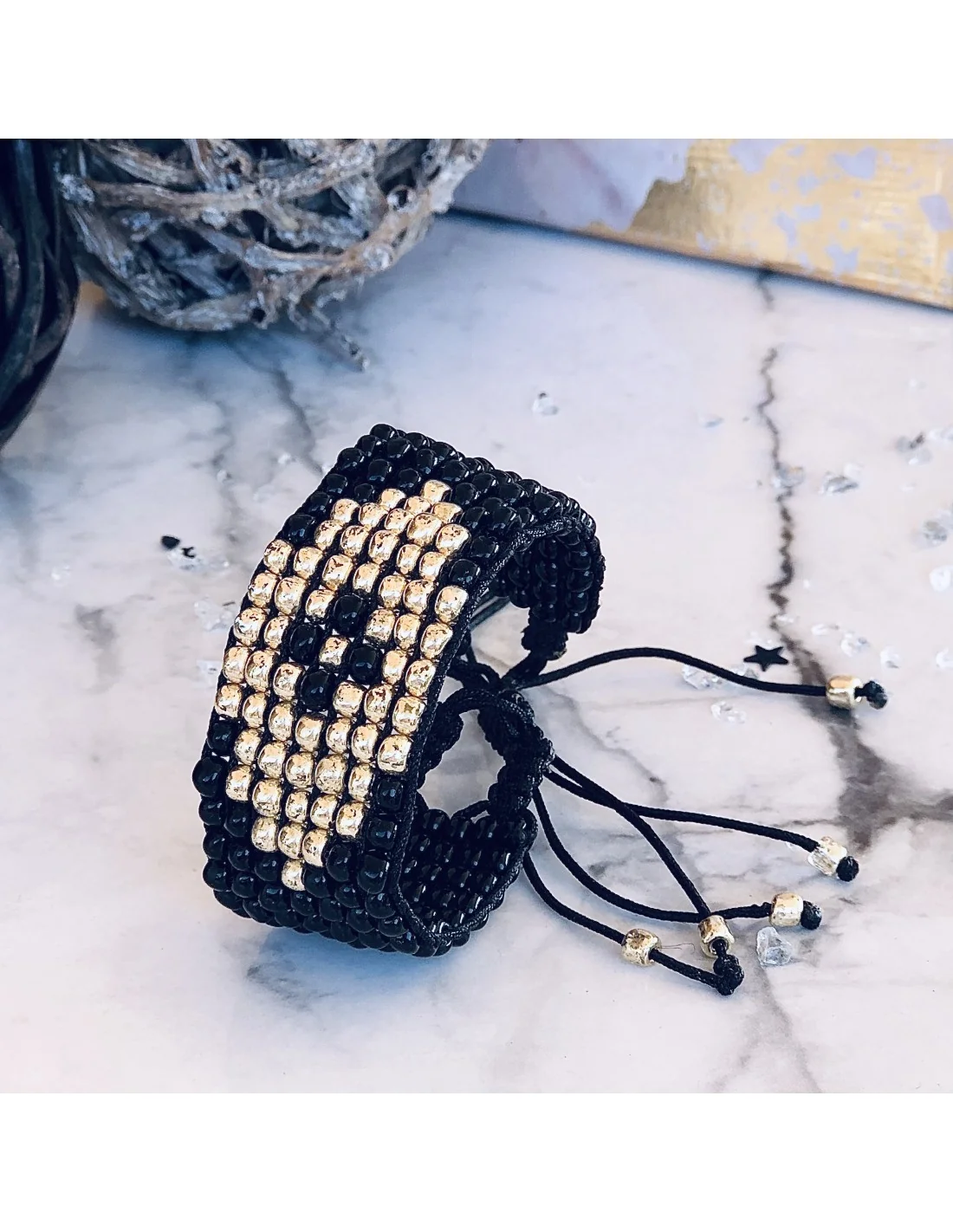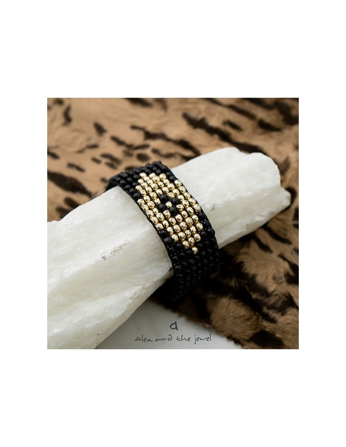 Χειροποίητο πολύσειρο γυναικείο βραχιόλι με χάντρες σε μαύρο και χρυσό που σχηματίζουν ένα κομψό σχέδιο μάτι στο κέντρο.