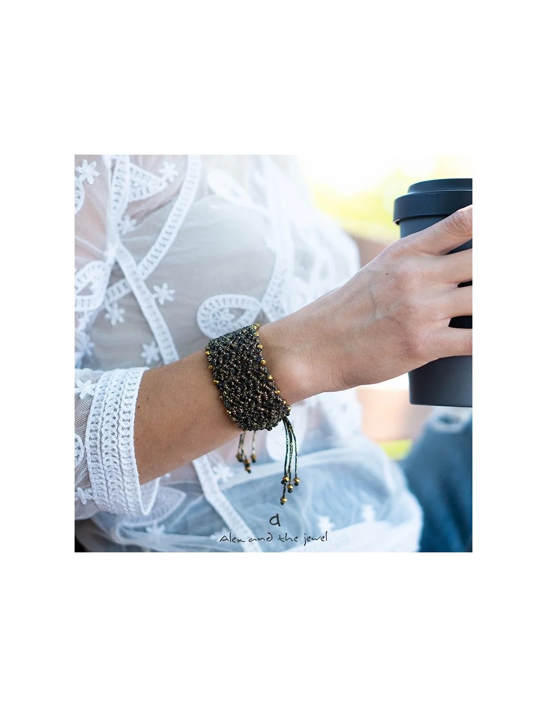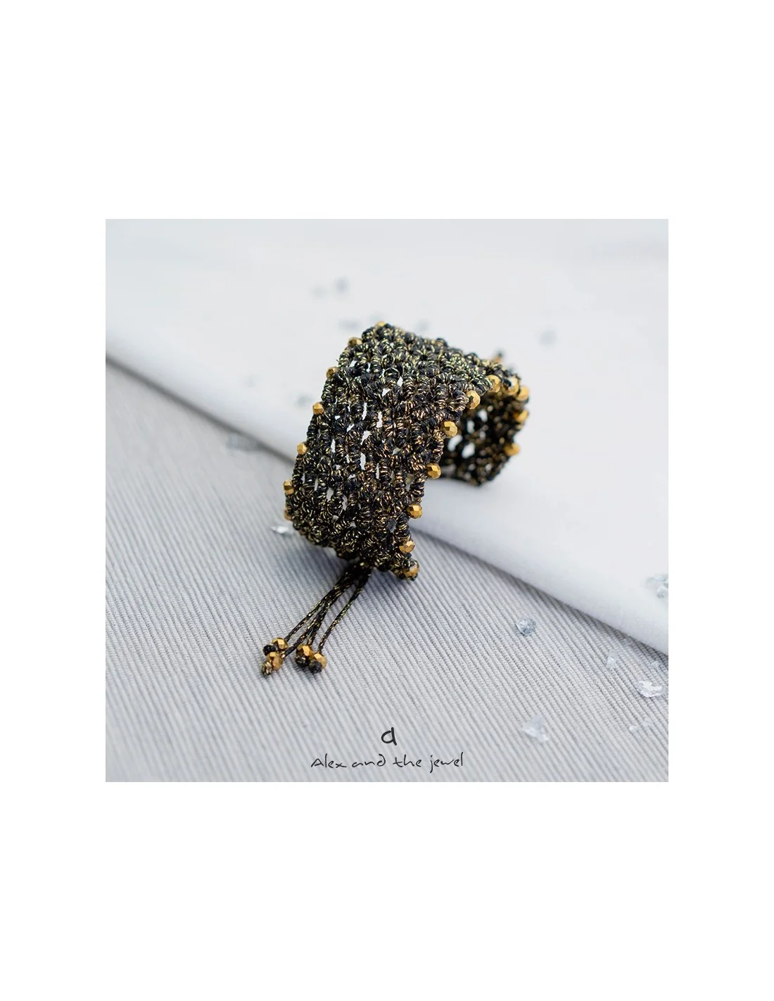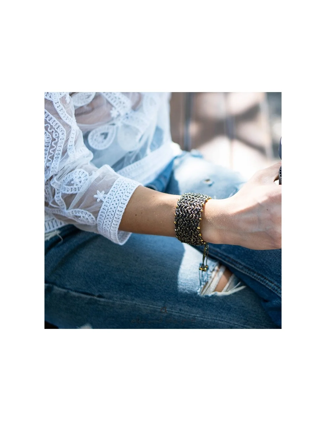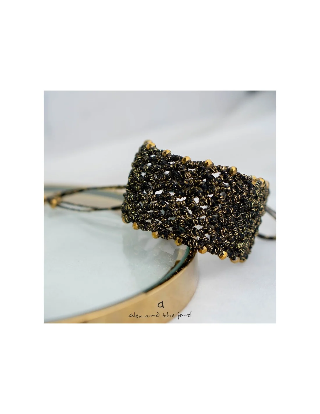 Χειροποίητο φαρδύ βραχιόλι πλεγμένο στο χέρι με διπλή κηροκλωστή σε κομψούς χρωματισμούς χρυσού και μαύρου.