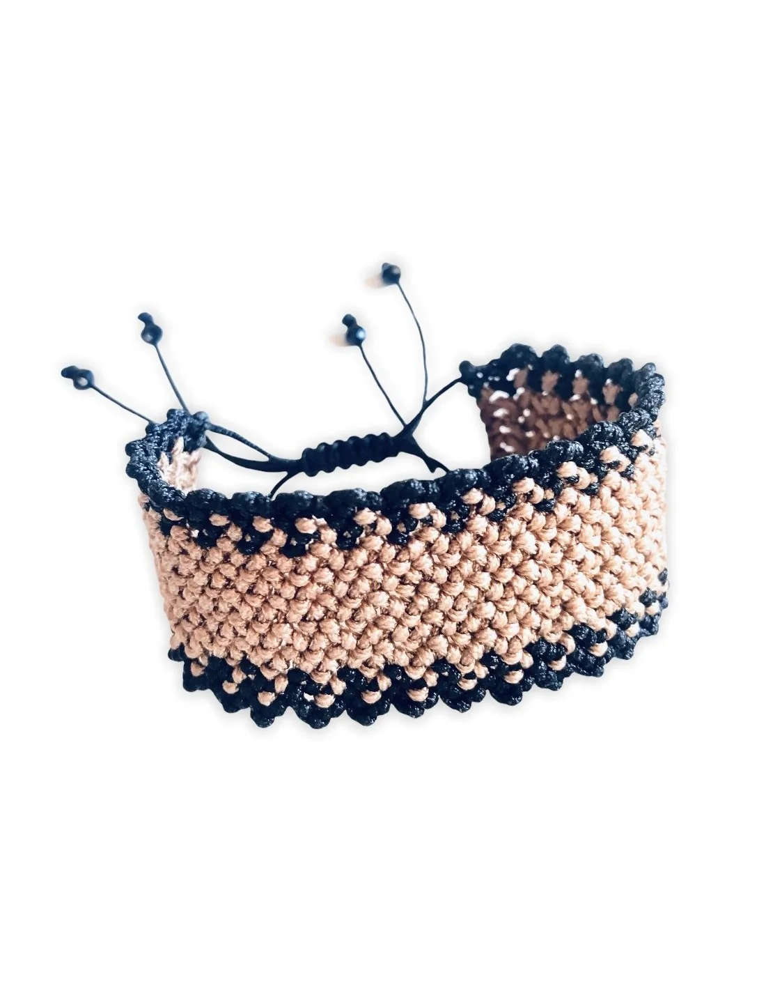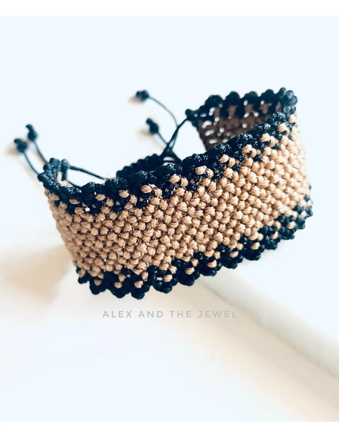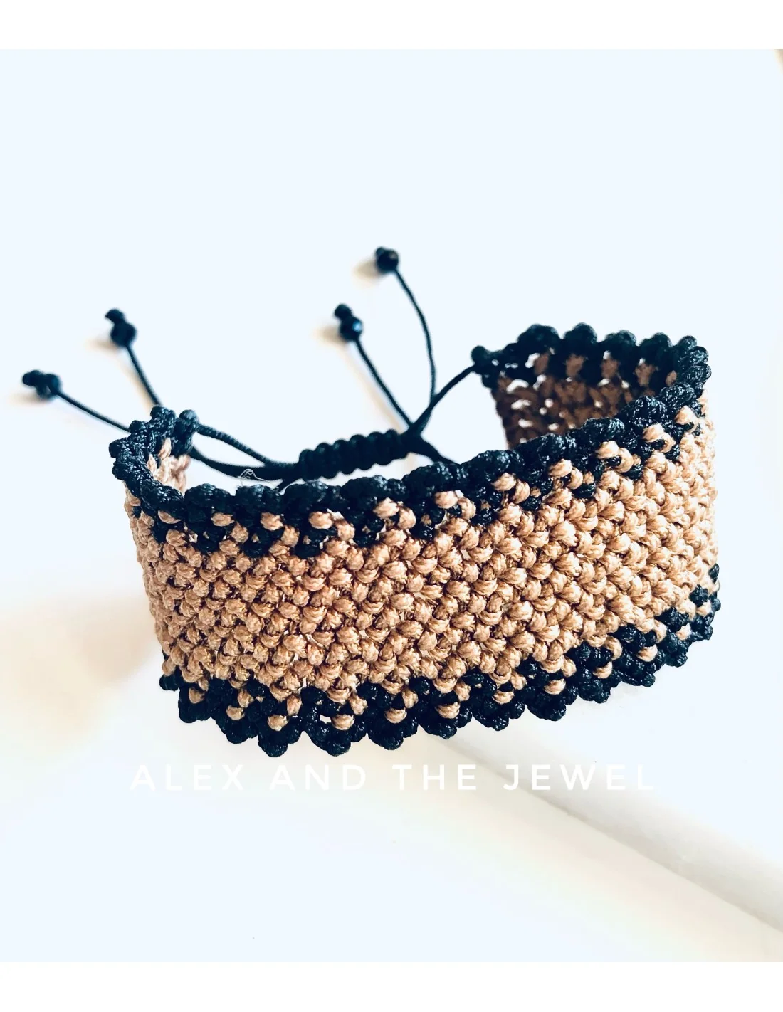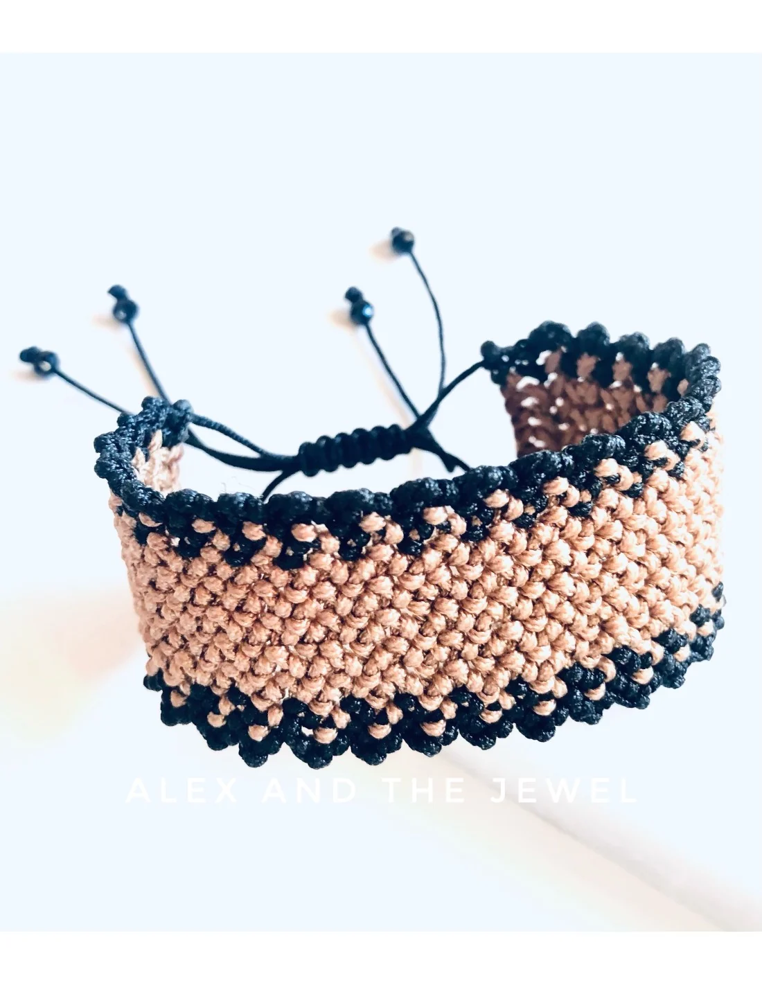Πλεγμένο στο χέρι με μεράκι, το βραχιόλι διαθέτει ένα εντυπωσιακό σχέδιο σε μπεζ και καφέ χρώματα, που συνδυάζεται αρμονικά με το μαύρο νήμα.