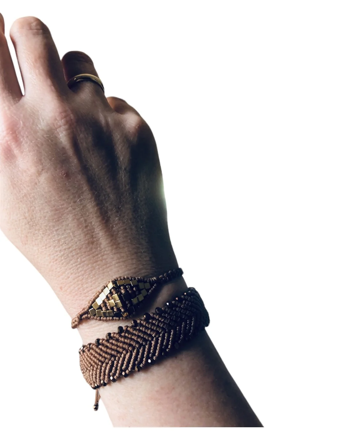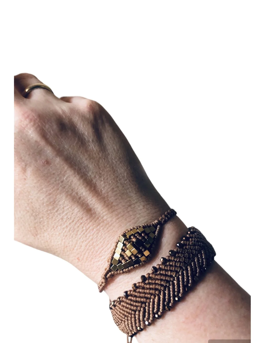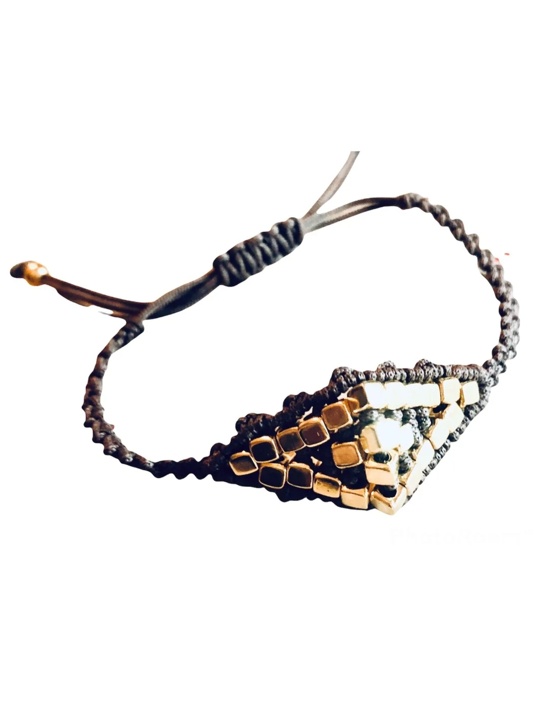 Χειροποίητο γυναικείο βραχιόλι μάτι μακραμέ χρυσό και καφέ με ημιπολύτιμες πέτρες Αιματίτη Eye contact