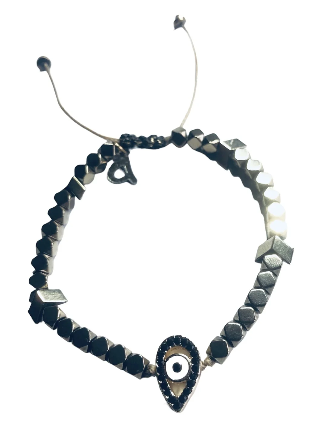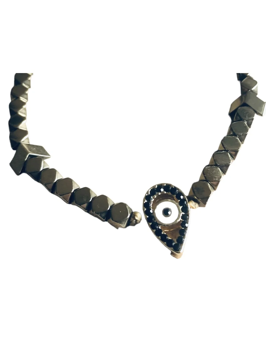 Αυτό το χειροποίητο γυναικείο βραχιόλι διαθέτει ένα κομψό κεντρικό στοιχείο μάτι σε σχήμα σταγόνας, το οποίο περιβάλλεται από μαύρα ζιργκόν περιμετρικά για μια λαμπερή και εντυπωσιακή εμφάνιση.