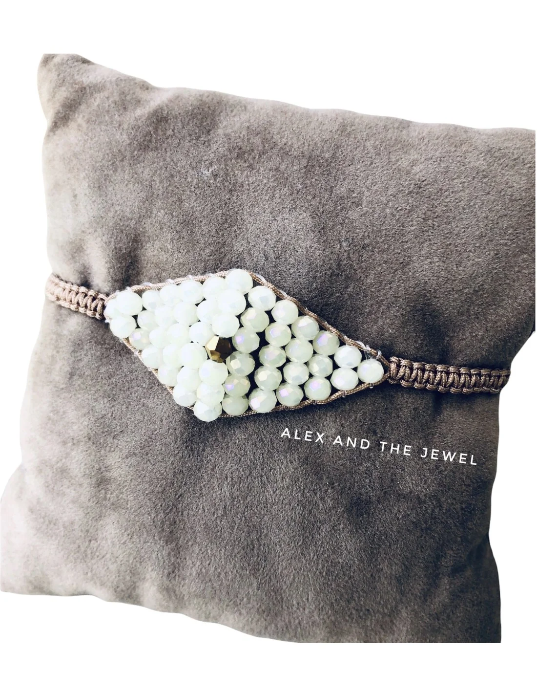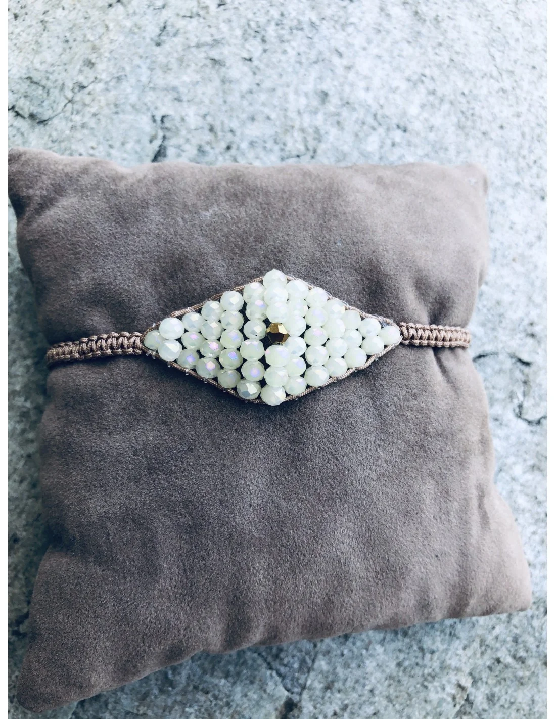 Ανακαλύψτε την κομψότητα του χειροποίητου γυναικείου βραχιόλι μακραμέ, που φέρει κρύσταλλα σε μπεζ χρώμα, σχηματισμένα σε σχέδιο μάτι.
