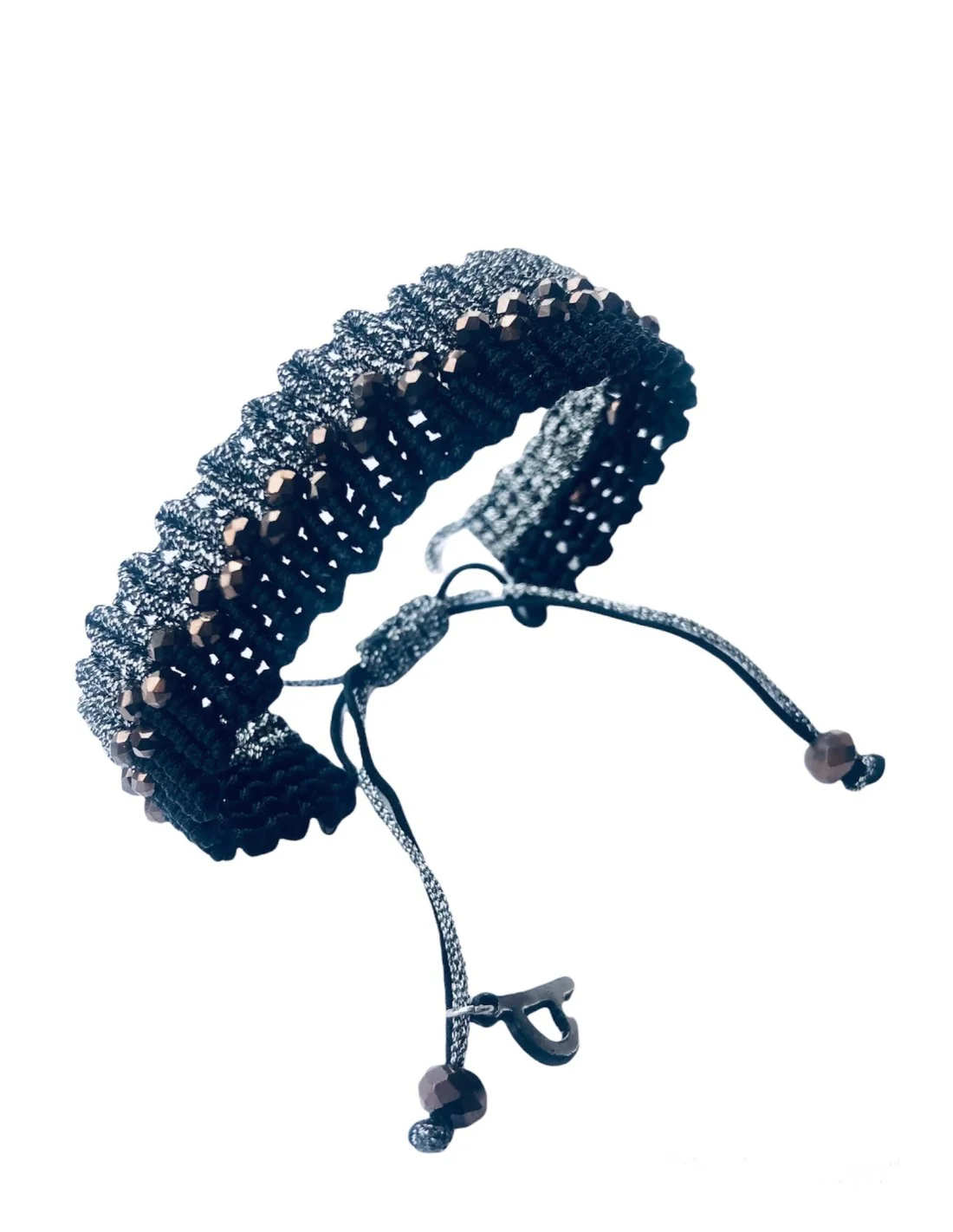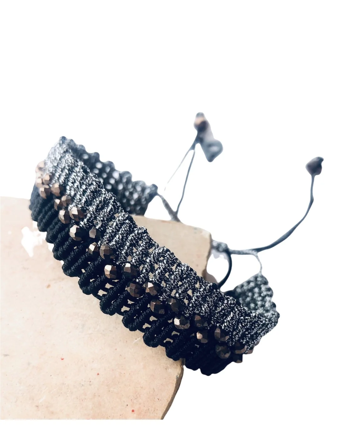 Ανακαλύψτε το εντυπωσιακό χειροποίητο γυναικείο βραχιόλι Prague, πλεγμένο στο χέρι με την τεχνική πλέξης μακραμέ σε δύο αποχρώσεις, γκρι και μαύρο.