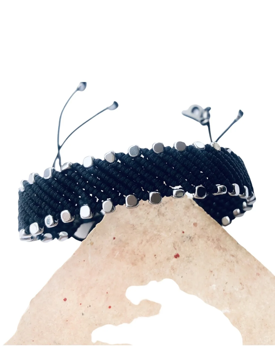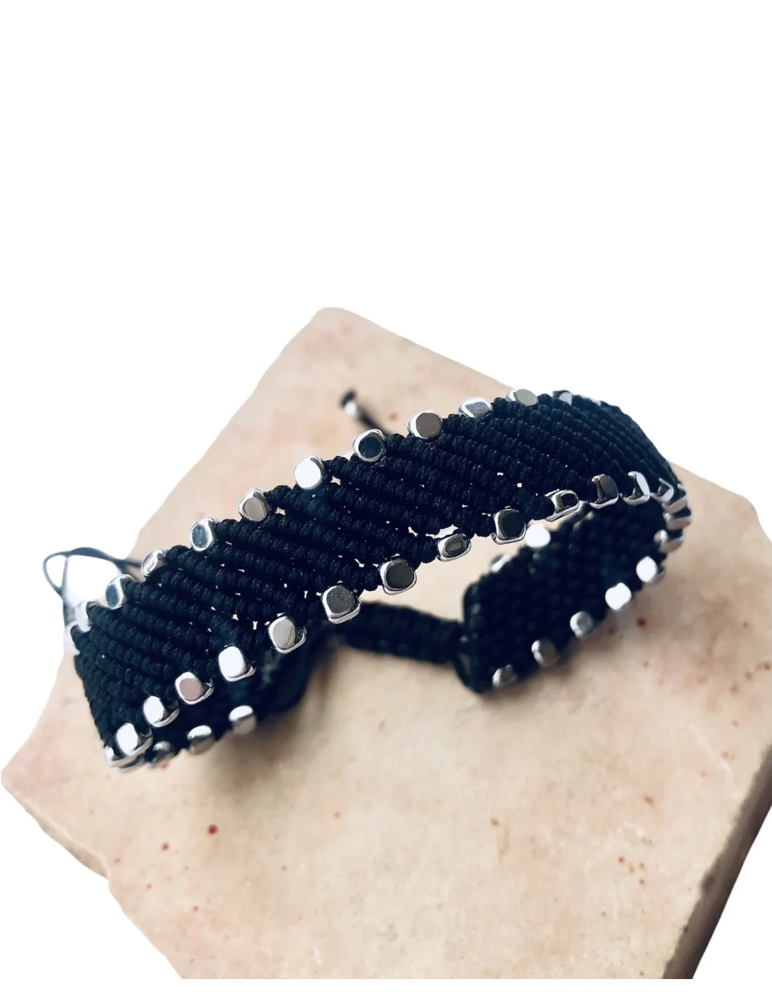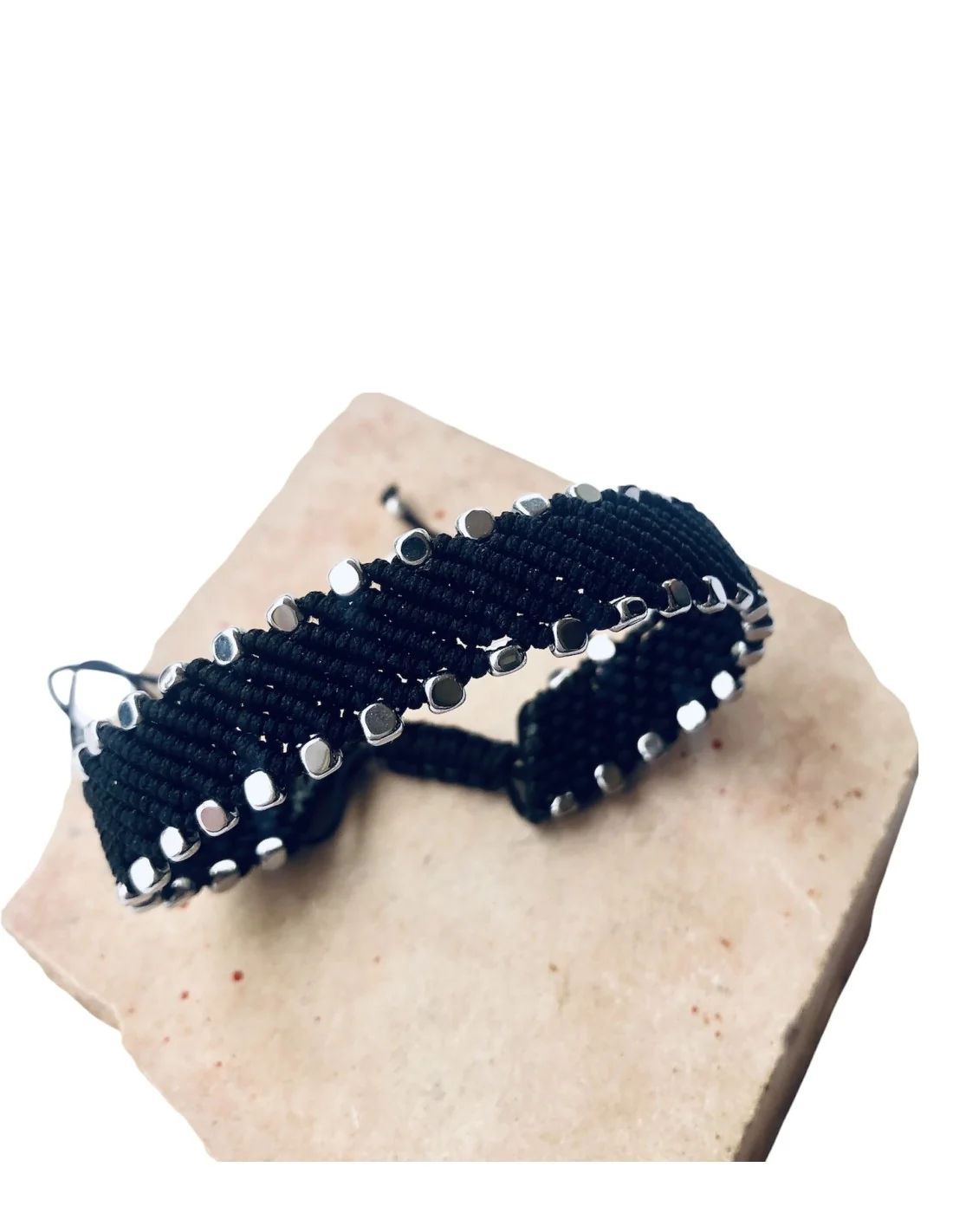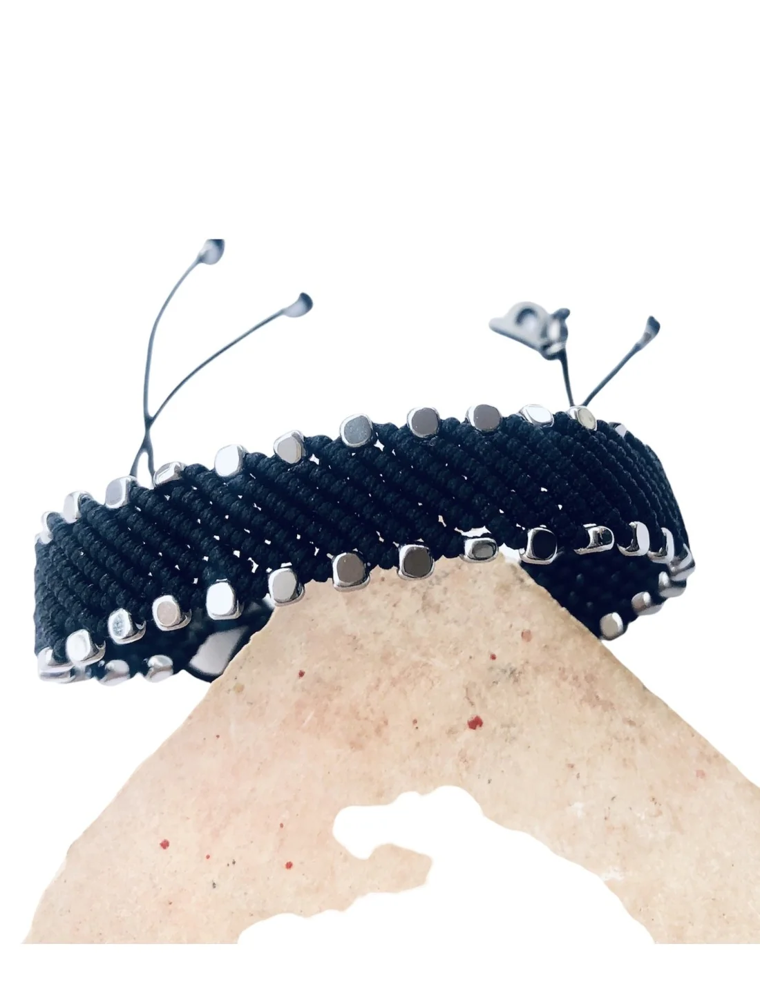 Ανακαλύψτε το κομψό χειροποίητο βραχιόλι Shannon, πλεγμένο στο χέρι με την τεχνική μακραμέ σε μαύρο χρώμα.