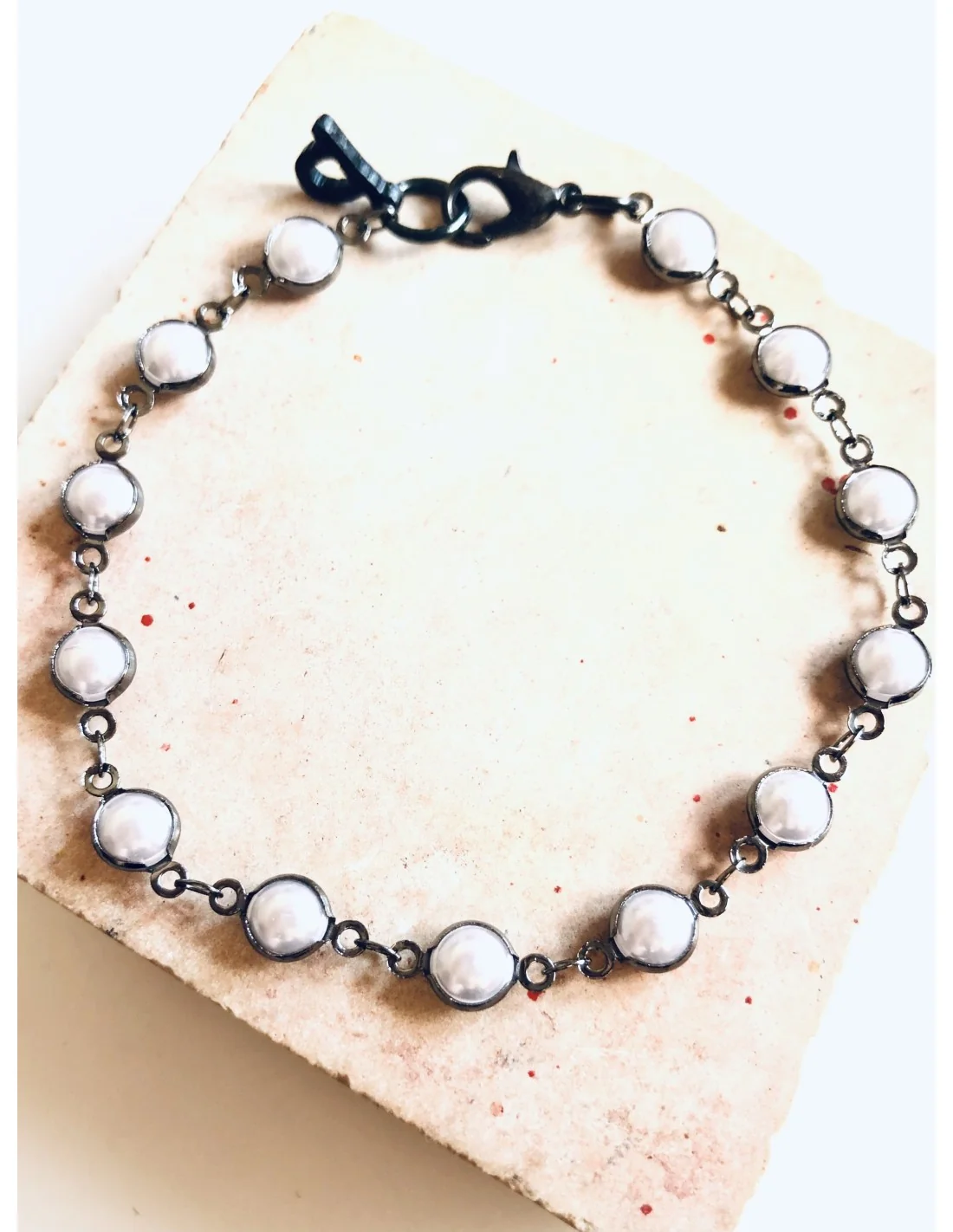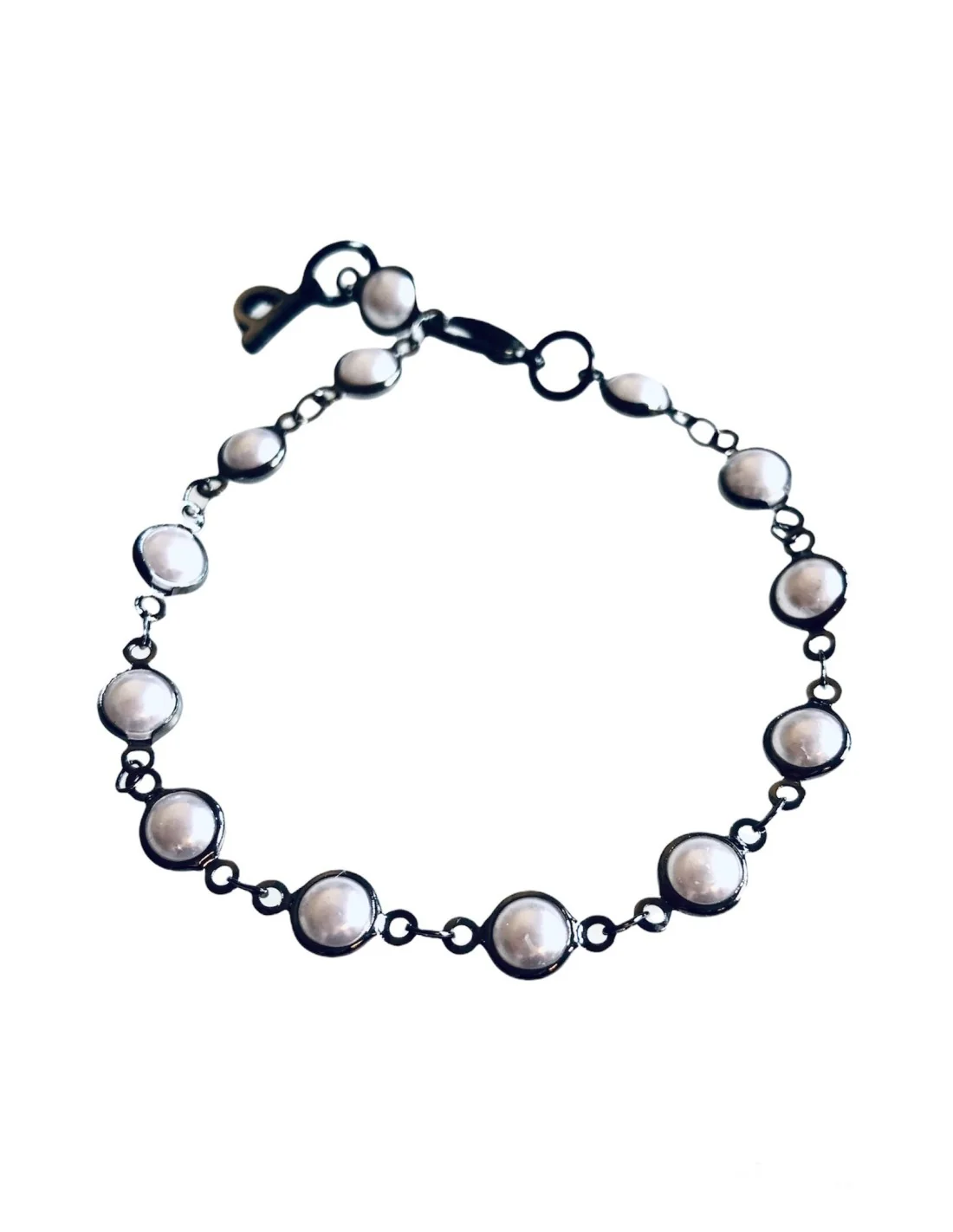 Αυτό το κομψό χειροποίητο γυναικείο βραχιόλι συνδυάζει την ανθεκτικότητα της αλυσίδας από ατσάλι με την κλασική ομορφιά των πέρλων.