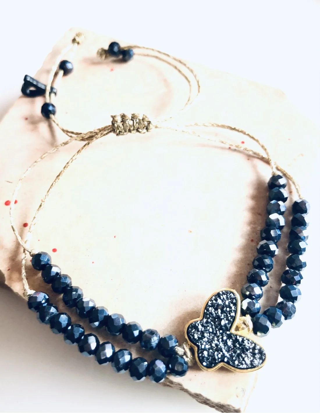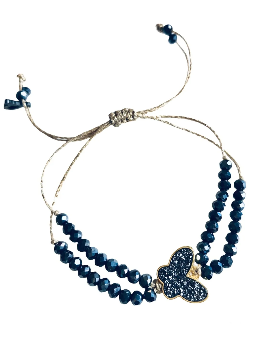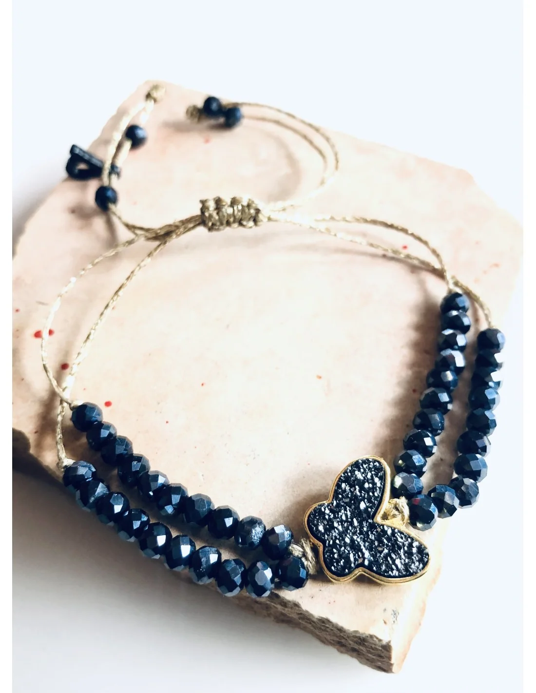 Το χρυσό κερωμένο νήμα προσδίδει κομψότητα και αντοχή, ενώ τα κρύσταλλα Τσεχίας σε blue black απόχρωση ολοκληρώνουν το μοναδικό του design.