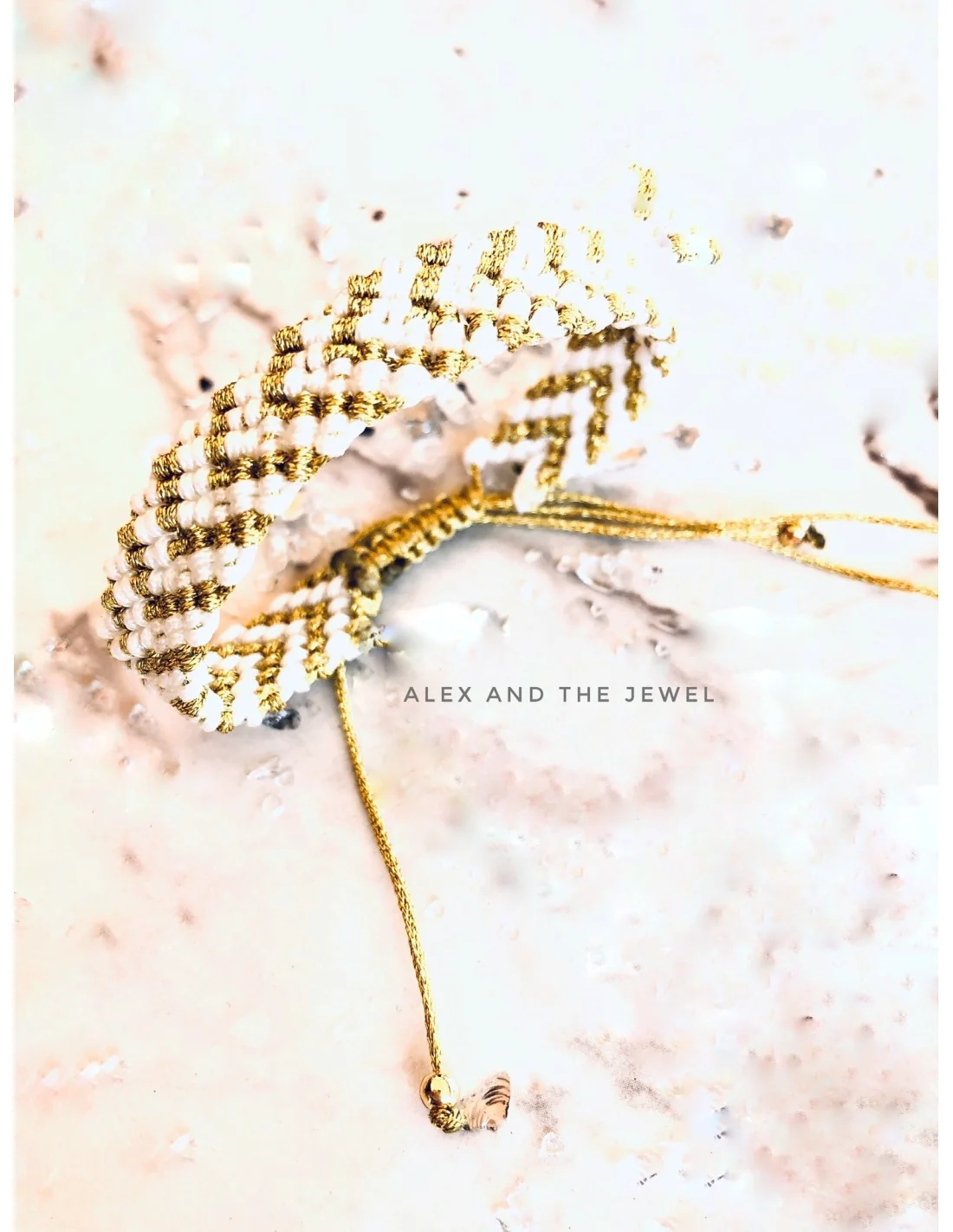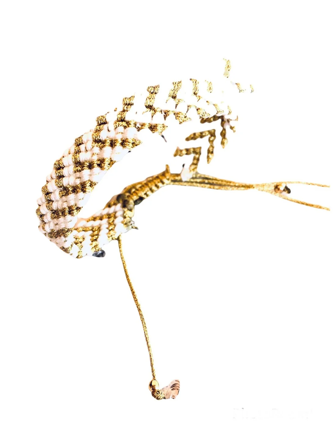Χειροποίητο γυναικείο βραχιόλι μακραμέ σε λευκό και χρυσό σε σχέδιο ψαροκόκκαλο και αυξομείωση στο τελείωμα Fedora