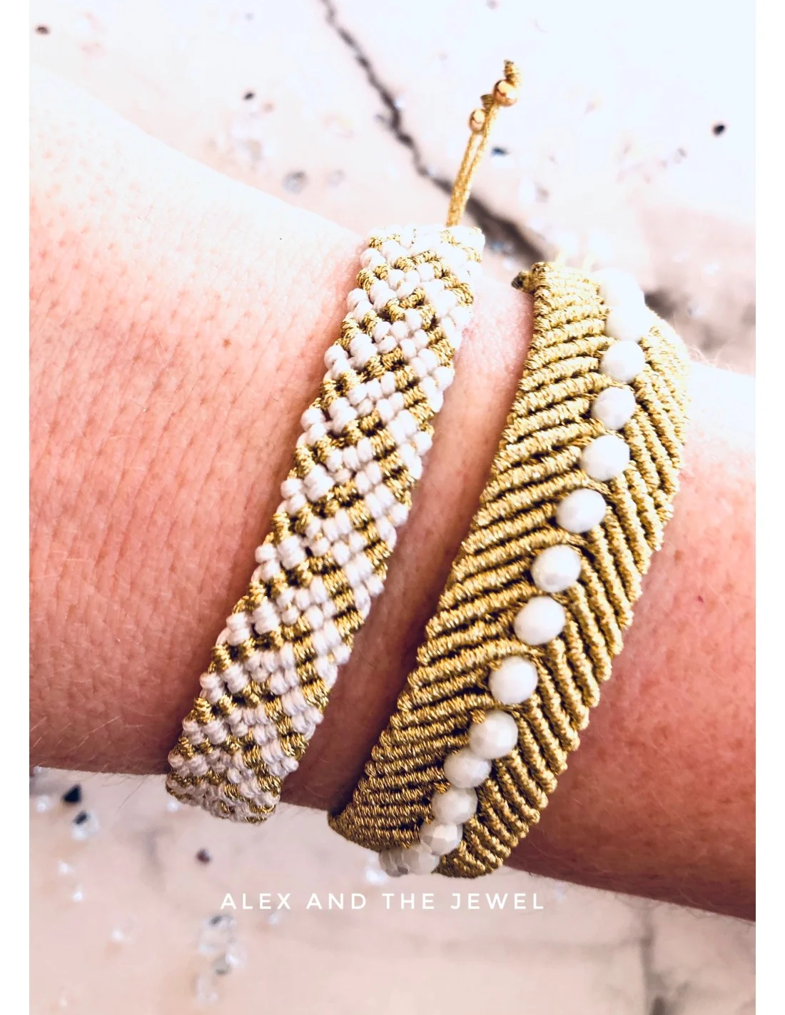 Το χειροποίητο βραχιόλι Fedora είναι πλεγμένο στο χέρι με μακραμέ τεχνική και συνδυάζει δύο εκλεπτυσμένα χρώματα, το λευκό και το χρυσό.