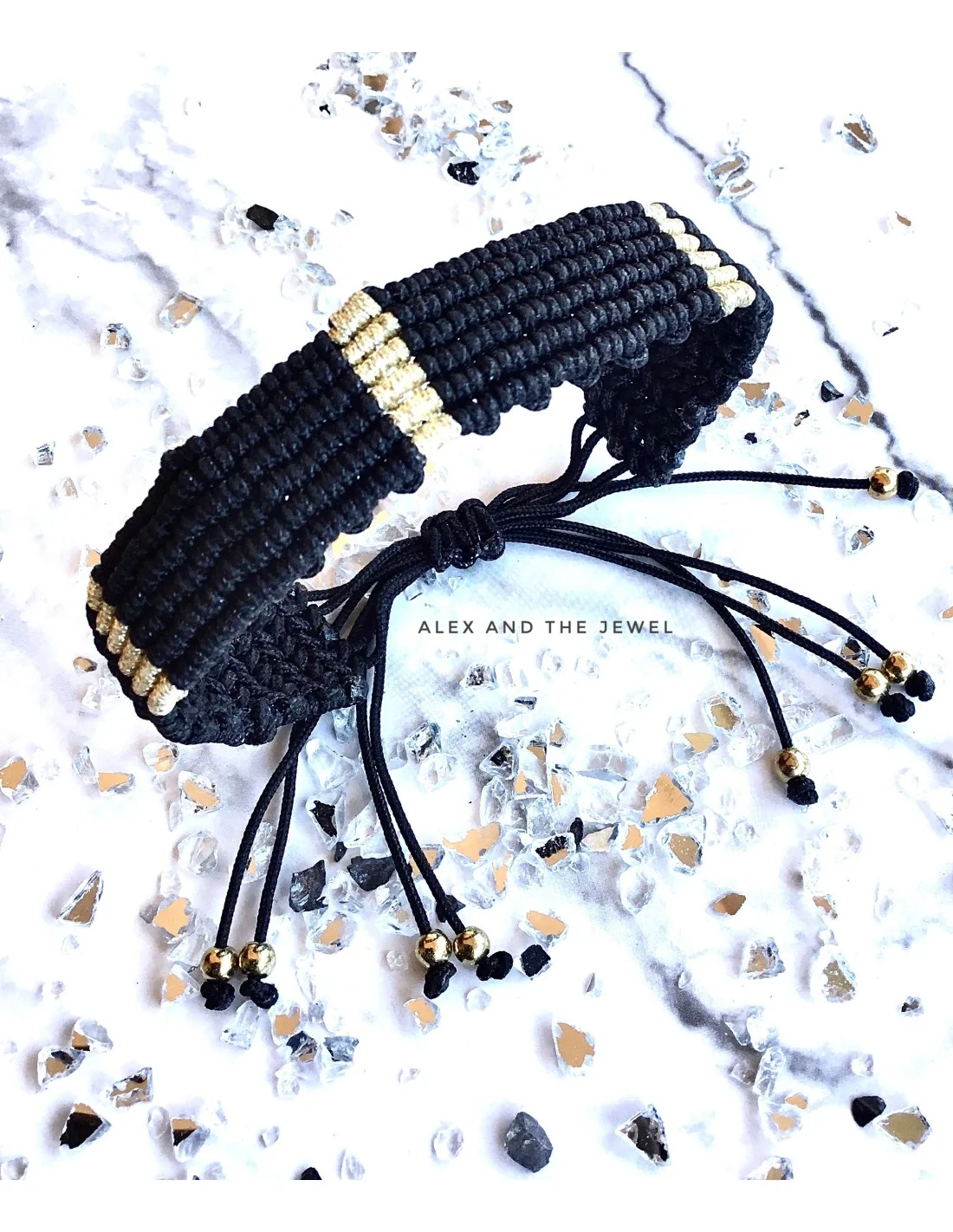 Ανακαλύψτε το χειροποίητο γυναικείο βραχιόλι Axel, πλεγμένο στο χέρι με μοναδικές τεχνικές μακραμέ. Κατασκευασμένο από μαύρο και χρυσό κορδόνι, αυτό το βραχιόλι συνδυάζει τη κομψότητα με τη μοντέρνα σχεδίαση. Οι διακοσμητικές επίχρυσες μπίλιες στις άκρες προσθέτουν μια διακριτική λάμψη, καθιστώντας το ιδανικό για κάθε περίσταση.
