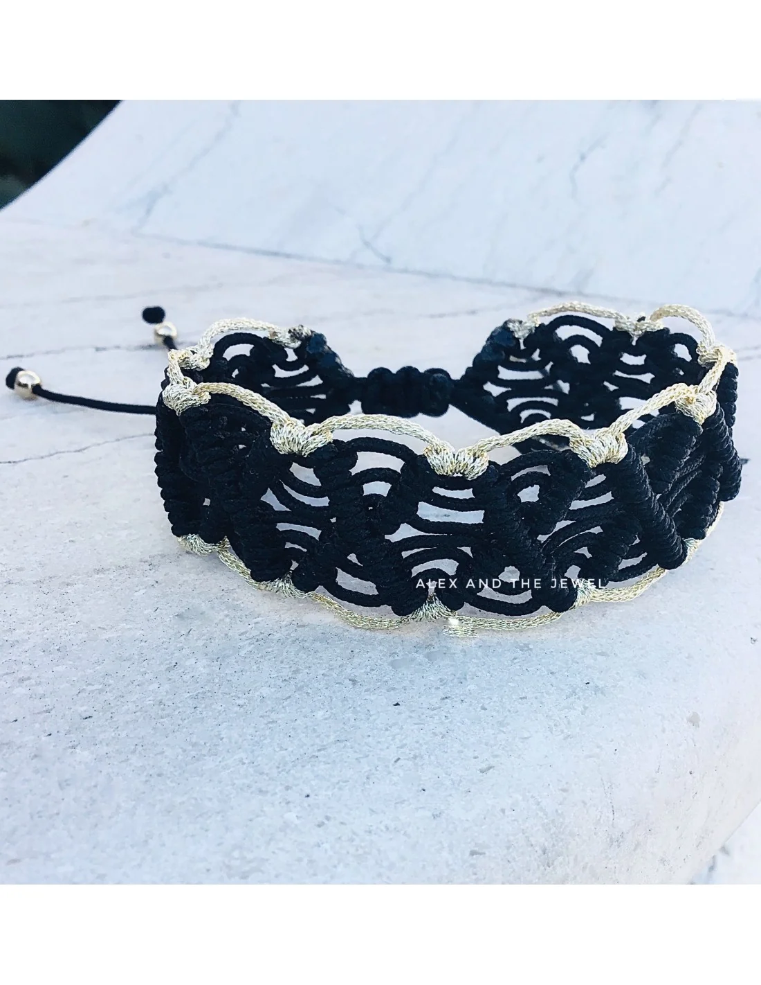Ανακαλύψτε το χειροποίητο γυναικείο βραχιόλι Fiona, πλεγμένο στο χέρι με τις μοναδικές τεχνικές μακραμέ. Το βραχιόλι αυτό διαθέτει μαύρο και χρυσό χρώμα, προσφέροντας μία κομψή και εντυπωσιακή αίσθηση. Το περίτεχνο σχέδιο του προσθέτει μία διάσταση πολυτέλειας, κάνοντάς το ιδανικό για κάθε περίσταση. Με μέγεθος με αυξομείωση, μπορείτε να το προσαρμόσετε τέλεια στο χέρι σας.