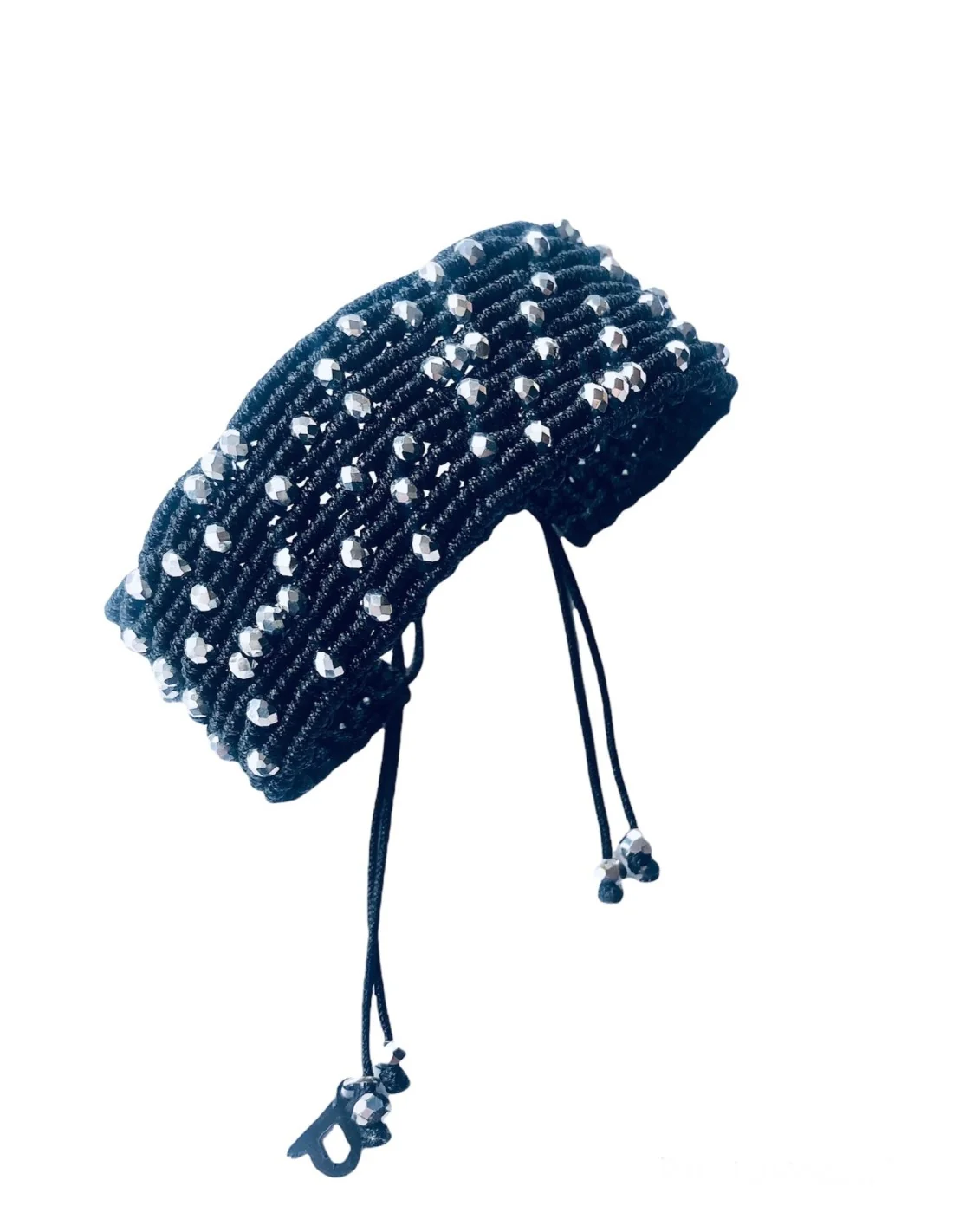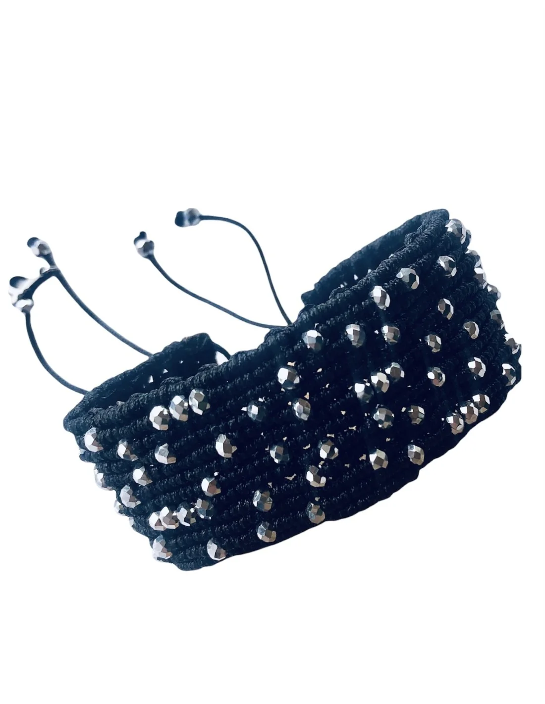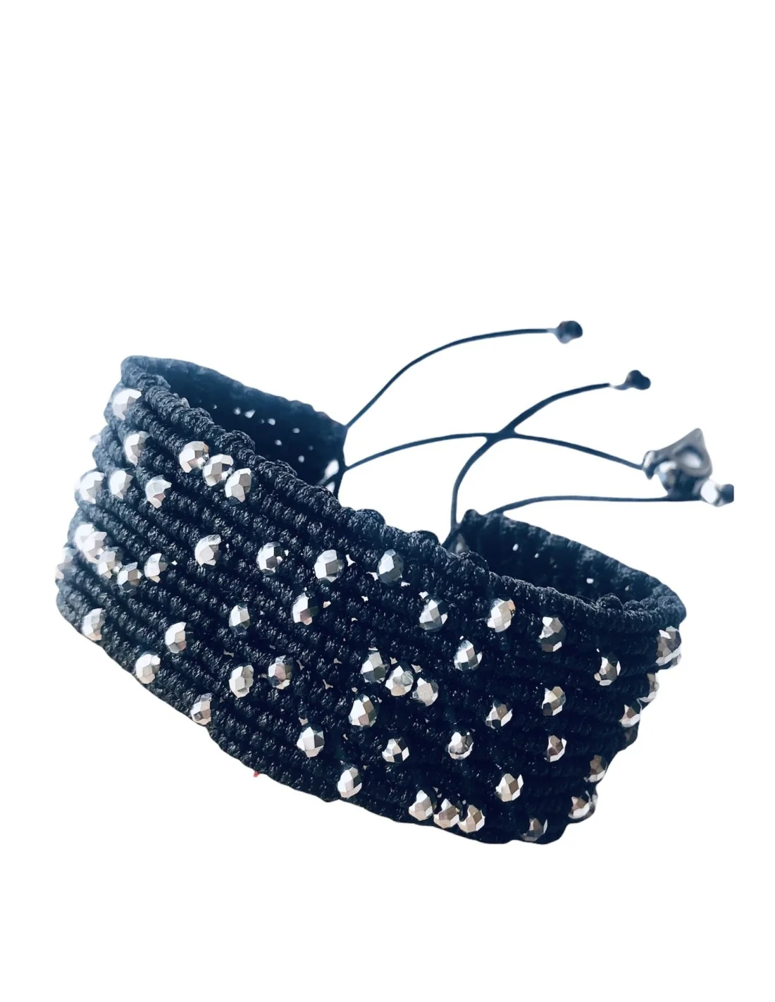 Χειροποίητο φαρδύ βραχιόλι σε μαύρο με πλέξη μακραμέ και διάσπαρτα διακοσμητικά κρύσταλλα Τσεχίας σε χρυσό και ασημί Deria