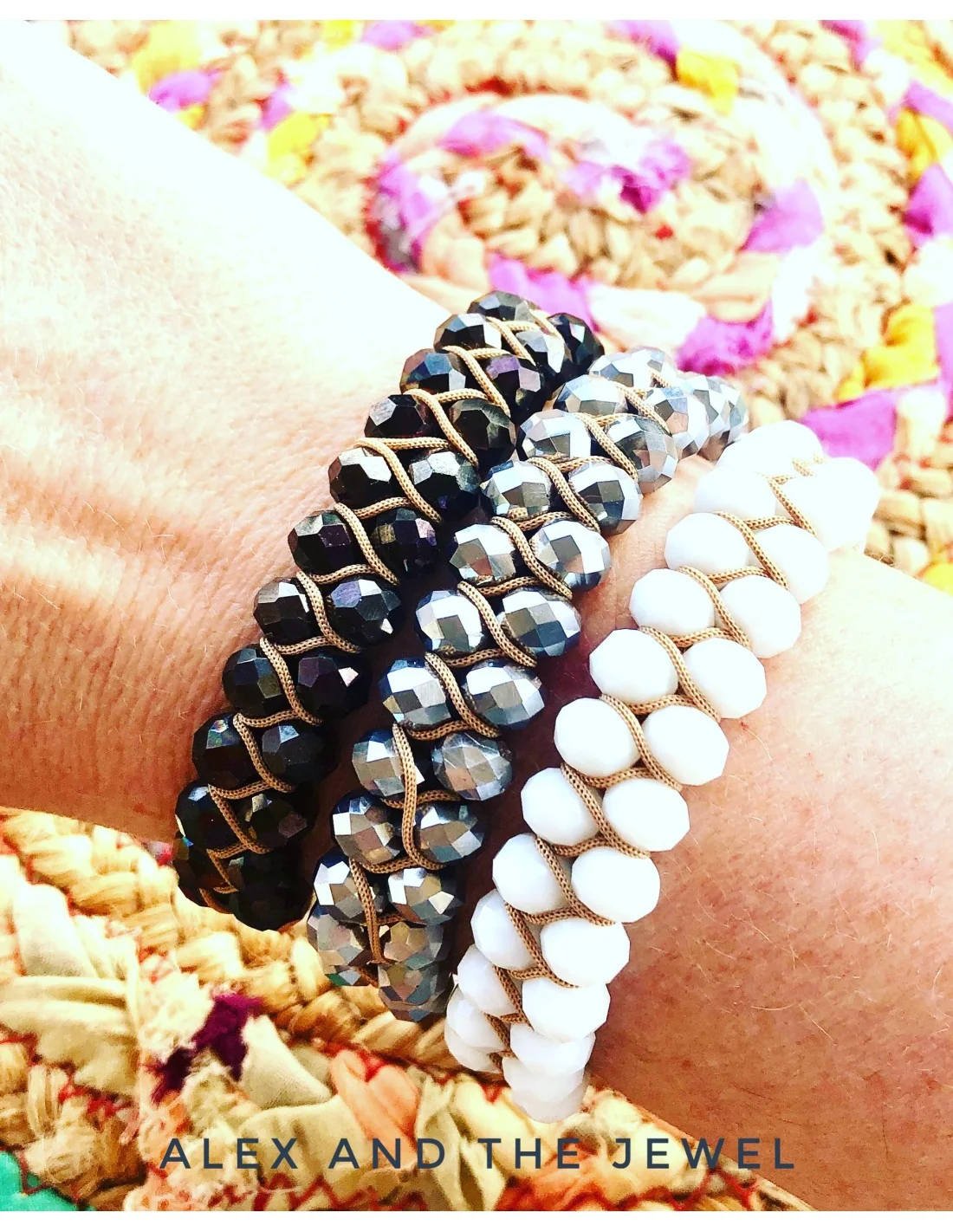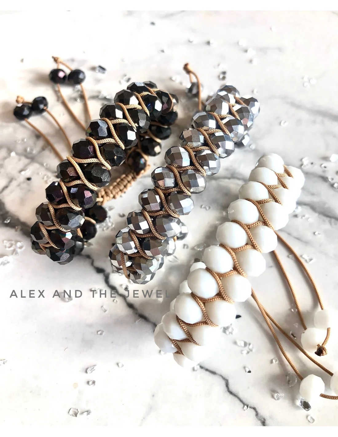 Πλεγμένο στο χέρι με κρύσταλλα Τσεχίας σε λευκό, ασημί ή μαύρο χρώμα, αυτό το βραχιόλι αναδεικνύει τη λαμπρότητα των υλικών του.