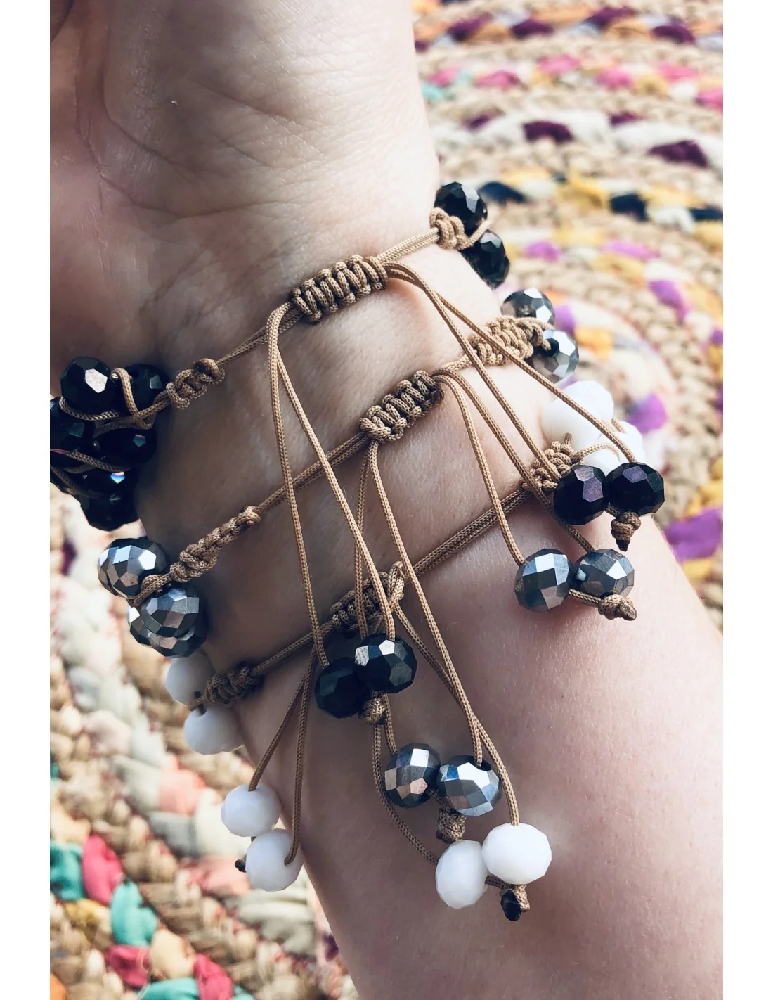Χειροποίητο γυναικείο βραχιόλι με κρύσταλλα Τσεχίας σε λευκό, ασημί ή μαύρο, πλεγμένο στο χέρι με ελαστικό κορδόνι σε μπεζ καφέ με αυξομείωση Shiny