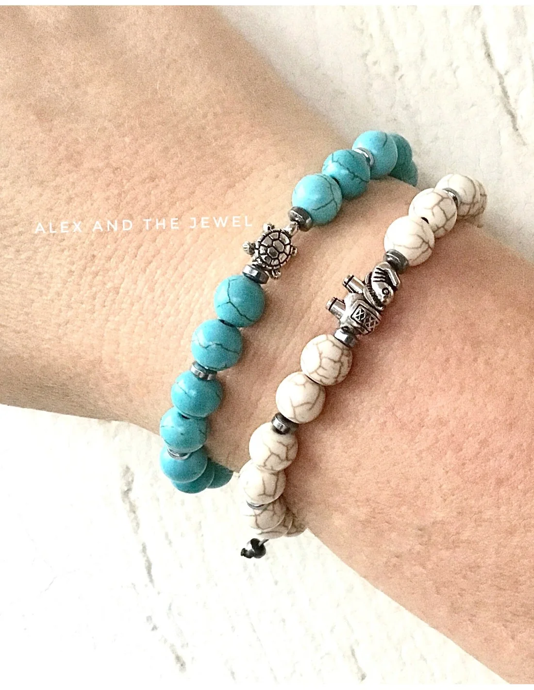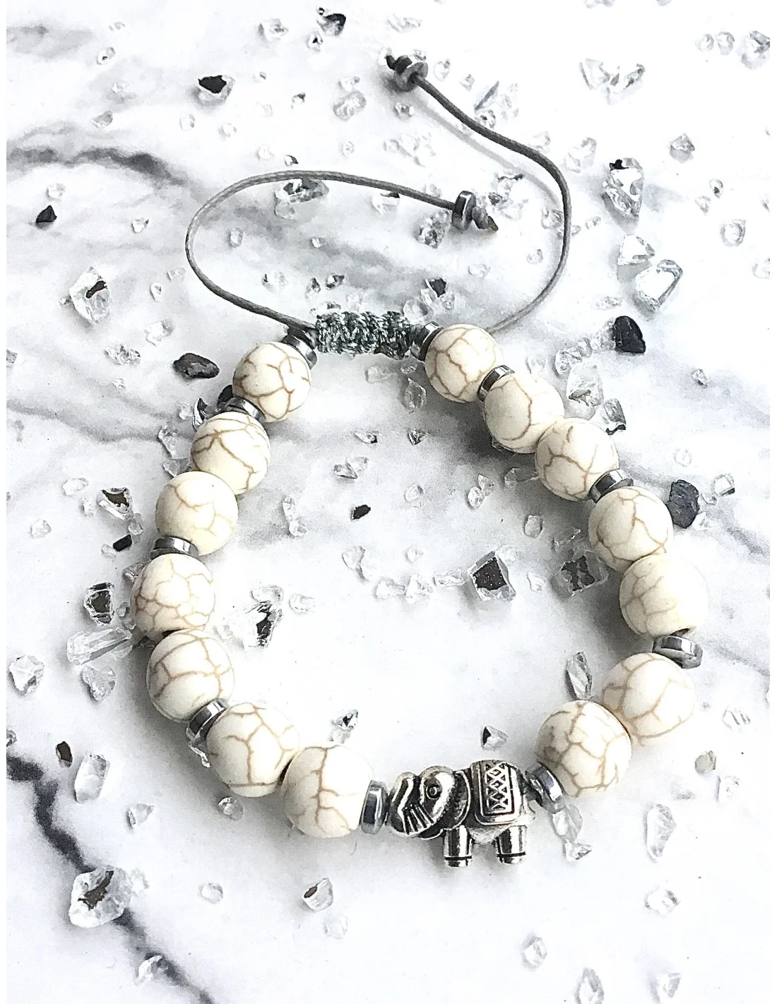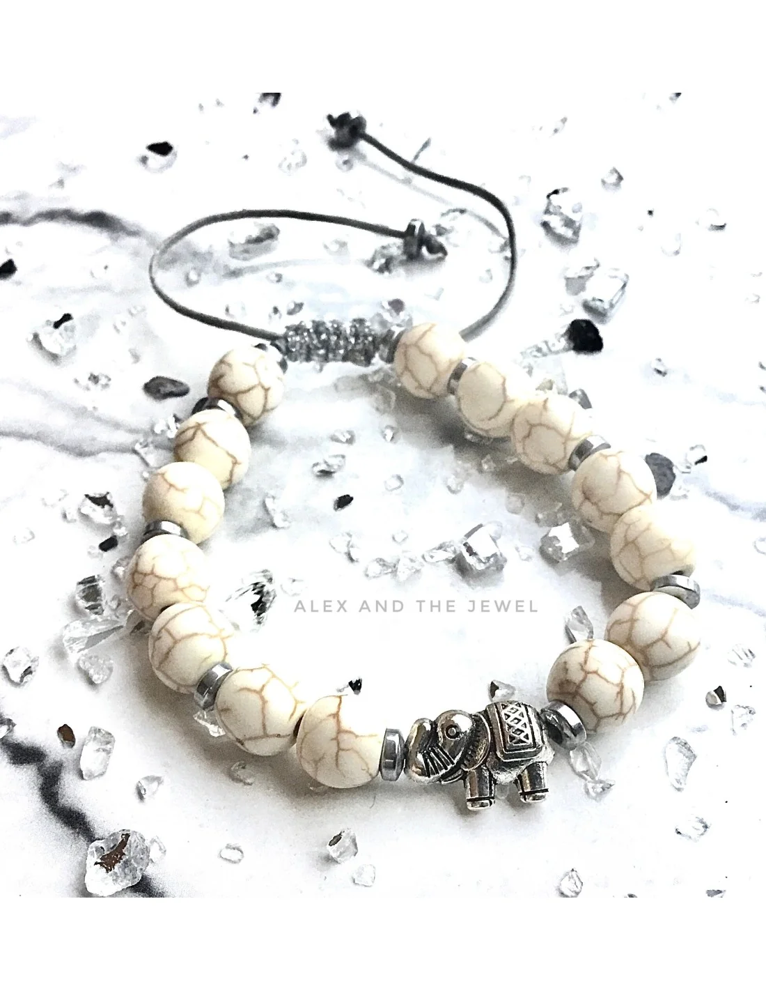Χειροποίητο γυναικείο βραχιόλι με πέτρες Χαολίτη σε λευκό και στοιχείο ελέφαντας Elephant