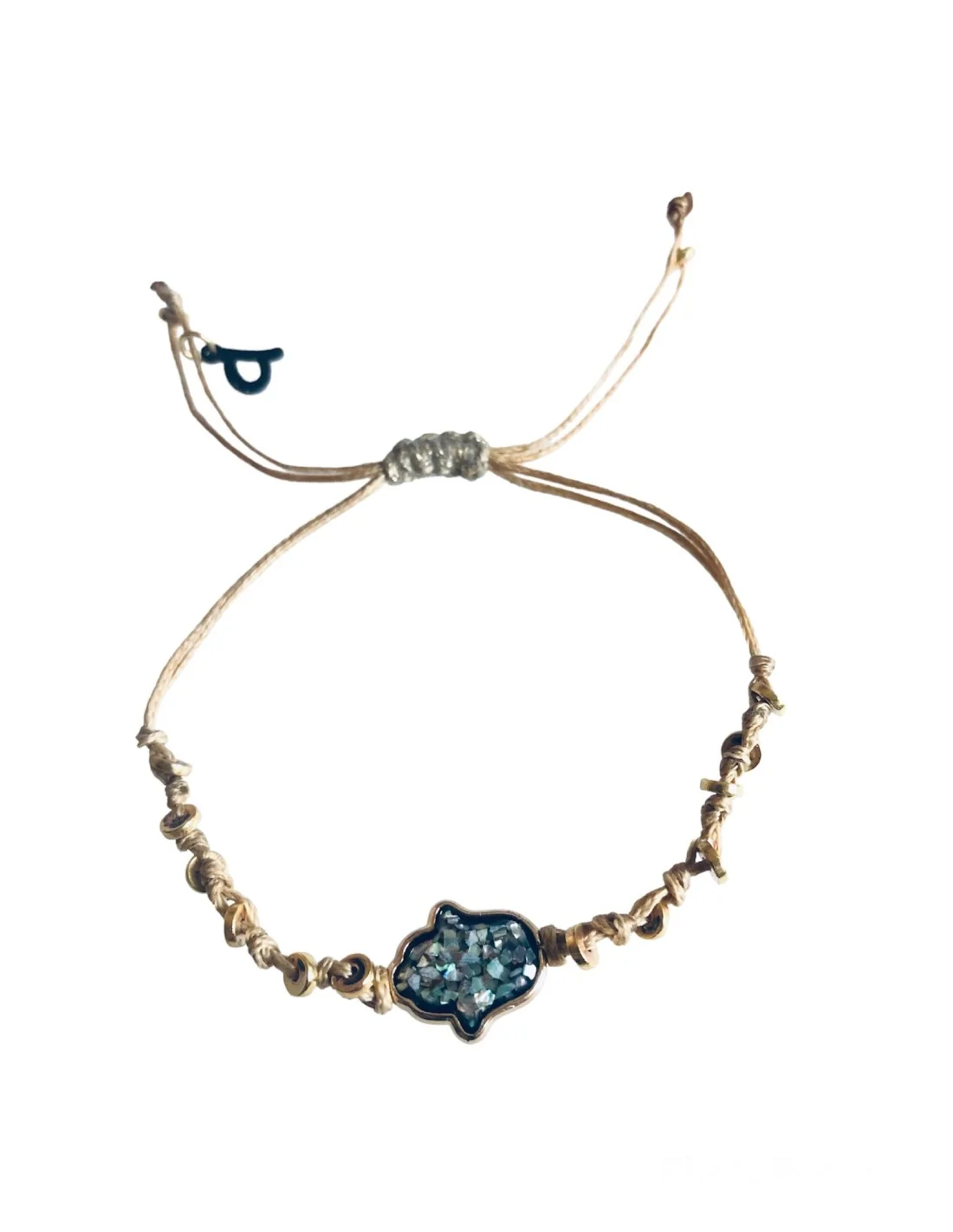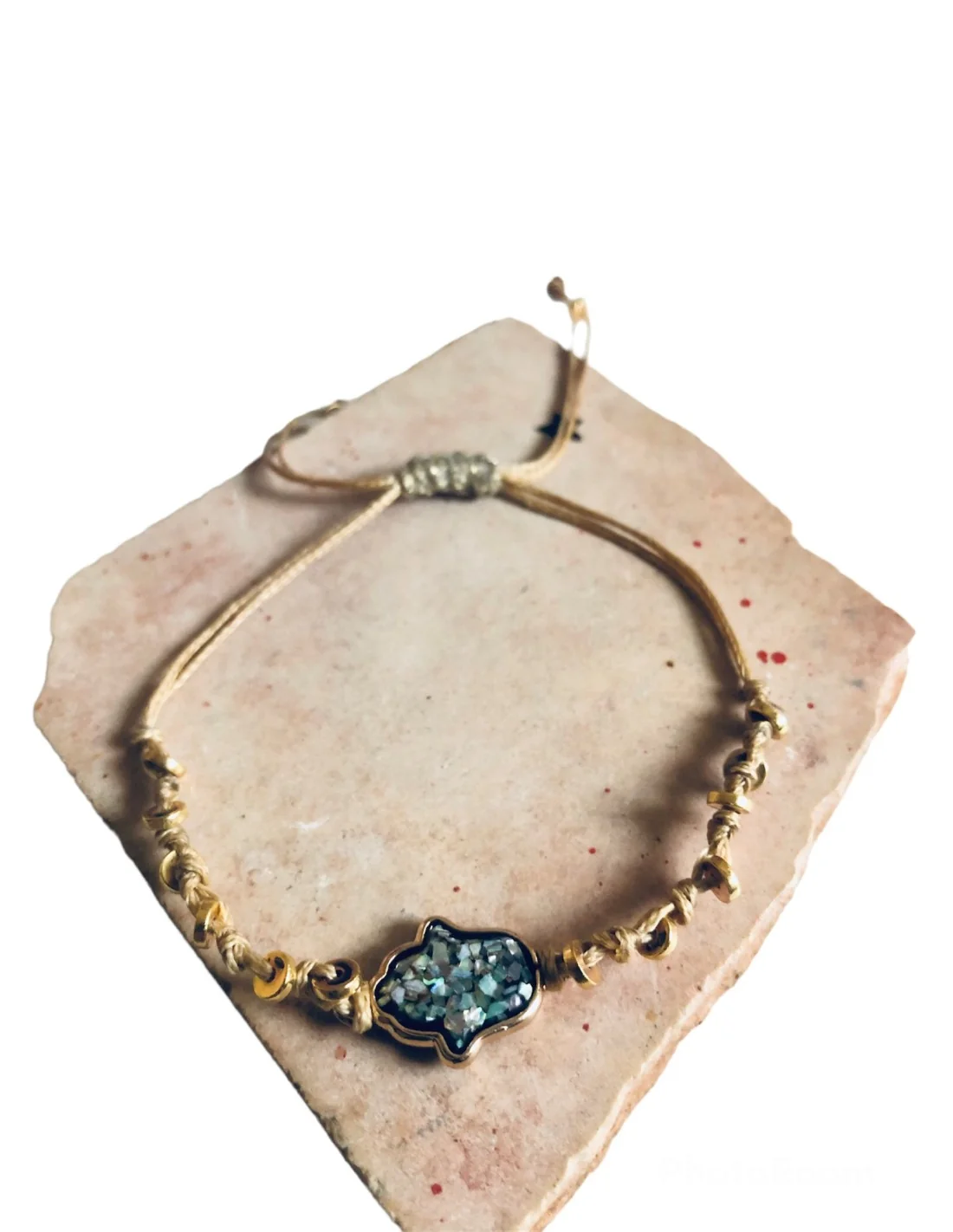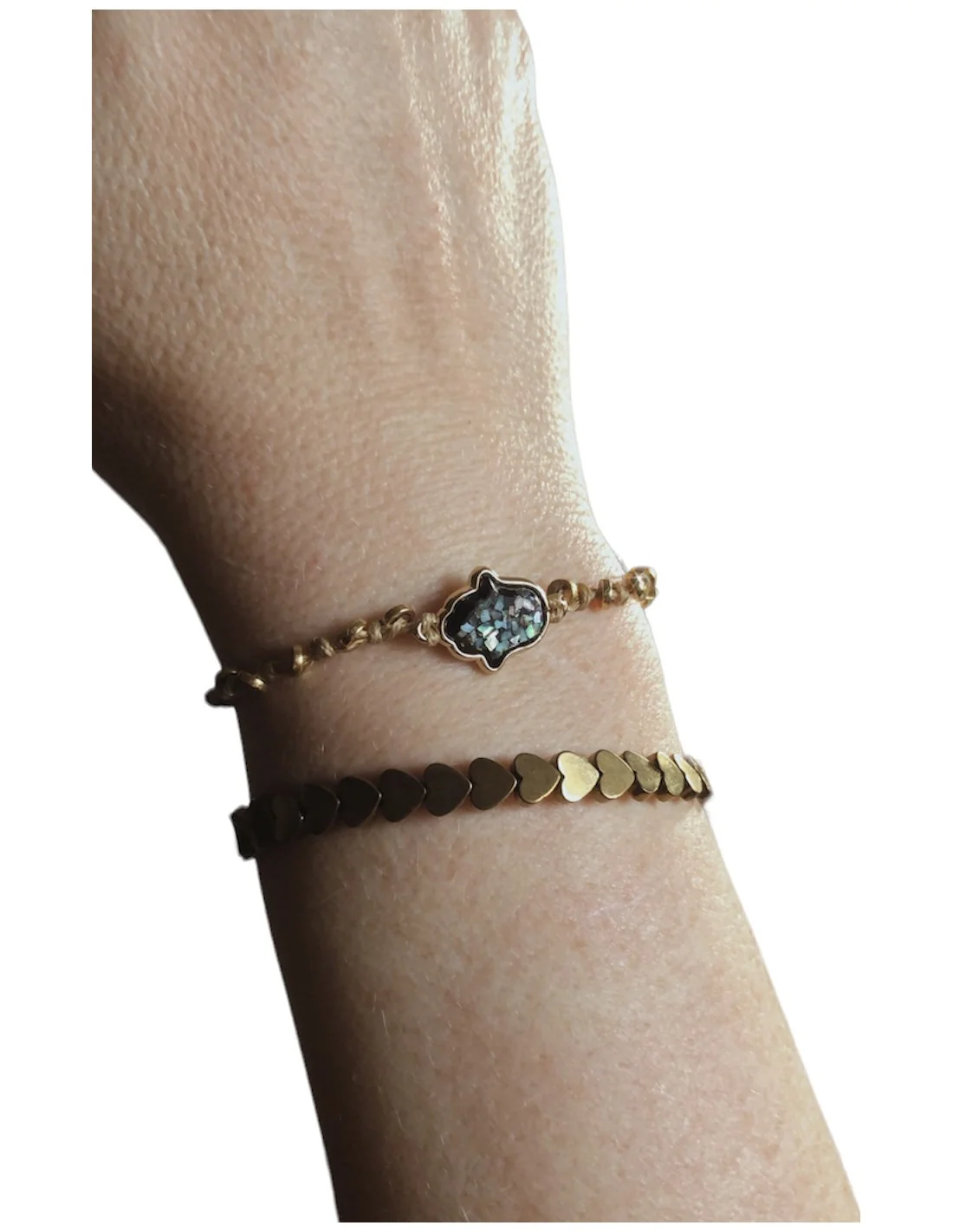 Με άλλα βραχιόλια με σύμβολα προστασίας: Φορέστε το μαζί με άλλα βραχιόλια που έχουν σύμβολα όπως το μάτι ή το σταυρό για ένα συνδυαστικό look που προσφέρει προστασία και στυλ.
